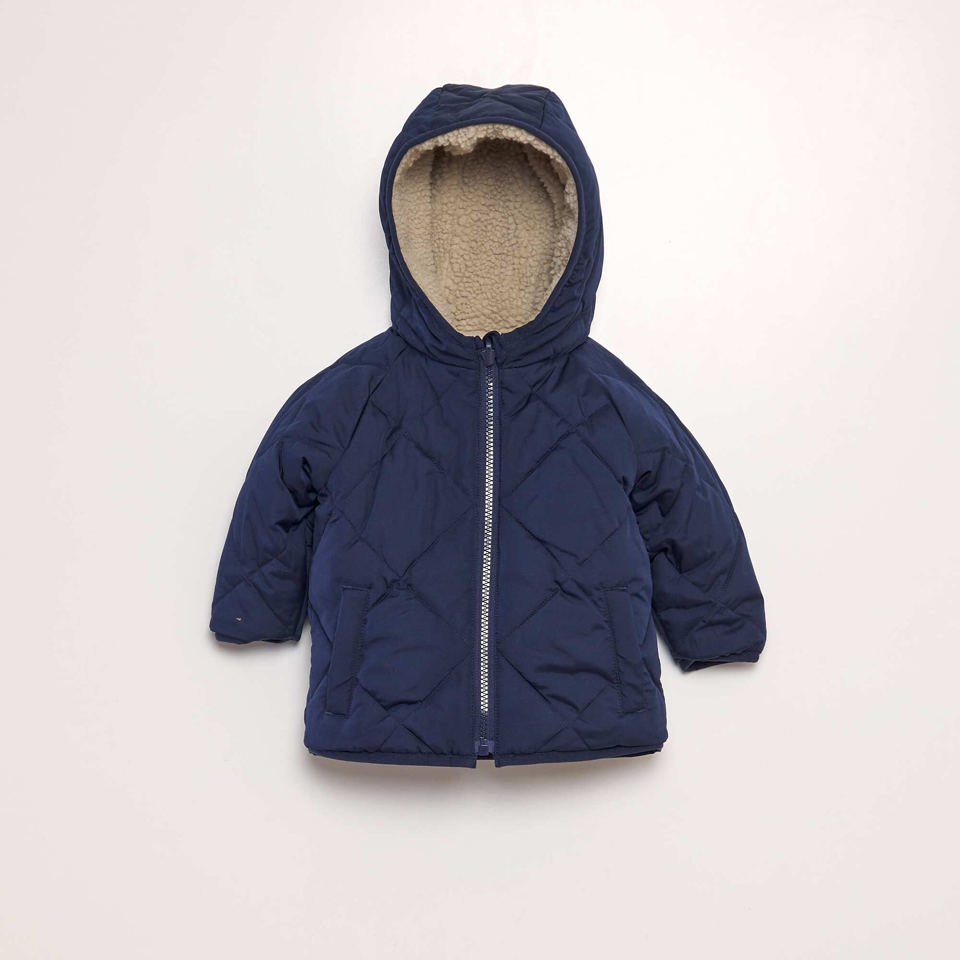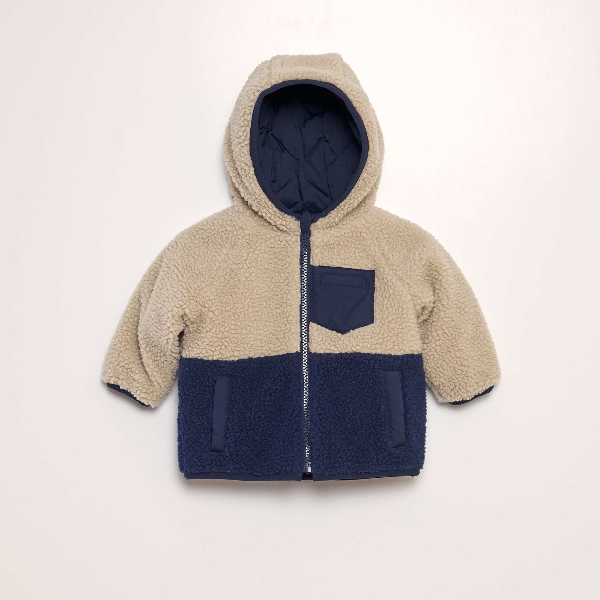 Pour changer de style en un clin d' il tout en tant parfaitement prot g du froid. - Blouson r versible capuche - Un c t en sherpa bicolore avec une poche poitrine zipp e - Un c t matelass d perlant - Ouverture zipp e - 2 poches raglans doubl es en polaire (vraies poches partir de 18 mois) - Poignets lastiqu s