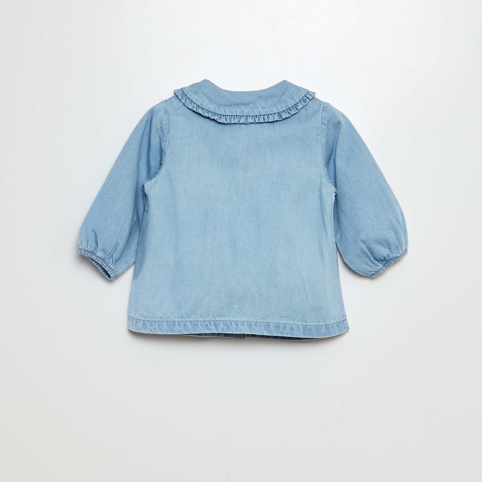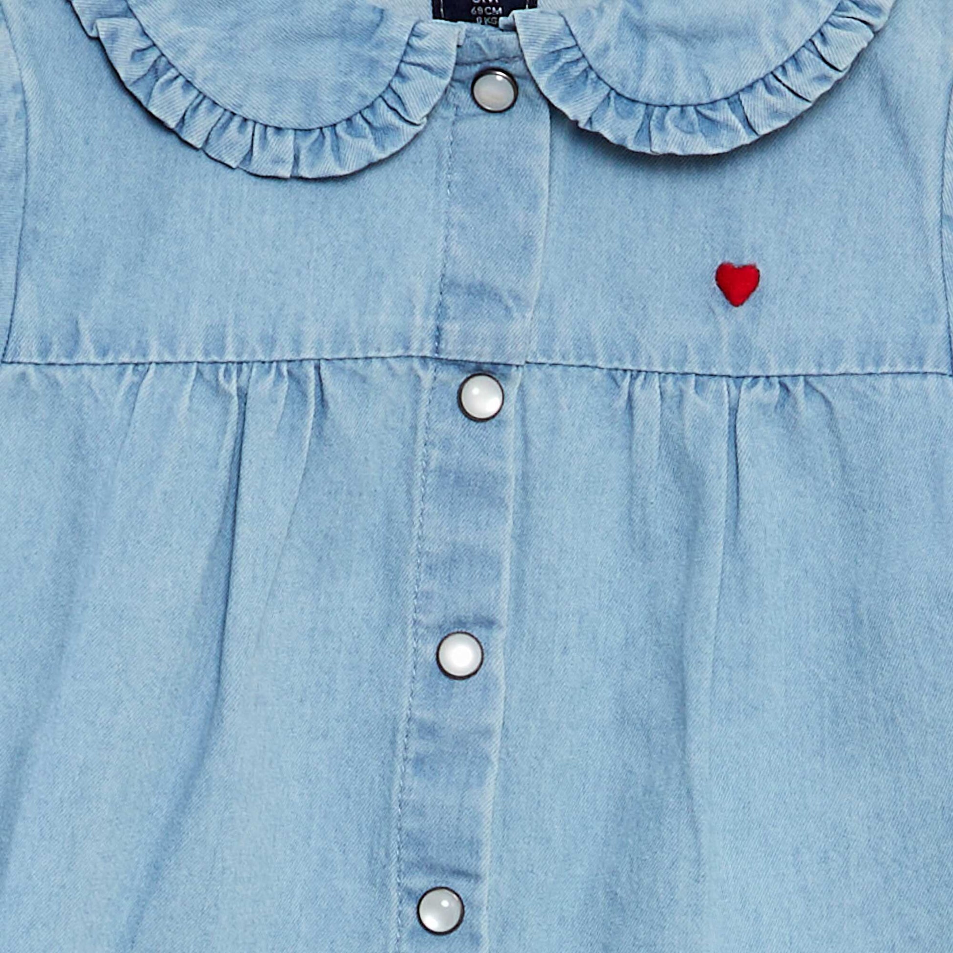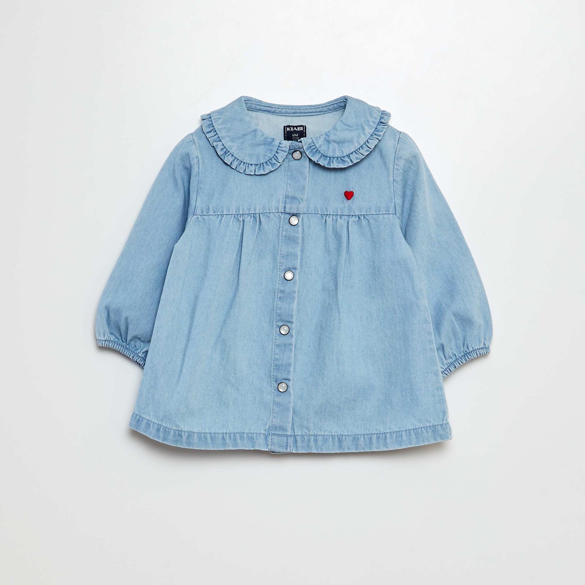 Cette chemise saura parfaitement s'intégrer dans le dressing de votre fille ! - Chemise en denim - Col claudine volanté - Manches longues - Poignets élastiqués - Ouverture pressionnée devant - Broderie cœur à la poitrine