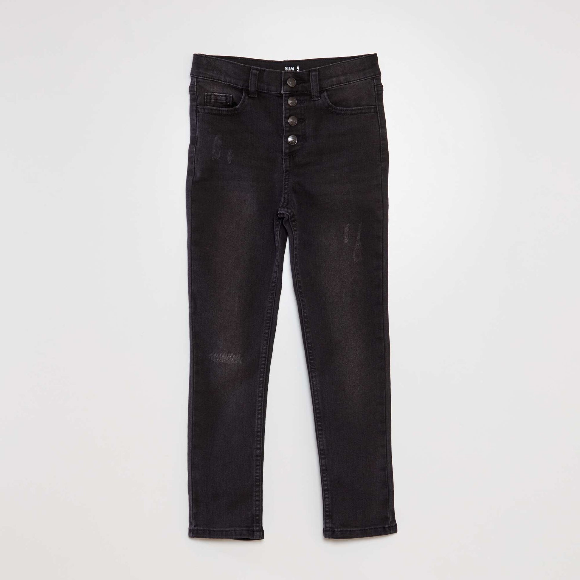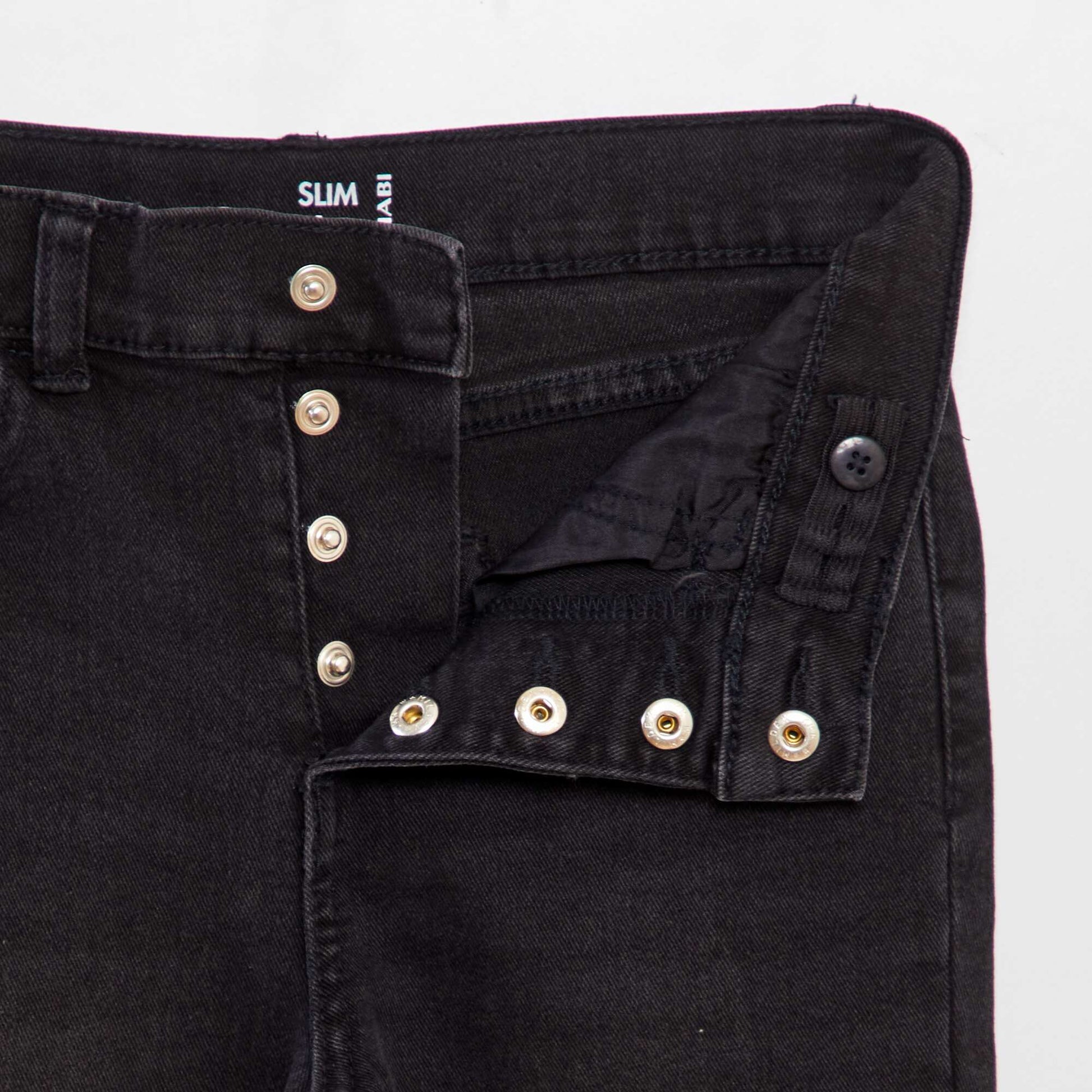Un jean stretch tr s sympa avec ses multiples boutons ! - Jean slim - Mati re stretch - Taille haute - Ajustable de l'int rieur - Ouverture pressions - 5 poches - Passants pour ceinture