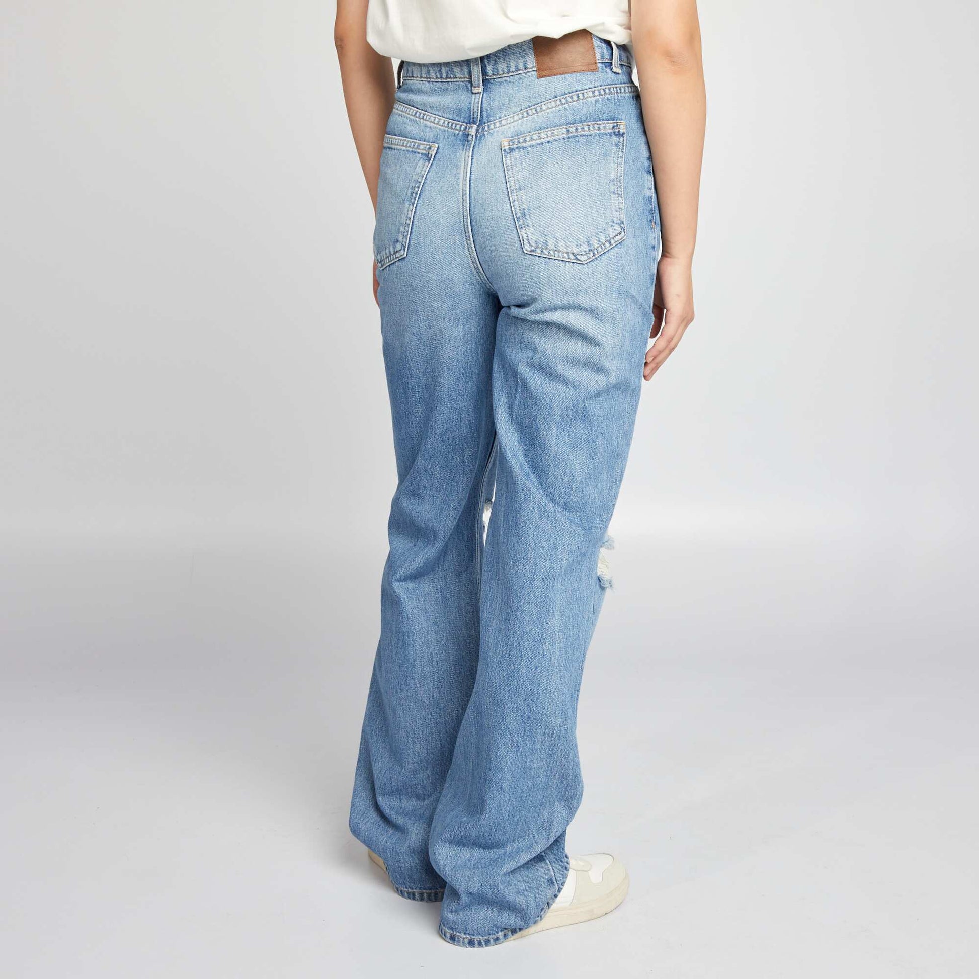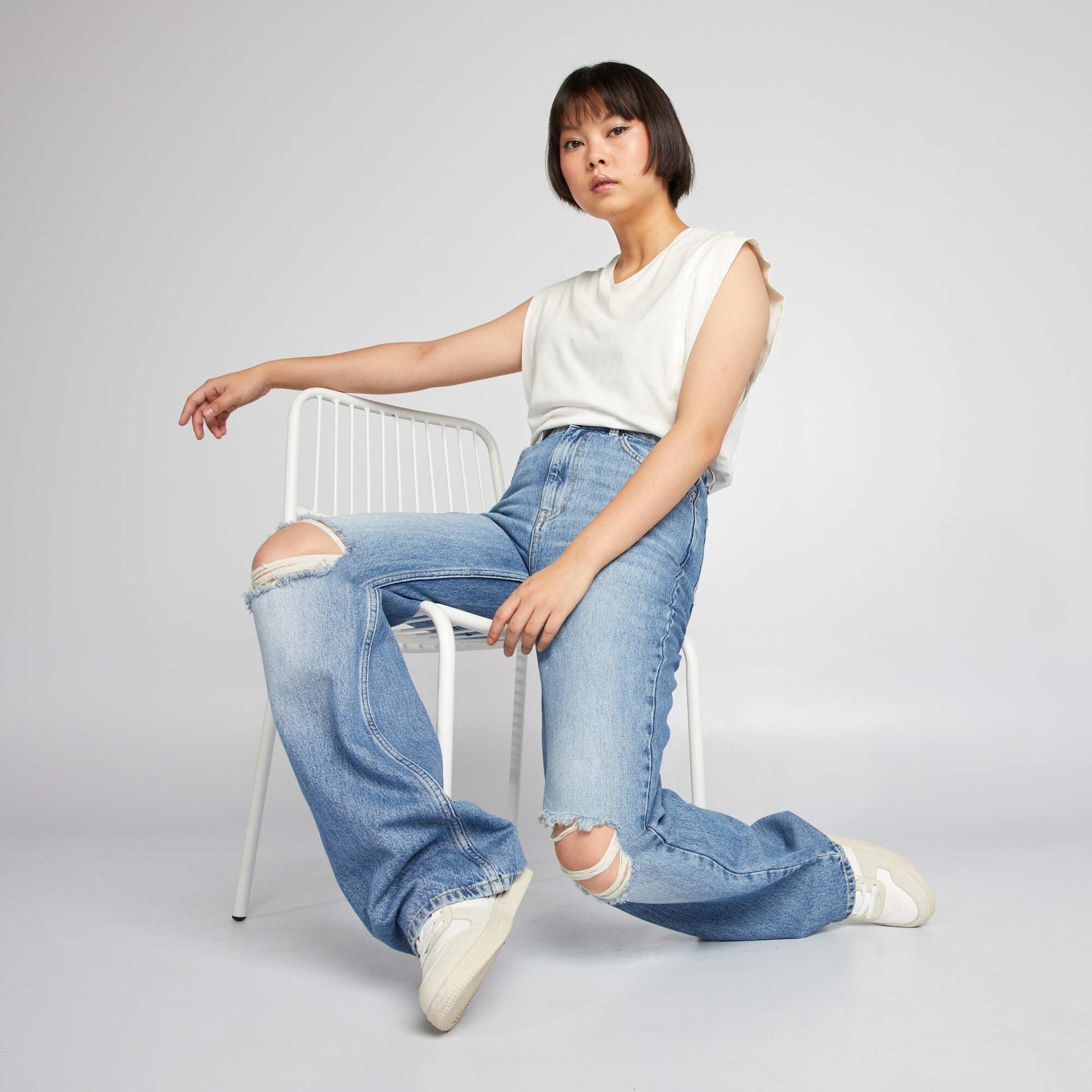 Le jean wild leg est une pi ce phare de la garde-robe. - Pantalon large - Coupe wild leg - Ouverture zipp e + bouton - Passants pour ceinture - 2 poches l'avant + 1 poche ticket - 2 poches au dos - Destroy aux genoux - Notre mannequin porte une taille 36 et mesure 1m70