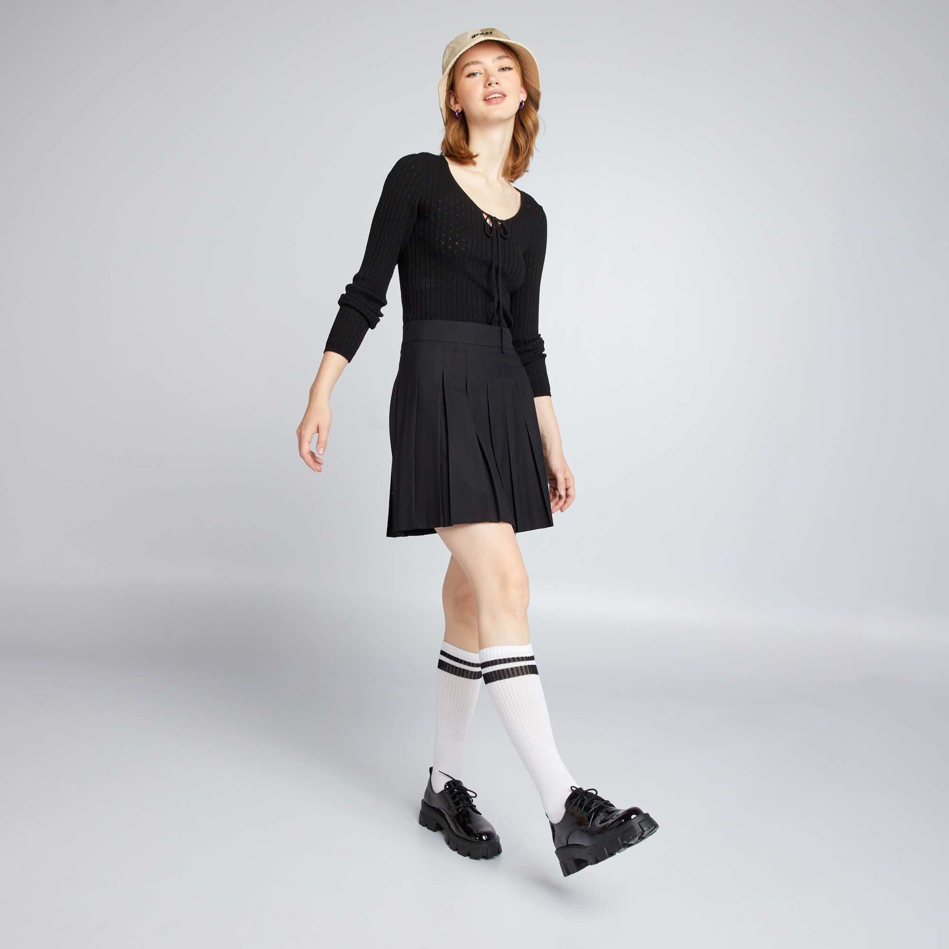 Une jupe aux allures d'uniforme d' cole ! - Jupe courte - Mod le pliss - Mati re stretch - Ouverture boutonn e et zipp e sur le c t - Longueur dos : 44 cm environ - Notre mannequin porte une taille 36 et mesure 1m75