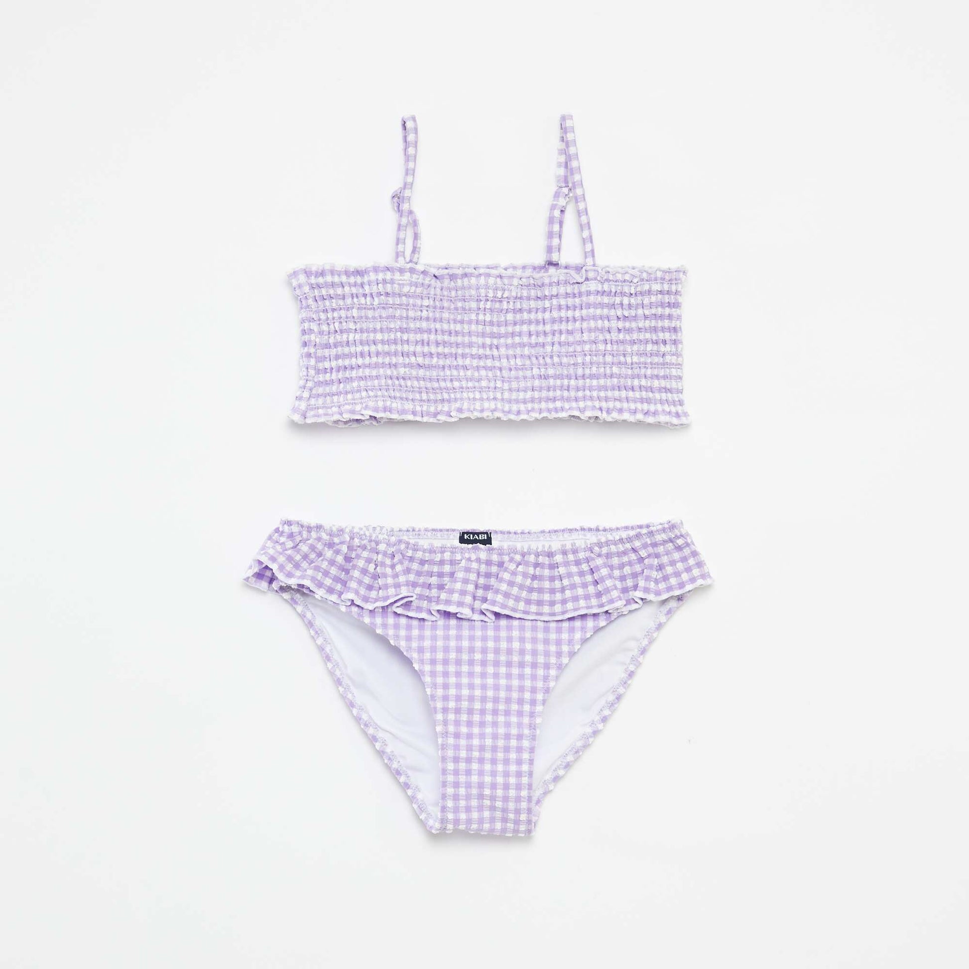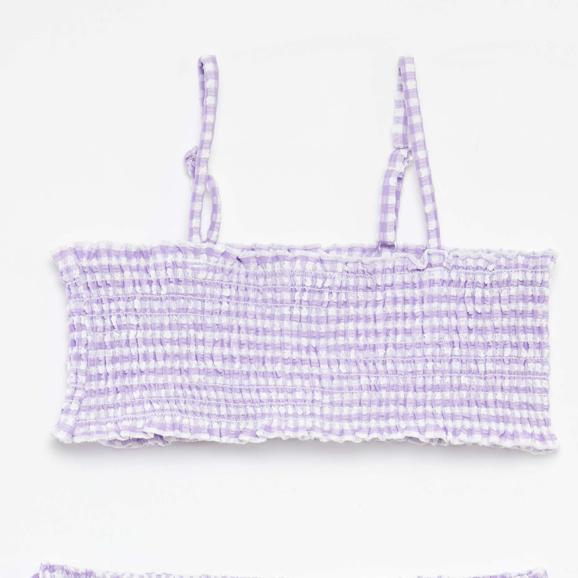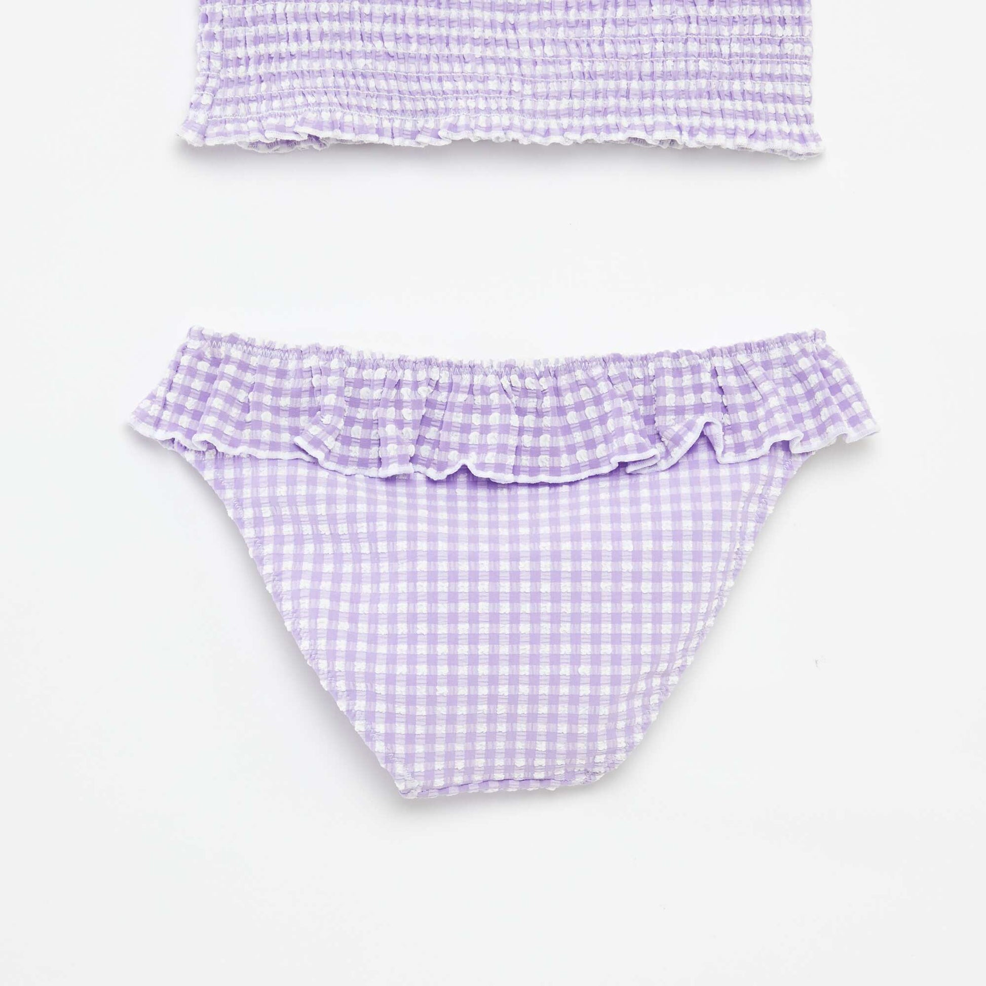 Un nouveau maillot de bain pour cet été ! - Brassière en seersucker - Doublée - Fines bretelles réglables - Imprimé vichy all-over - Culotte de bain assortie - Taille élastiquée avec volants - Doublée