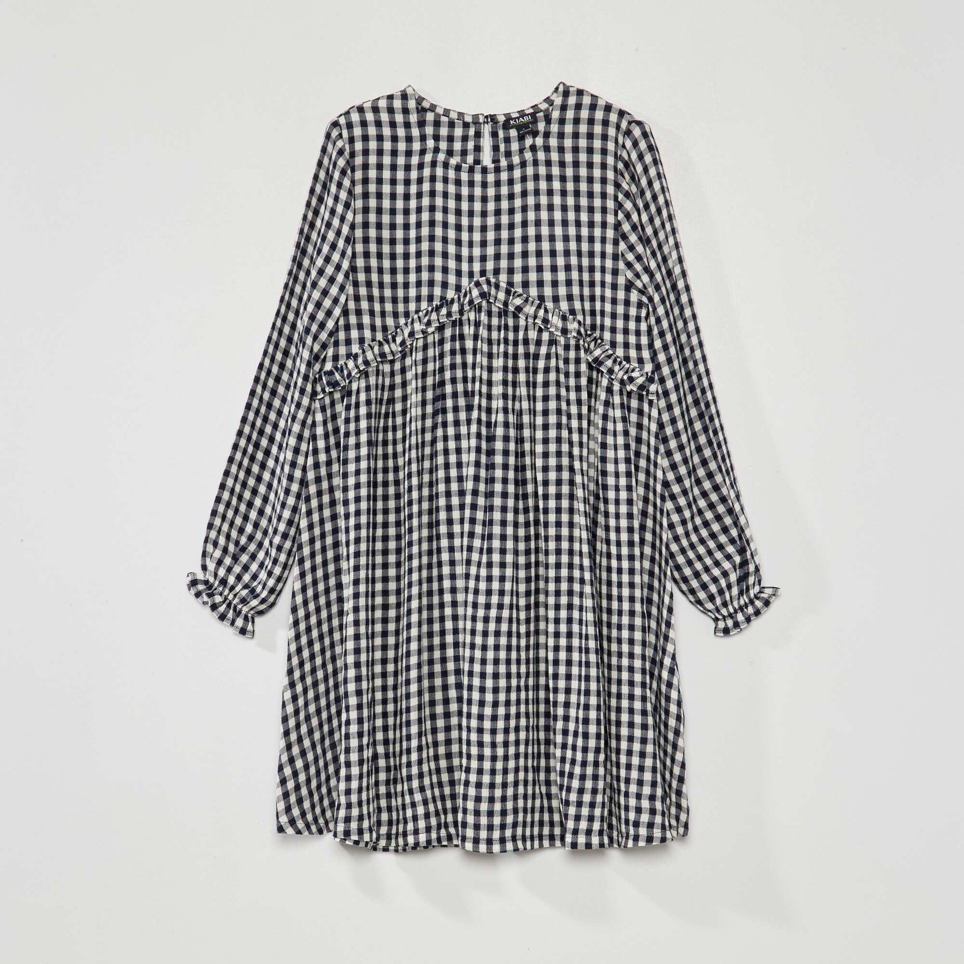 Pour une tenue moderne et printani re optez pour cette robe fluide et l g re ! - Robe fluide - Col rond - Manches longues - Taille lastiqu e - Ouverture goutte d'eau au dos - Empi cement volant devant - Imprim 'vichy' all-over