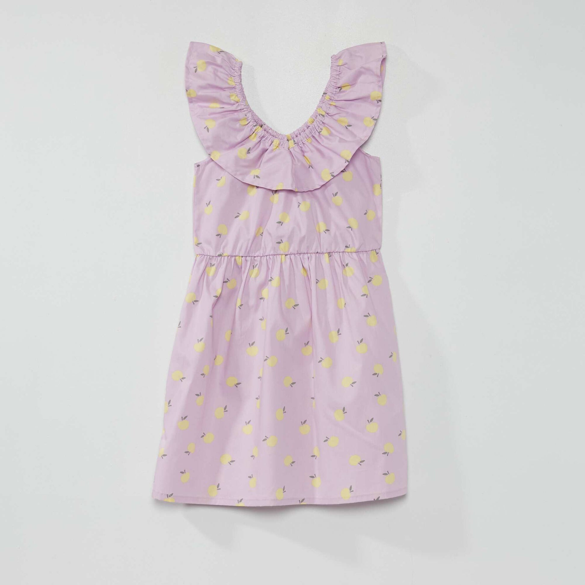 Une belle série de robes colorées ! - Robe pur coton - Coupe longue / évasée - Col bardot - Sans manches - Taille élastiquée - Large volant au col - Imprimé 'pommes' all over
