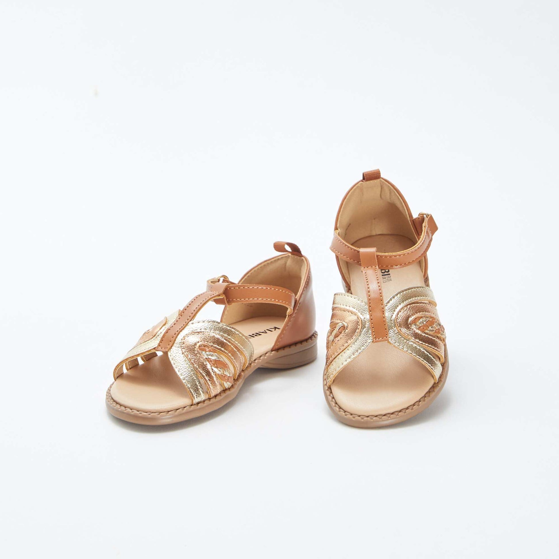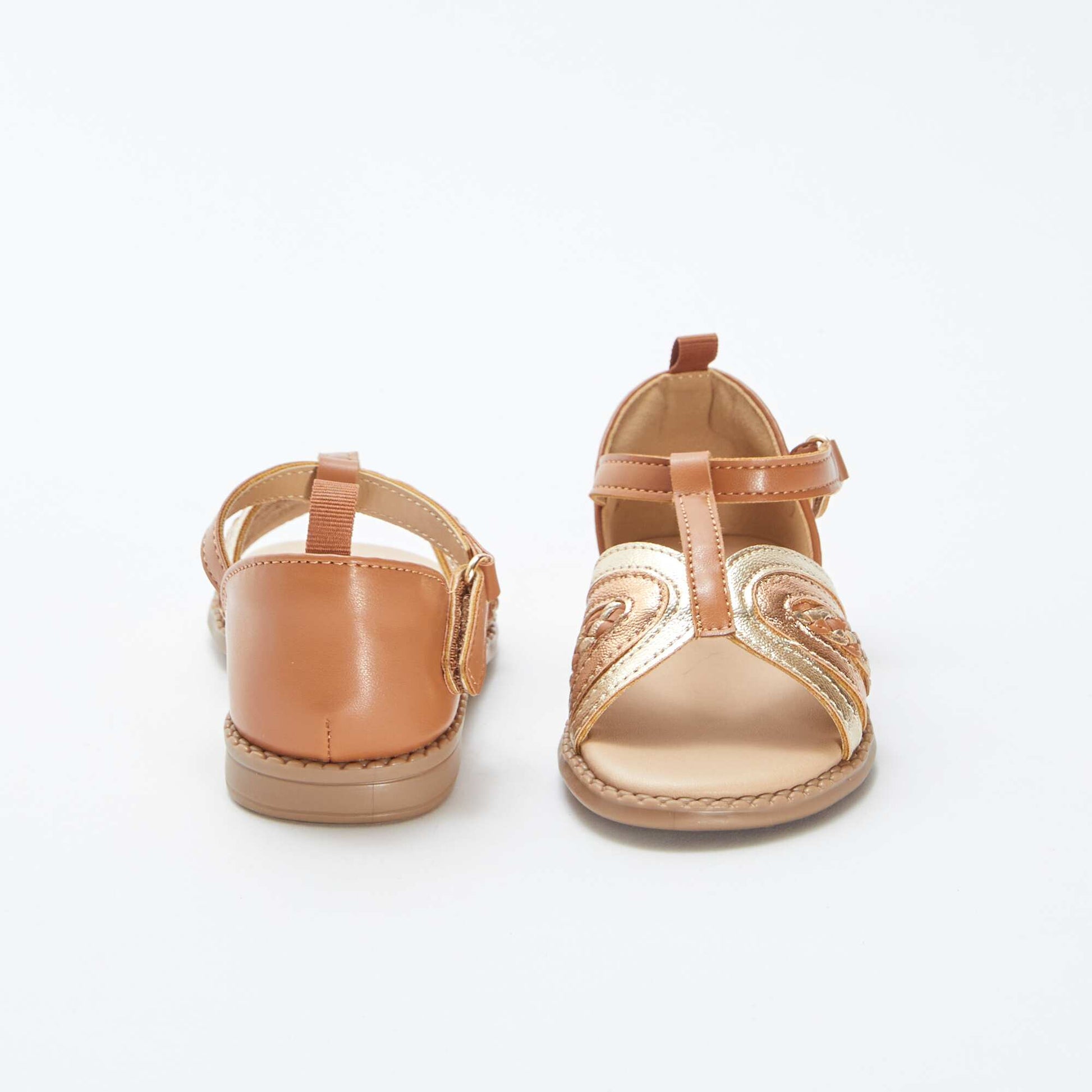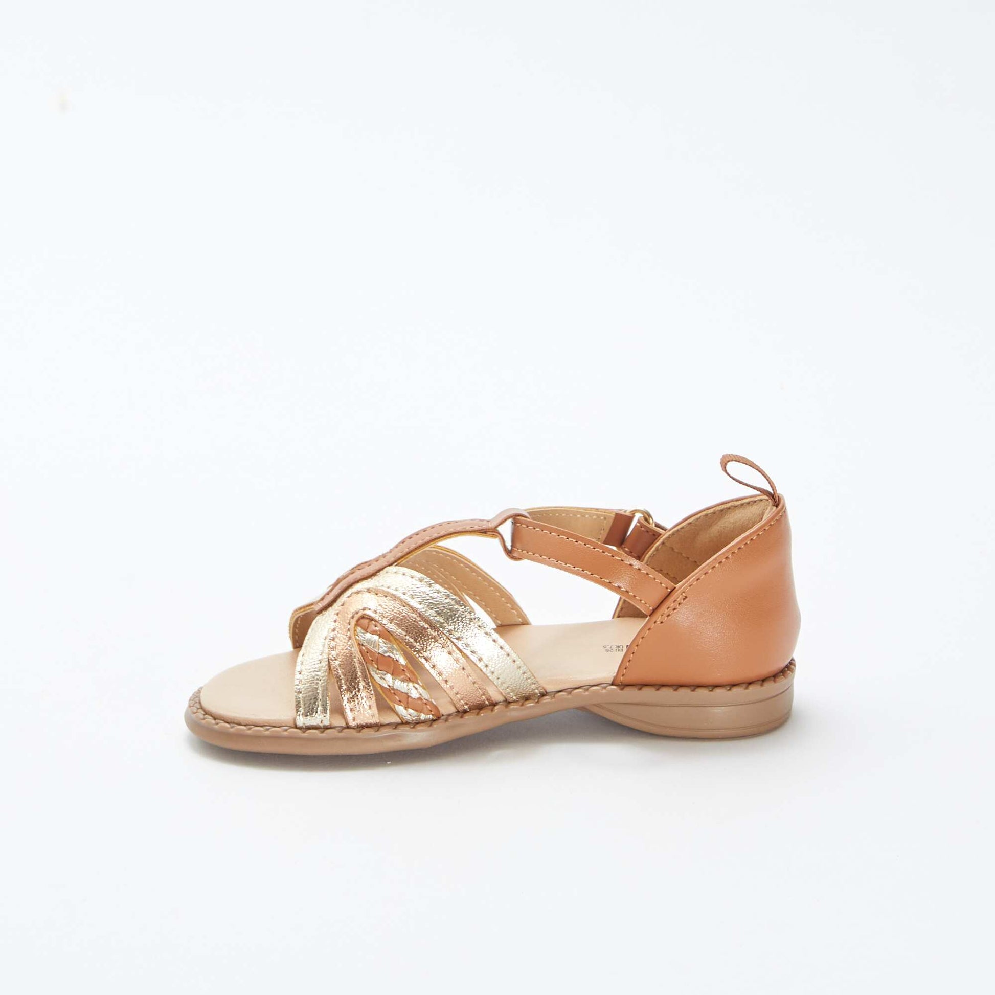 Une très belle paire de sandales cuivrées et dorées ! - Sandales dorées et cuivrées - Multi-brides - Bride à scratch - Talon fermé - Semelle en simili - Bord texturé