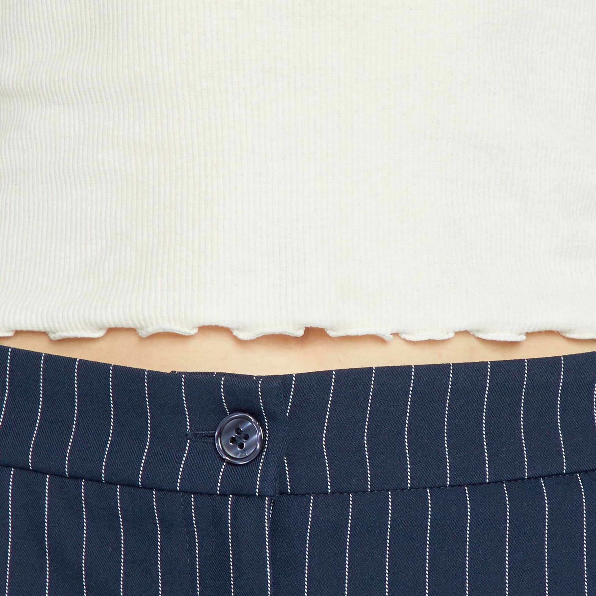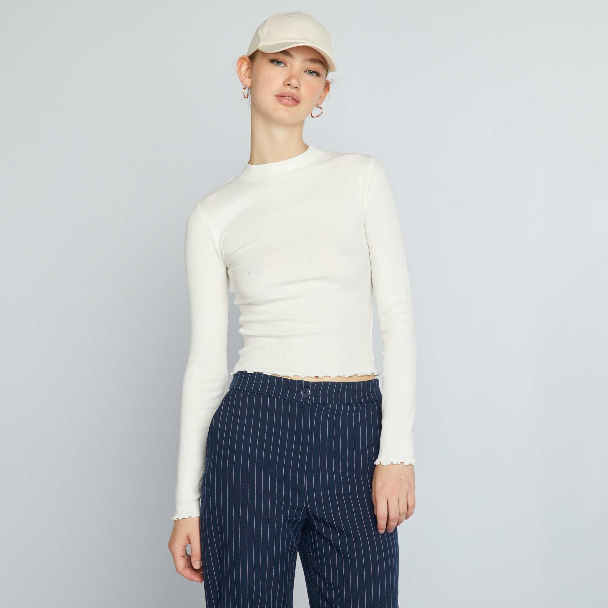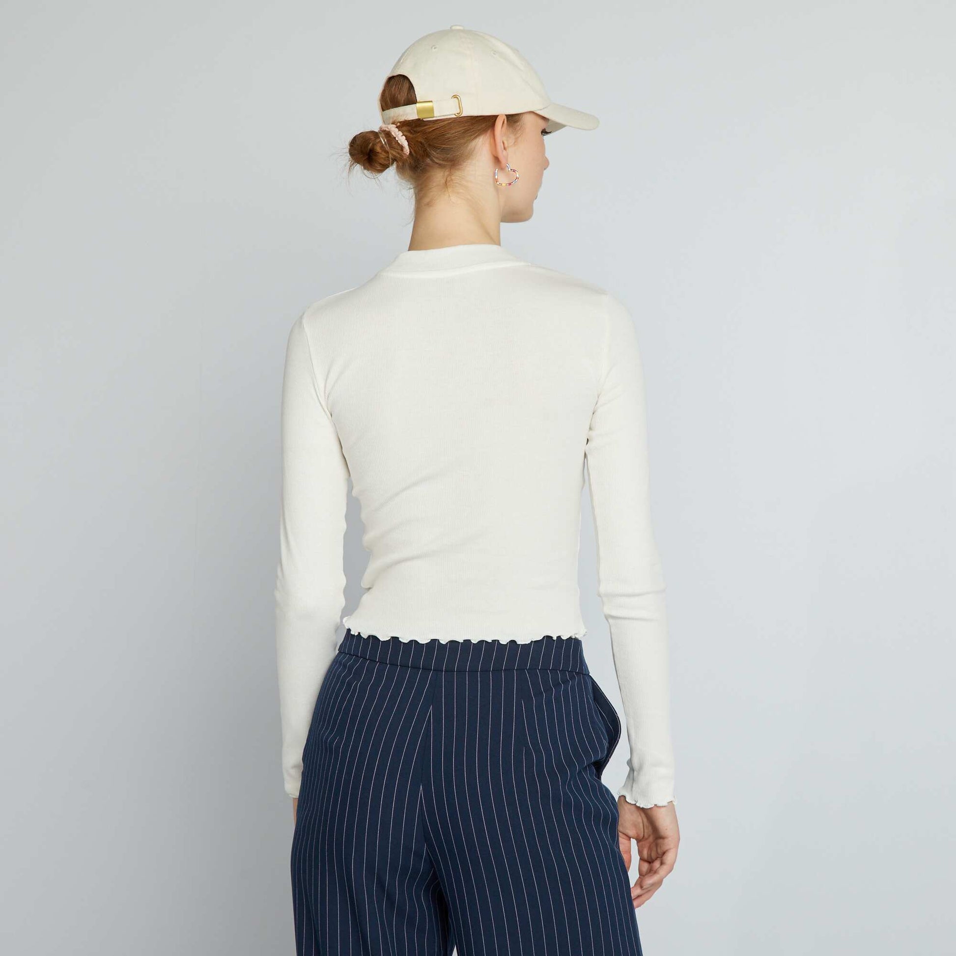 Parfait pour changer de look ! Un tee-shirt original avec un col montant et une base volant e ,-) - T-shirt en maille c tel e - Mati re stretch - Col rond montant - Manches longues - Base volant e - Couleur unie - Notre mannequin porte une taille S et mesure 1m73