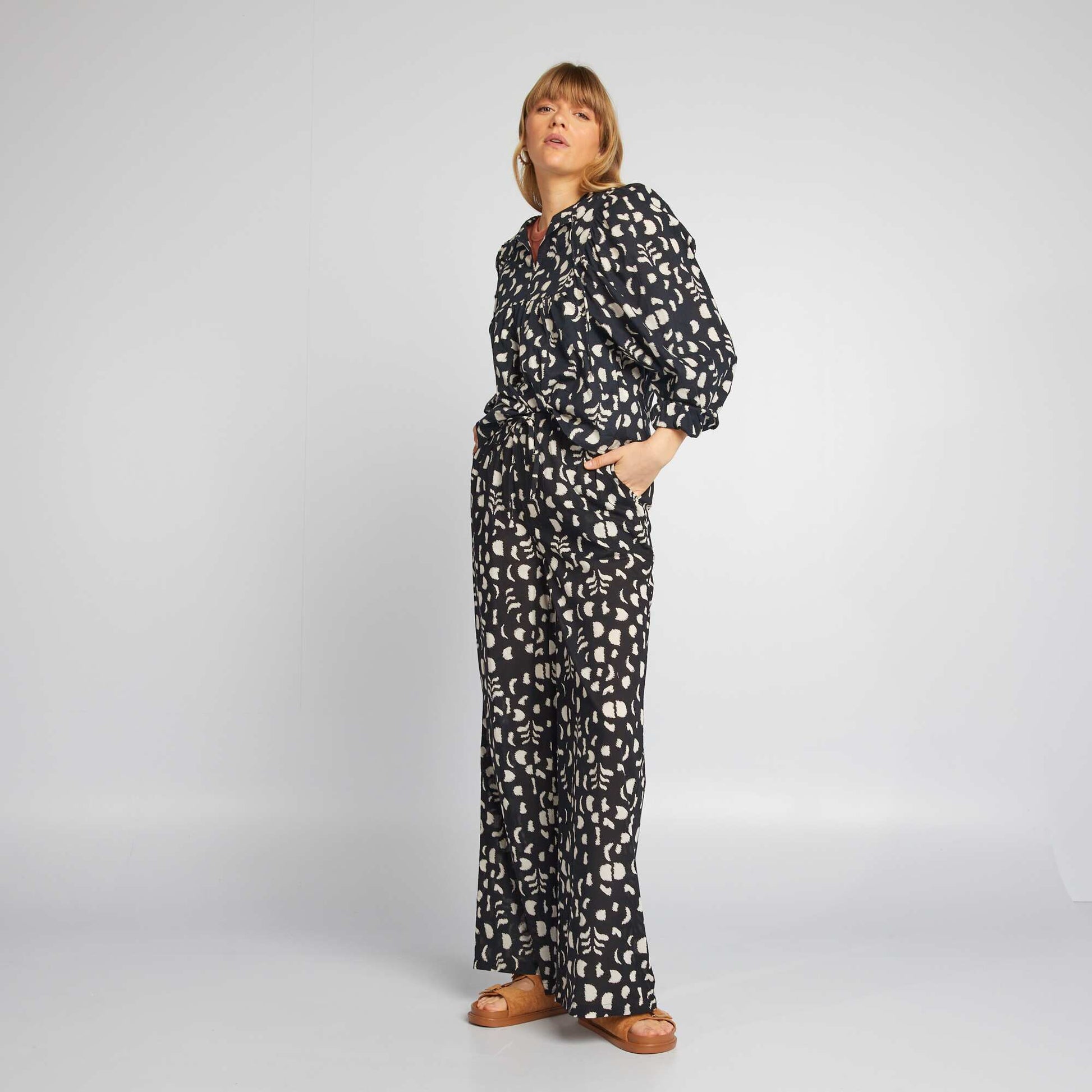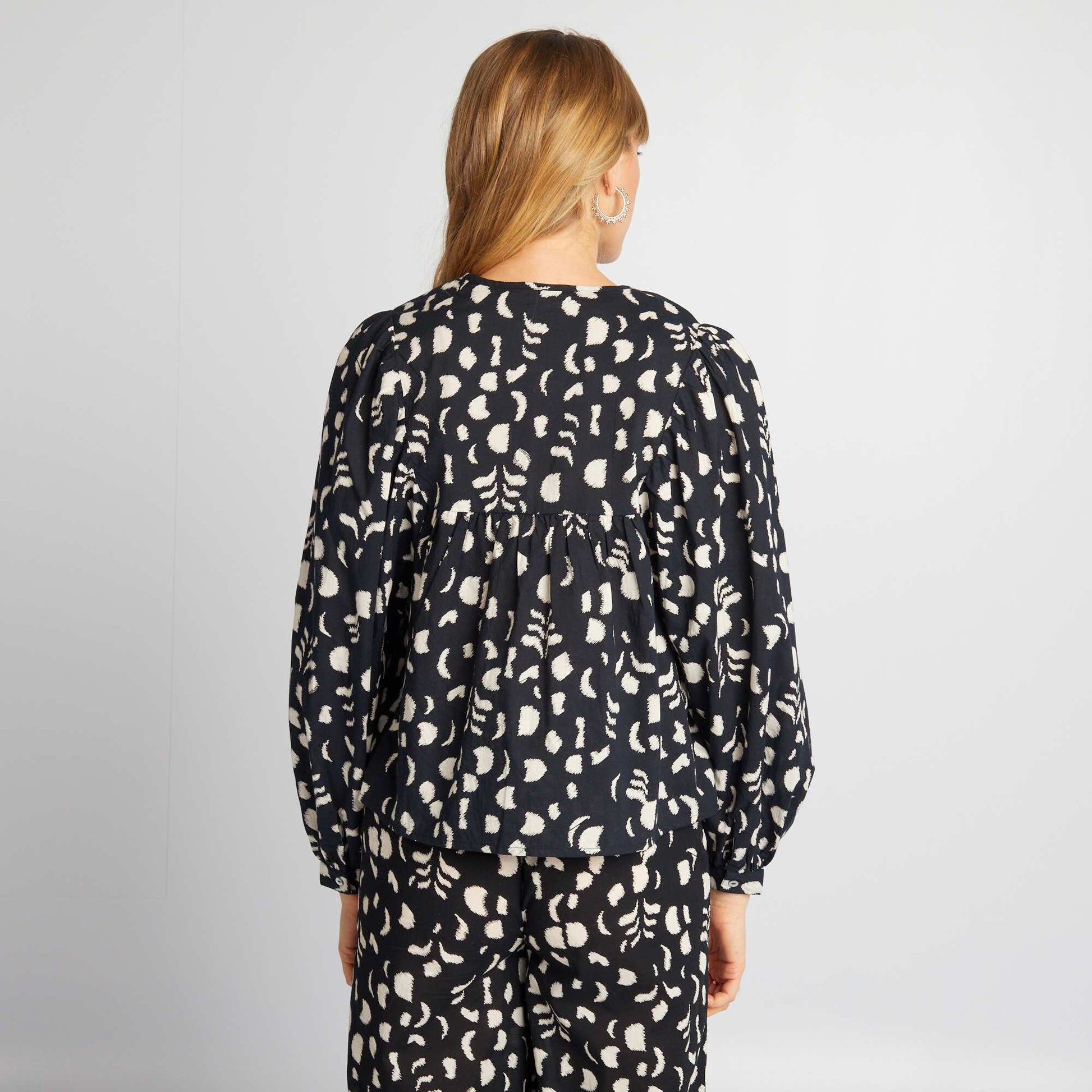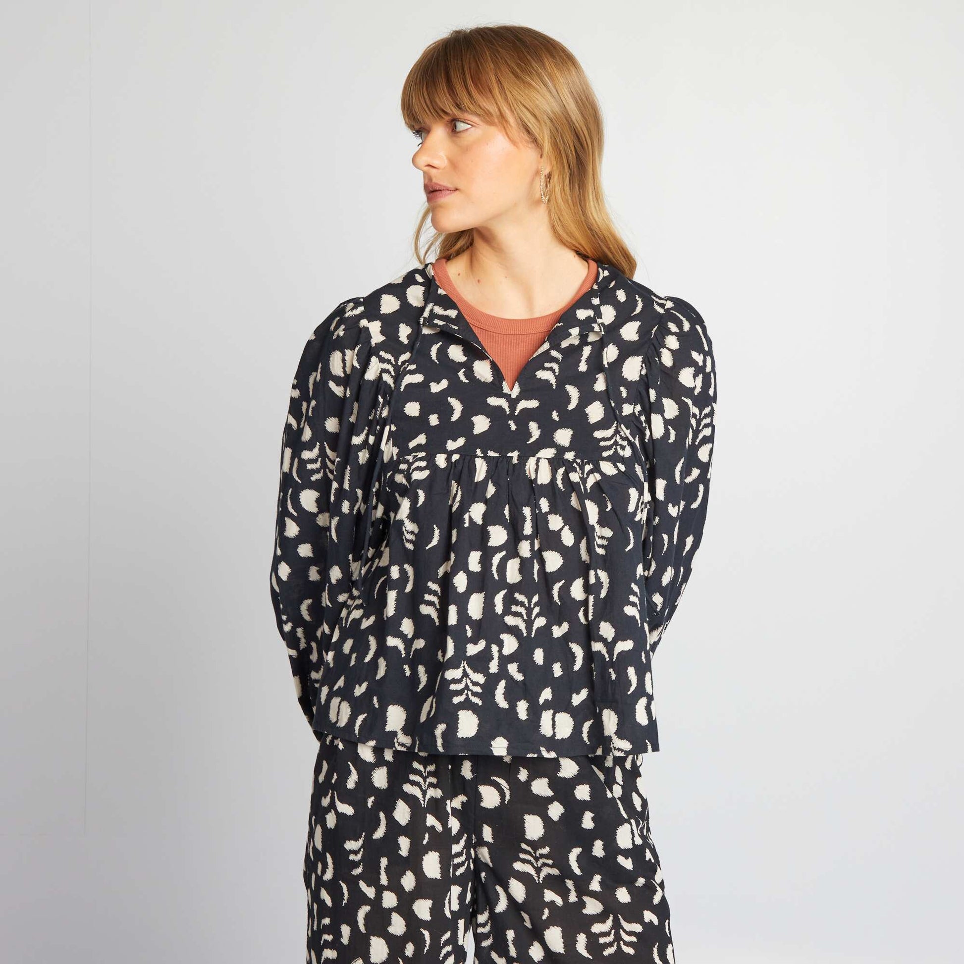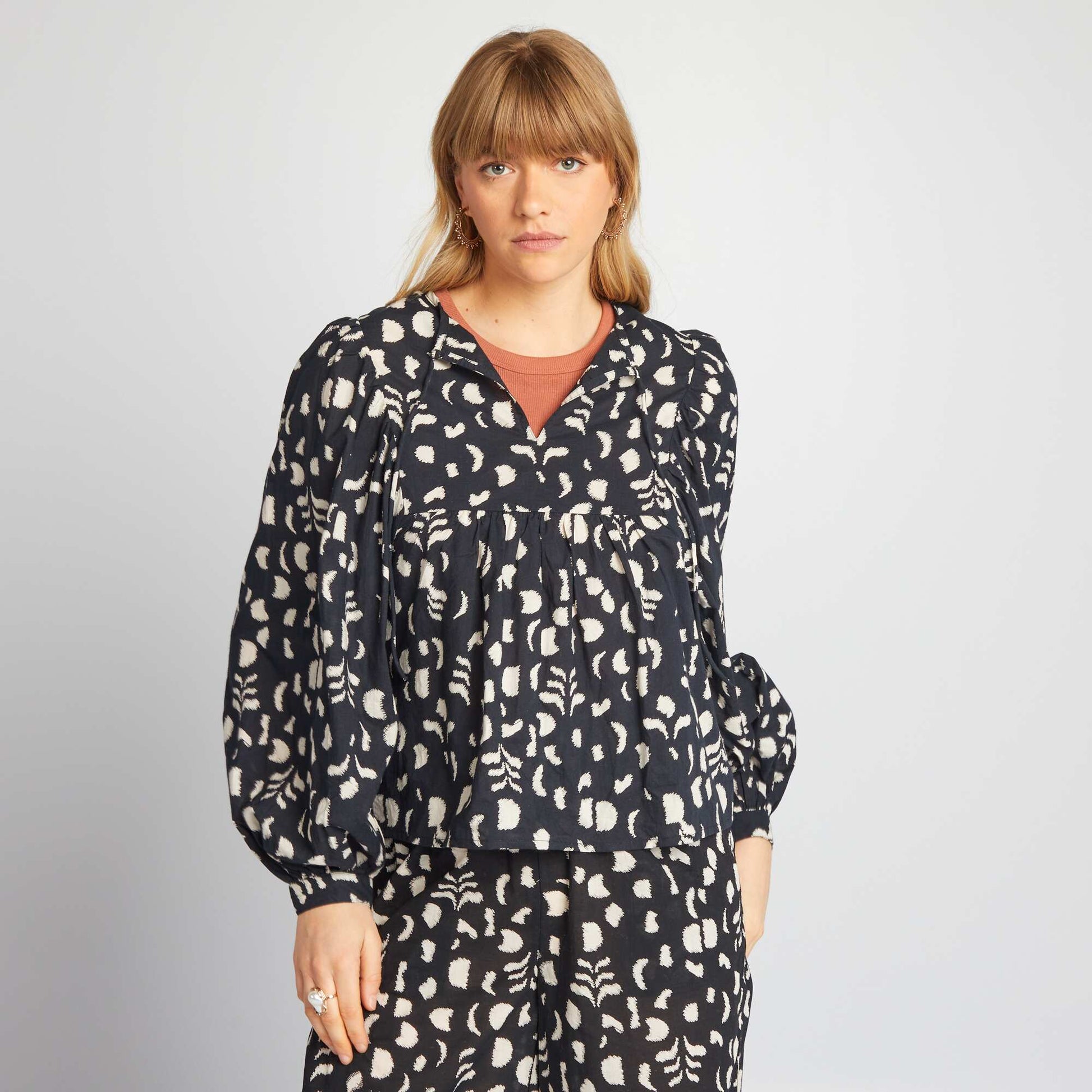 Conseil mode : associez cette blouse avec le pantalon assorti (r f : BMX09, sous r serve de disponibilit ). Pour un total look imprim et frais ! - Blouse en voile de coton - Col nouer - Manches bouffantes - Poignets resserr s - Coupe large - Imprim fantaisie all-over - Longueur du dos : 58 cm - Notre mannequin porte une taille S et mesure 1m75
