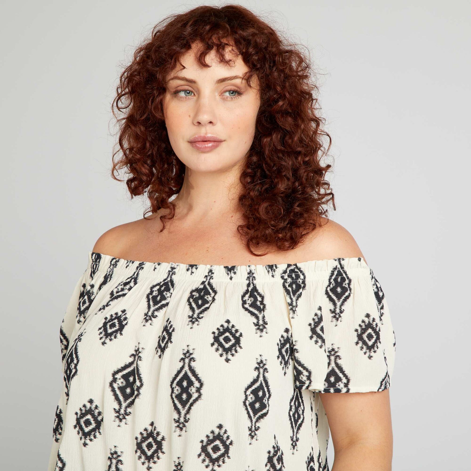 Sa coupe flatteuse et ses d tails l gants ajoutent une touche d'audace votre tenue. - Blouse fantaisie emmanchures bardot - Mati re fluide - Col lastiqu - Manches courtes volantes - Imprim all-over - Longueur du dos : 75 cm - Notre mannequin porte une taille XL et mesure 1m80