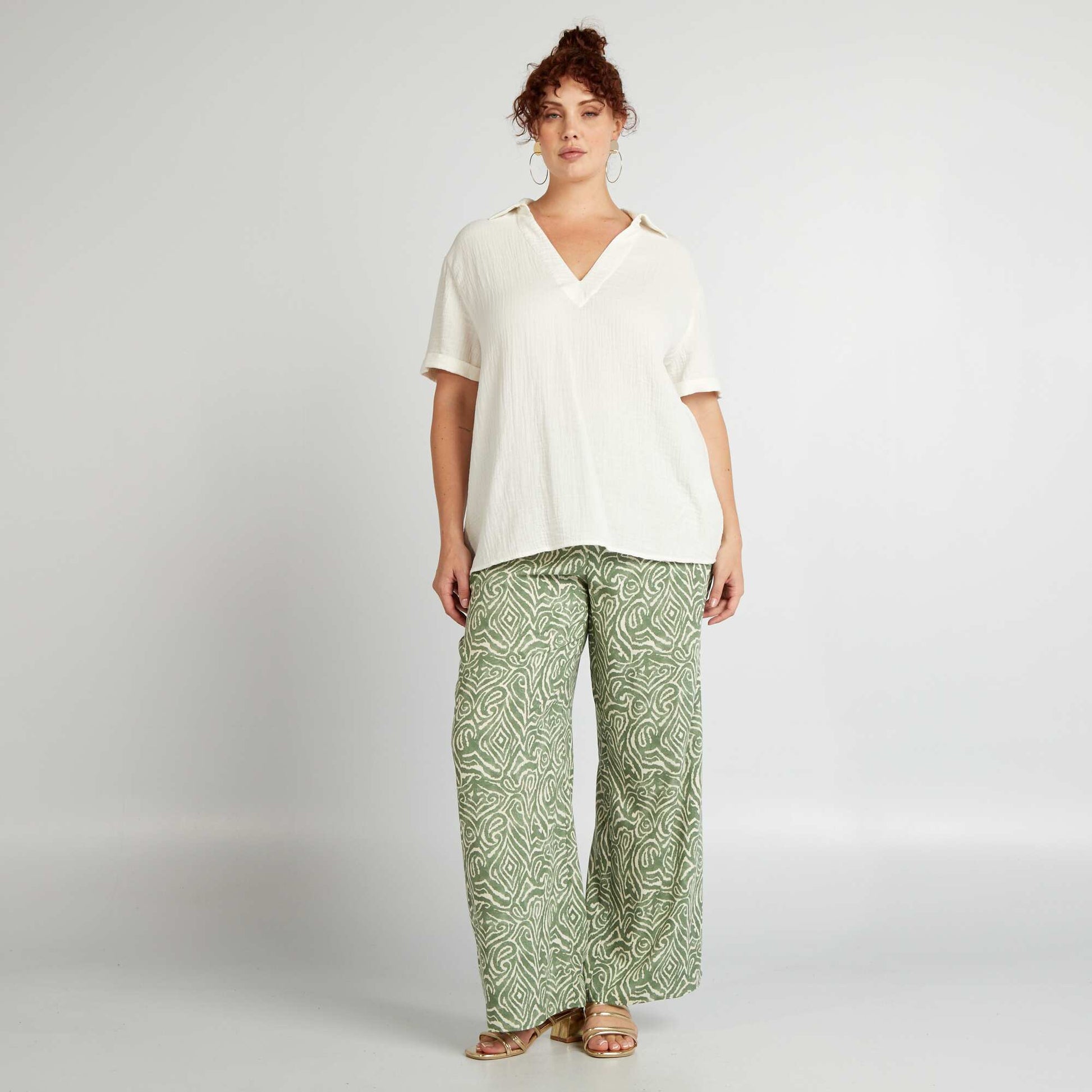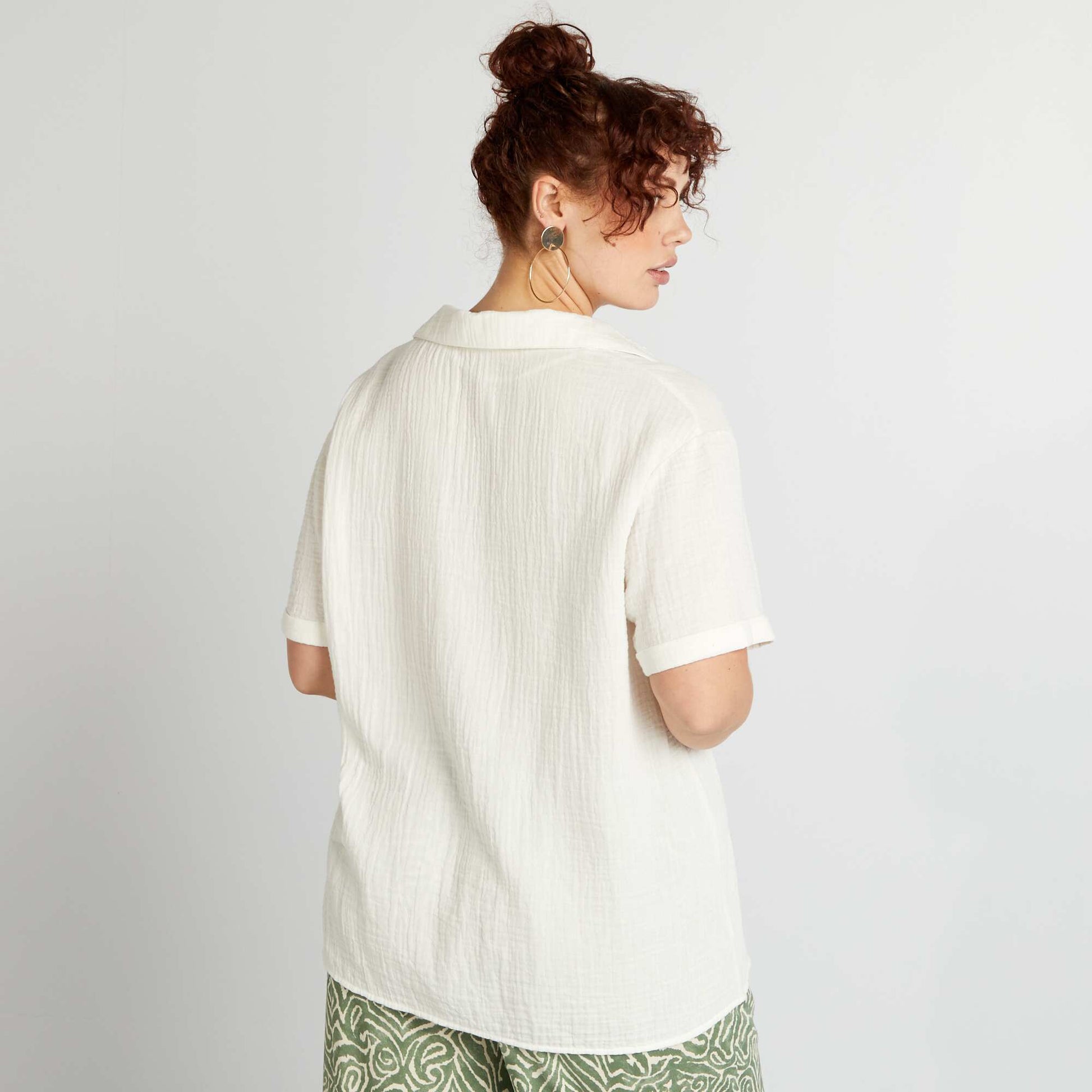 Sa texture douce et a rienne vous enveloppe dans un nuage de bien- tre, tandis que son design pur vous permet de cr er des looks aussi raffin s que d contract s en toute simplicit . - Blouse unie - En double gaze de coton (parfaitement opaque) - Col V pointes libres - Manches courtes avec revers cousus - Longueur du dos : 74 cm - Notre mannequin porte une taille XL et mesure 1m80