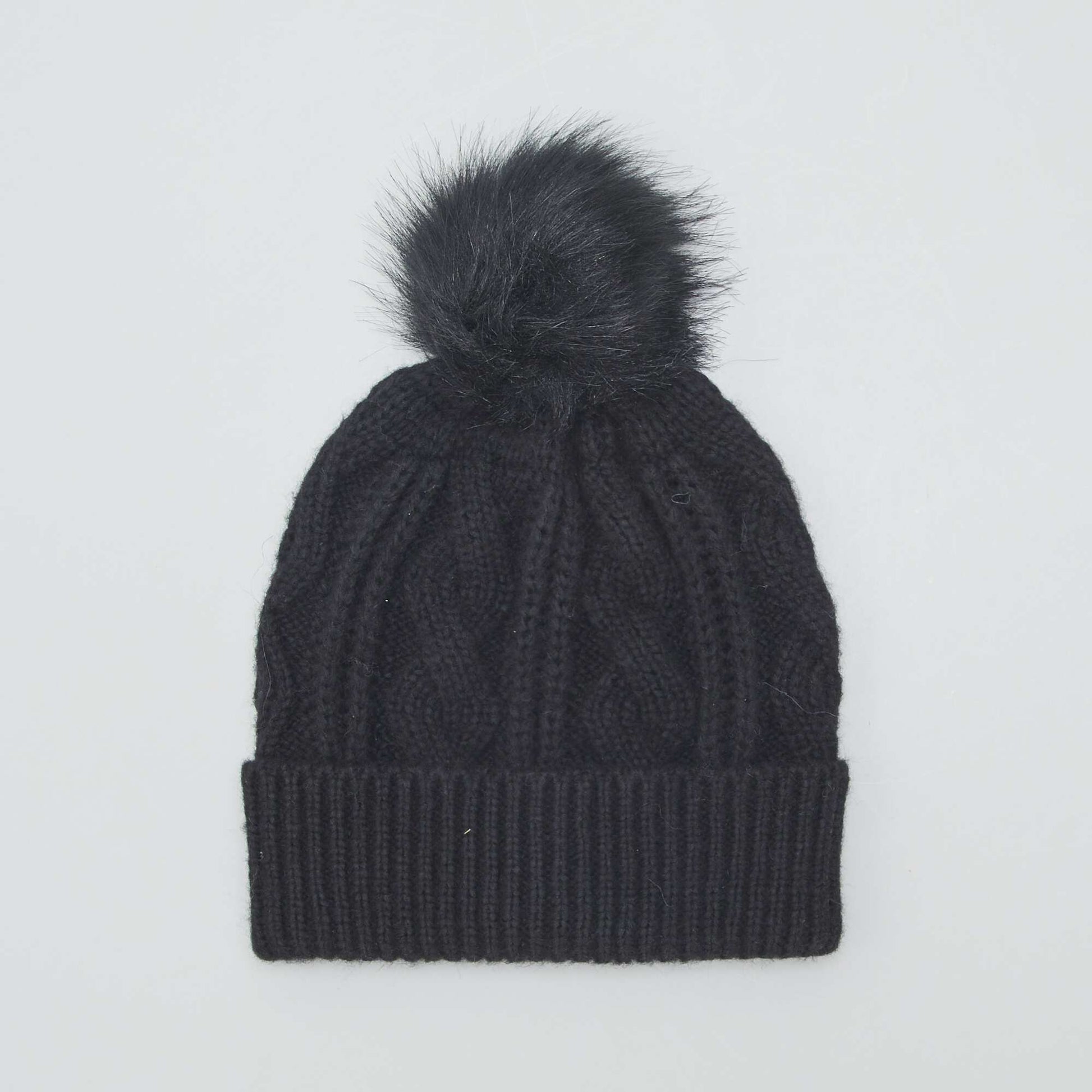 Ce bonnet pompon fera sensation cet hiver. - Bonnet uni - En maille torsad e - Pompon fourr - Base revers c tel - 28 x 22 cm environ