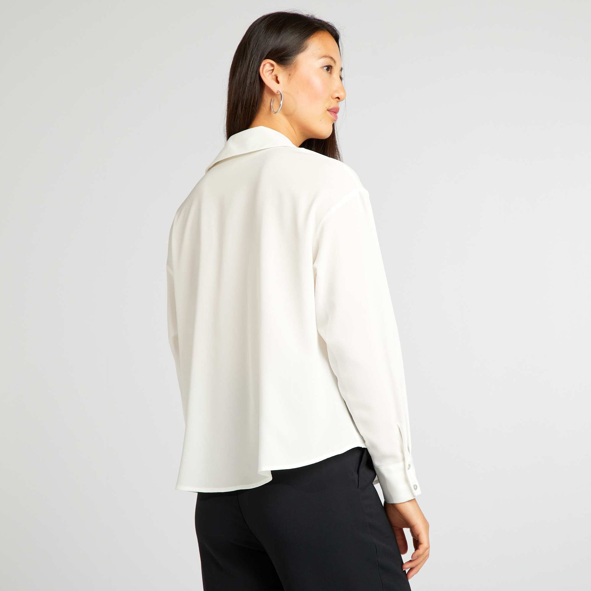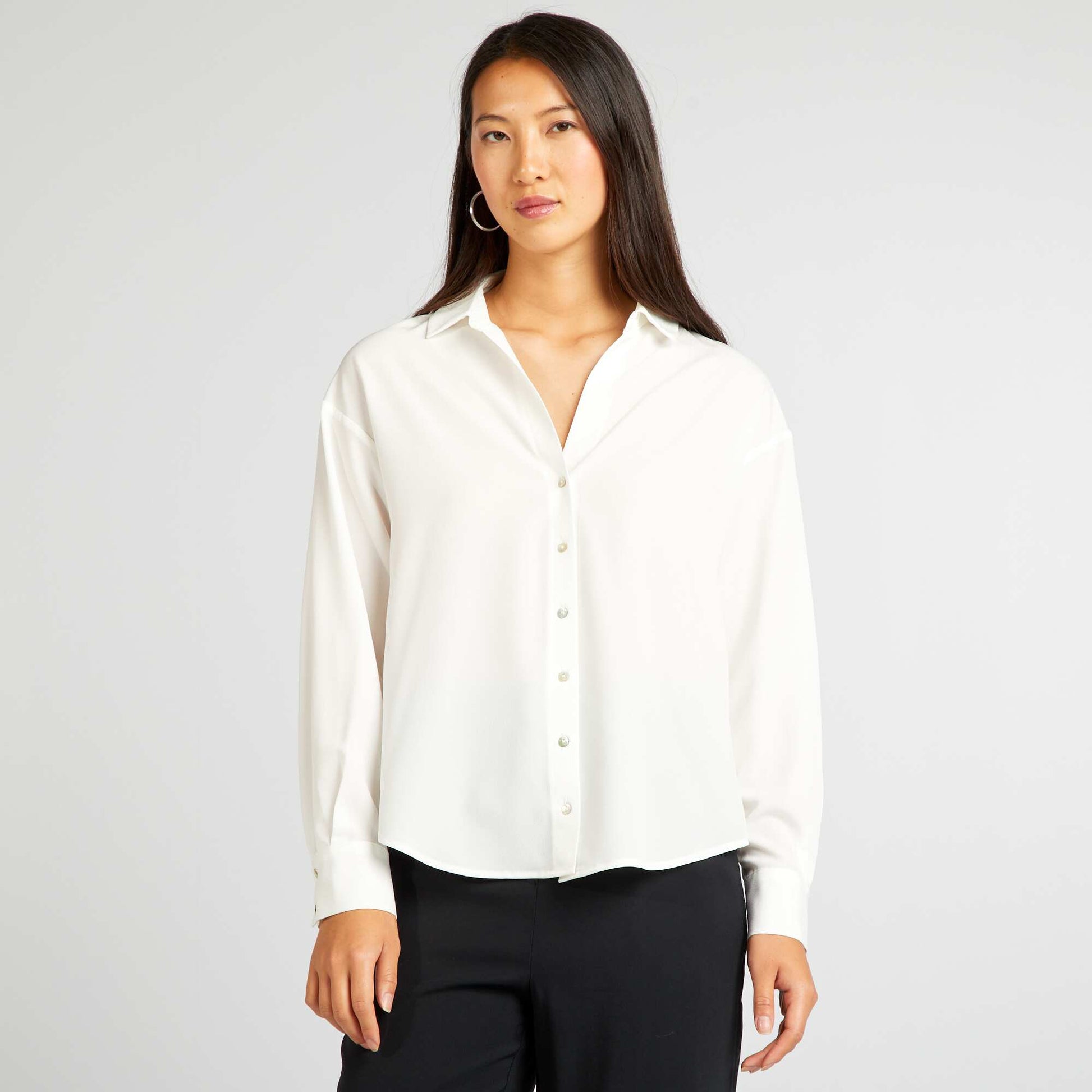 Associez-le avec un jean ou une jupe pour un look d contract et tendance. - Chemisier fluide - En maille cr pe - Col chemise - Ouverture boutonn e - Poignets boutonn s - Longueur dos : 63 cm environ - Notre mannequin porte une taille S et mesure 1m75