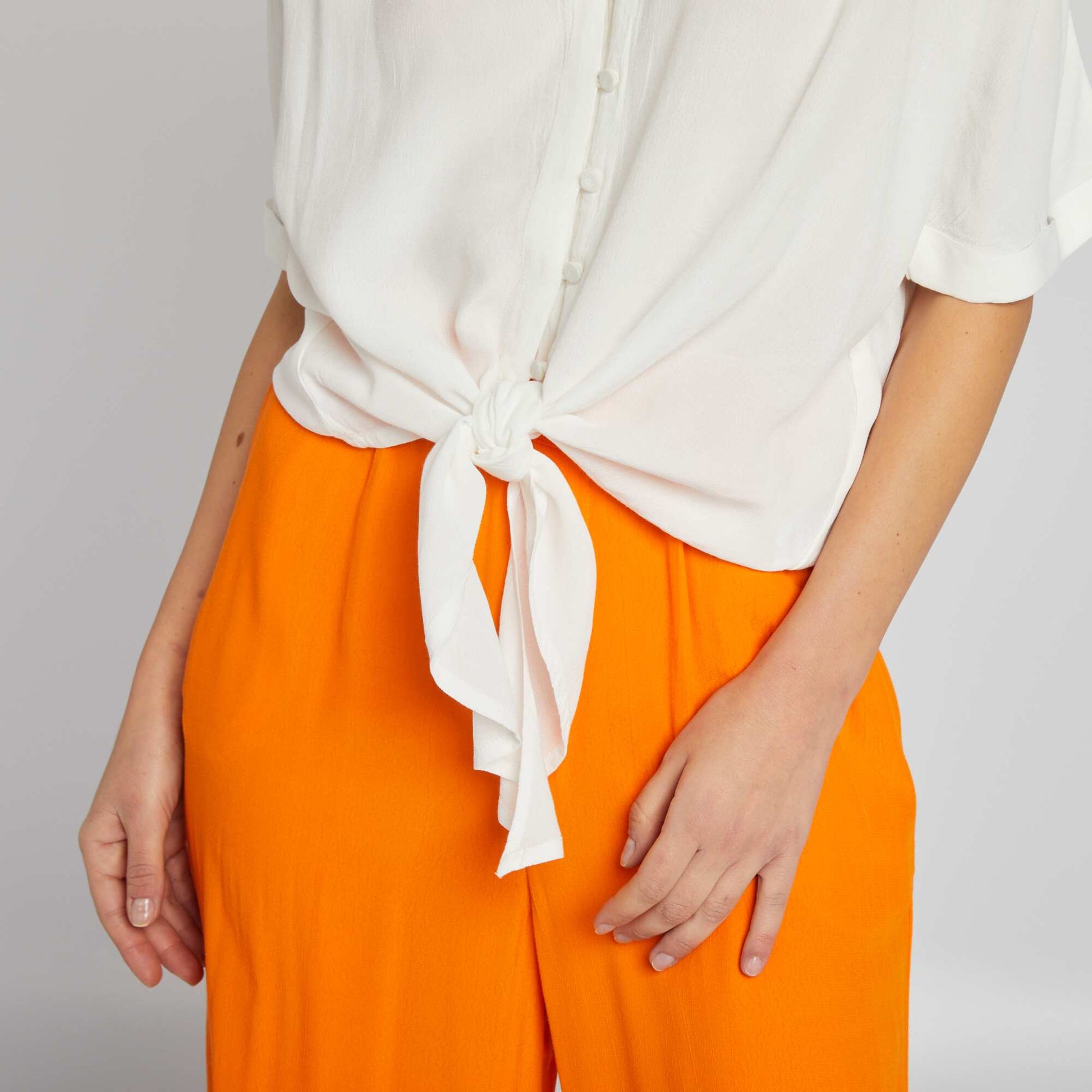 On aime : les diff rents coloris de ce joli chemisier nouer ! - Chemisier manches courtes n ud - Col V - Manches courtes revers - D tails pliss s aux paules - Ouverture boutonn e devant - Base nouer - Couleur unie - Longueur dos : 61 cm environ - Notre mannequin porte une taille M et mesure 1m74