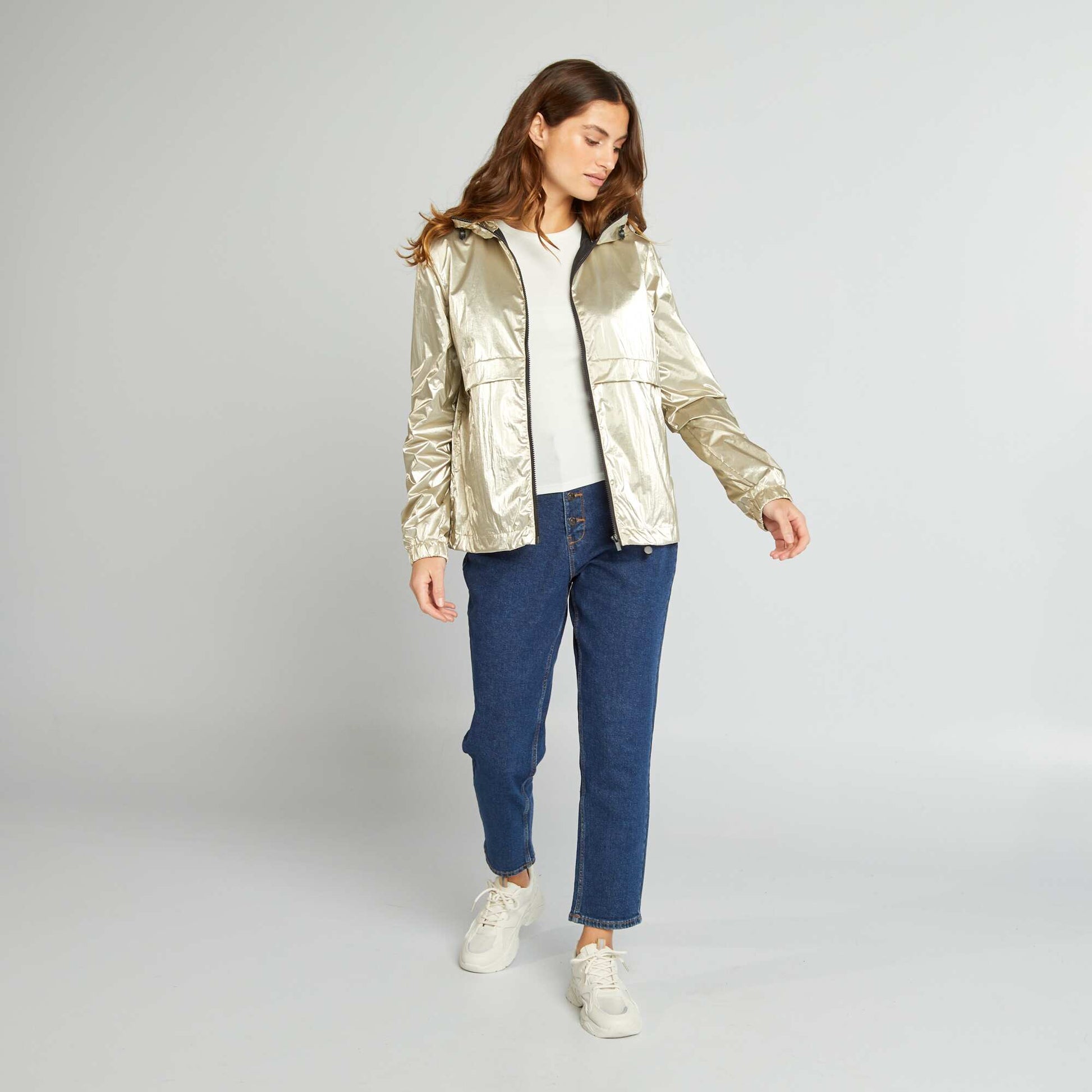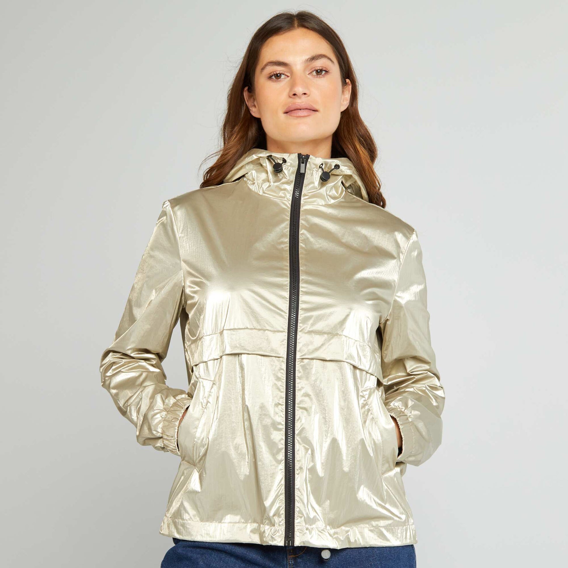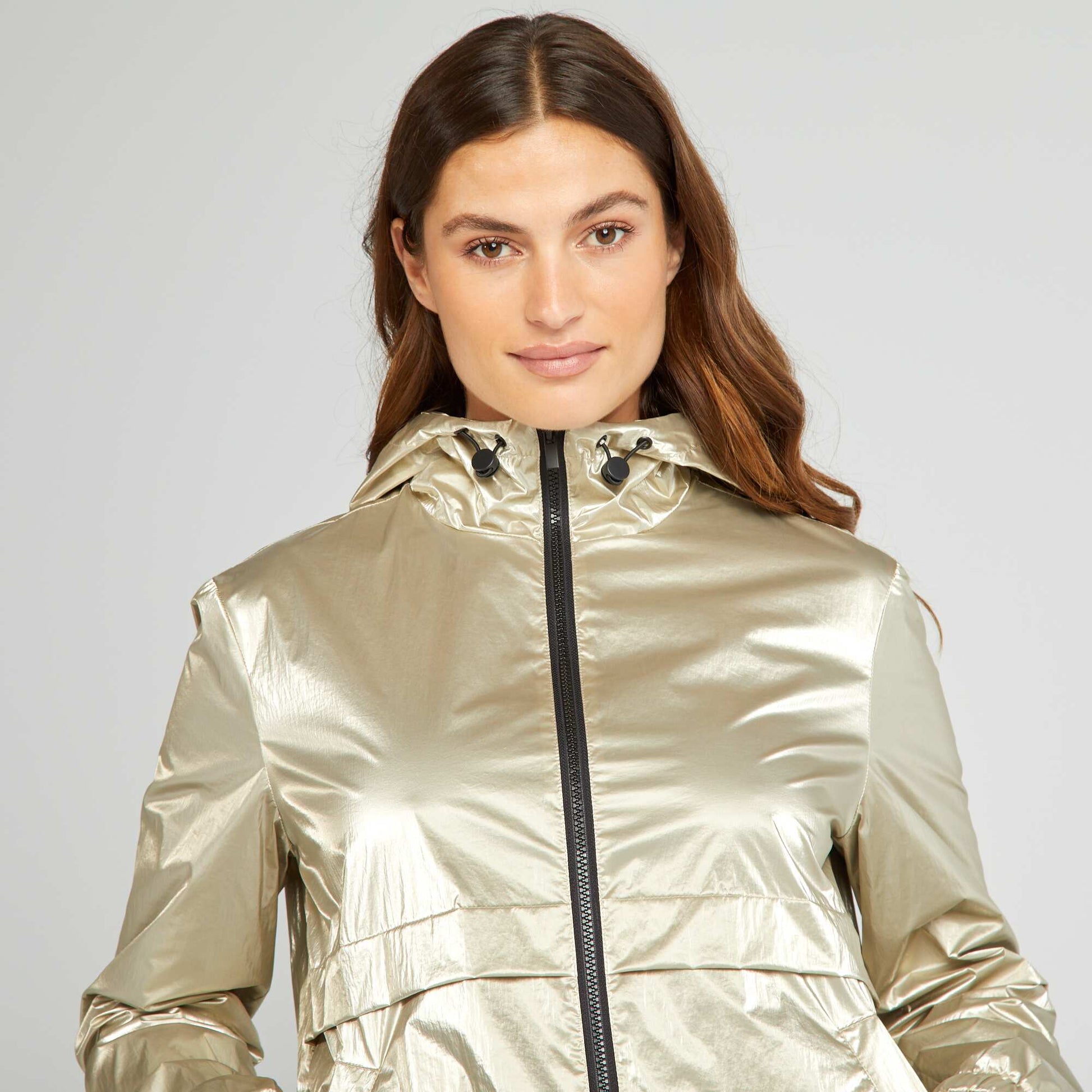 Affrontez les l ments avec style gr ce notre coupe-vent capuche m tallis . Brillez sous la pluie avec ce mod le tendance ! - Coupe-vent l ger - Mati re m tallis e - Manches longues - Ouverture zip contrast - Col montant - Capuche resserrable - Poignets lastiques - Empi cement la taille - 2 poches - Doublure int rieure - Longueur dos : 65 cm environ - Notre mannequin porte une taille S et mesure 1m75
