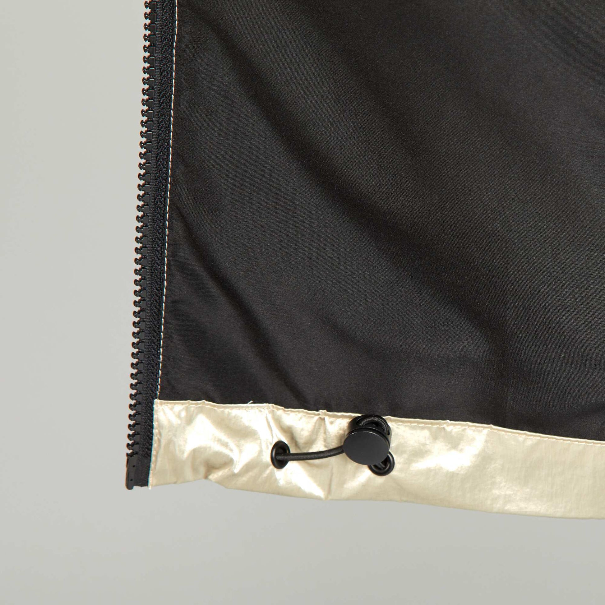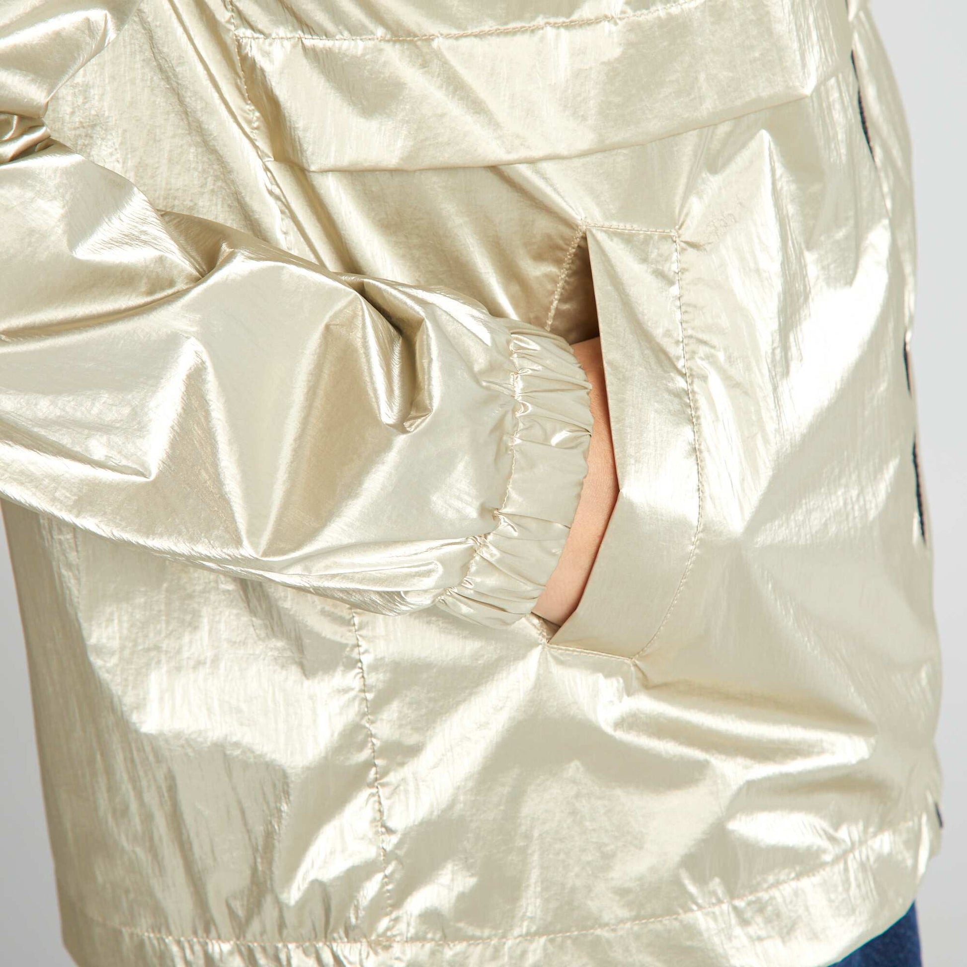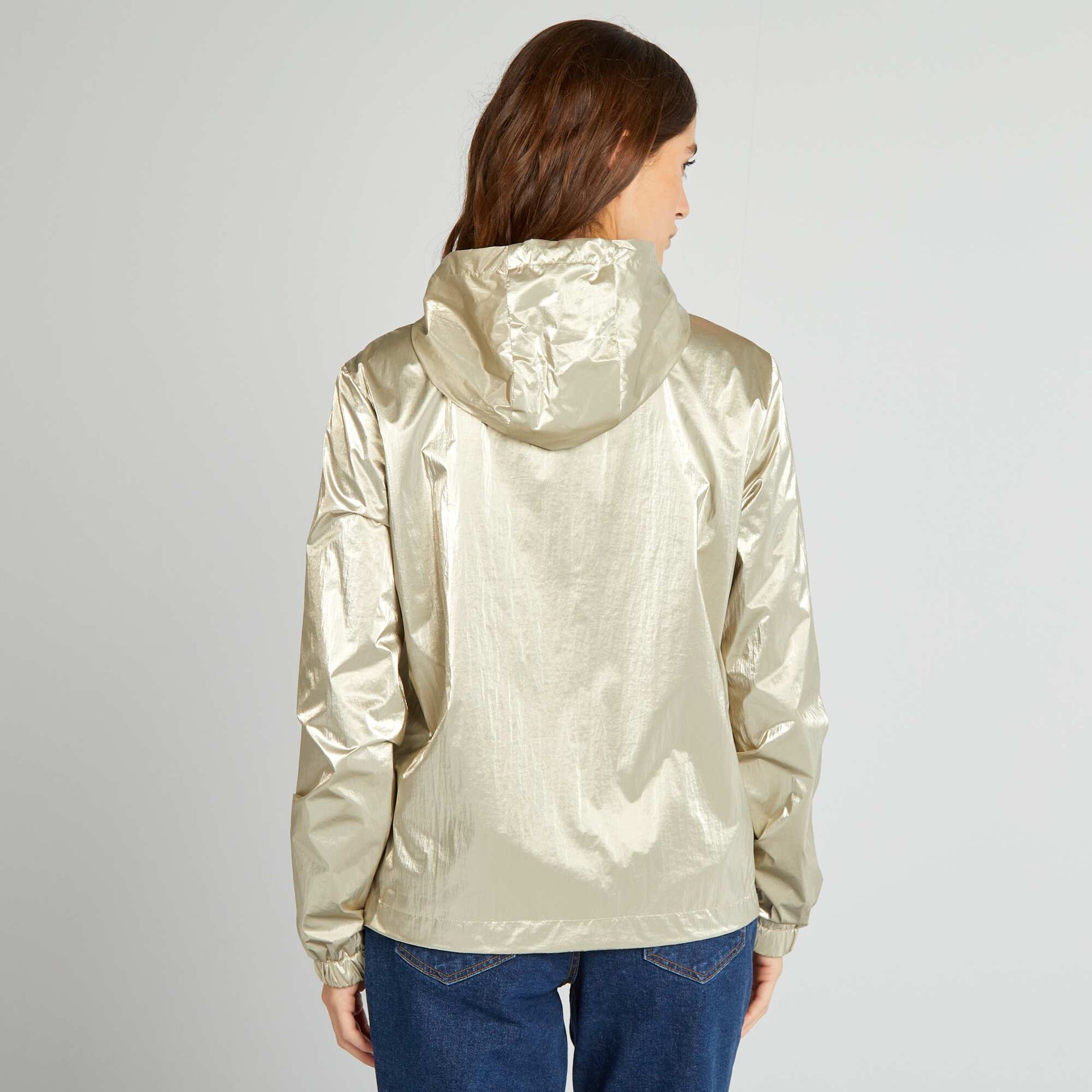 Affrontez les l ments avec style gr ce notre coupe-vent capuche m tallis . Brillez sous la pluie avec ce mod le tendance ! - Coupe-vent l ger - Mati re m tallis e - Manches longues - Ouverture zip contrast - Col montant - Capuche resserrable - Poignets lastiques - Empi cement la taille - 2 poches - Doublure int rieure - Longueur dos : 65 cm environ - Notre mannequin porte une taille S et mesure 1m75