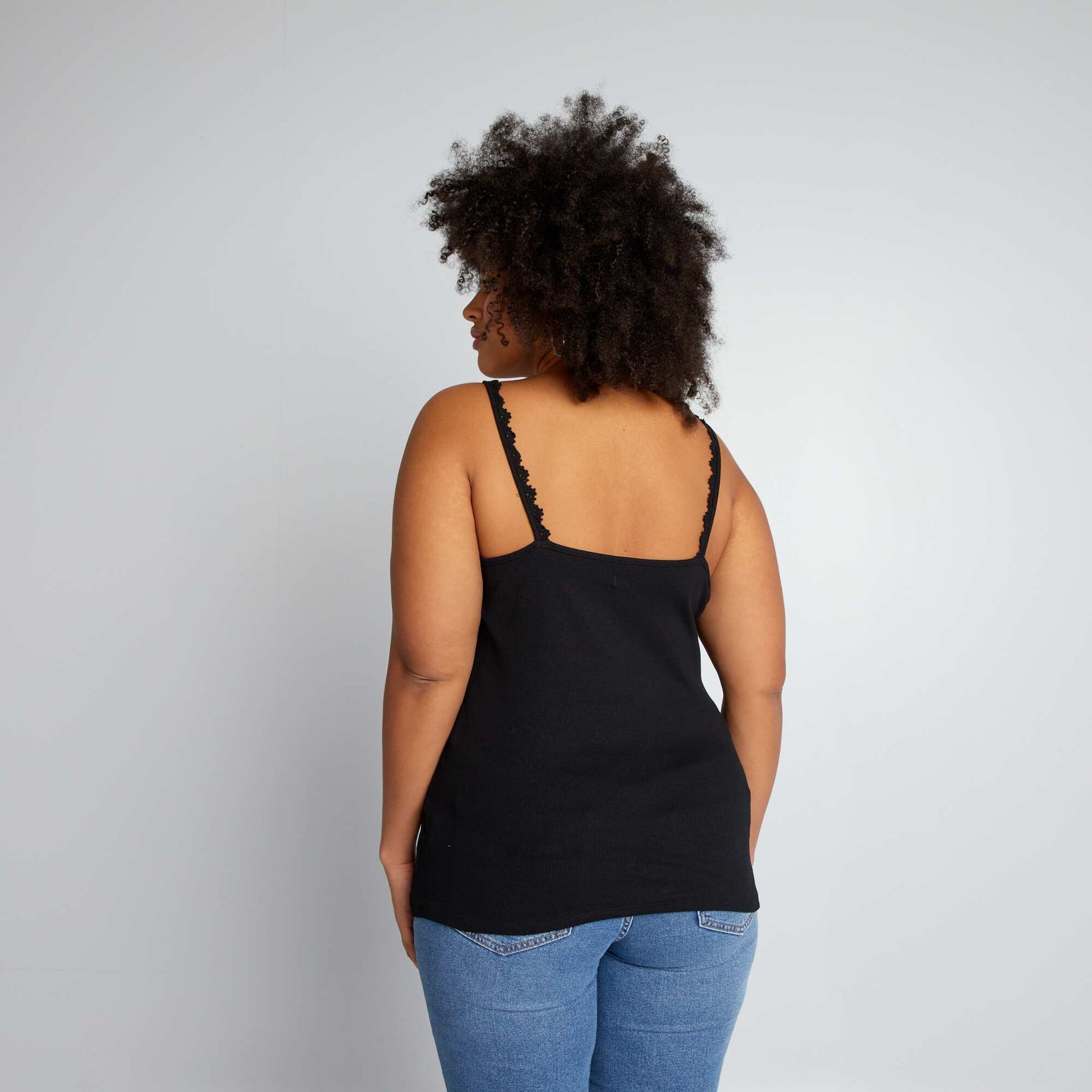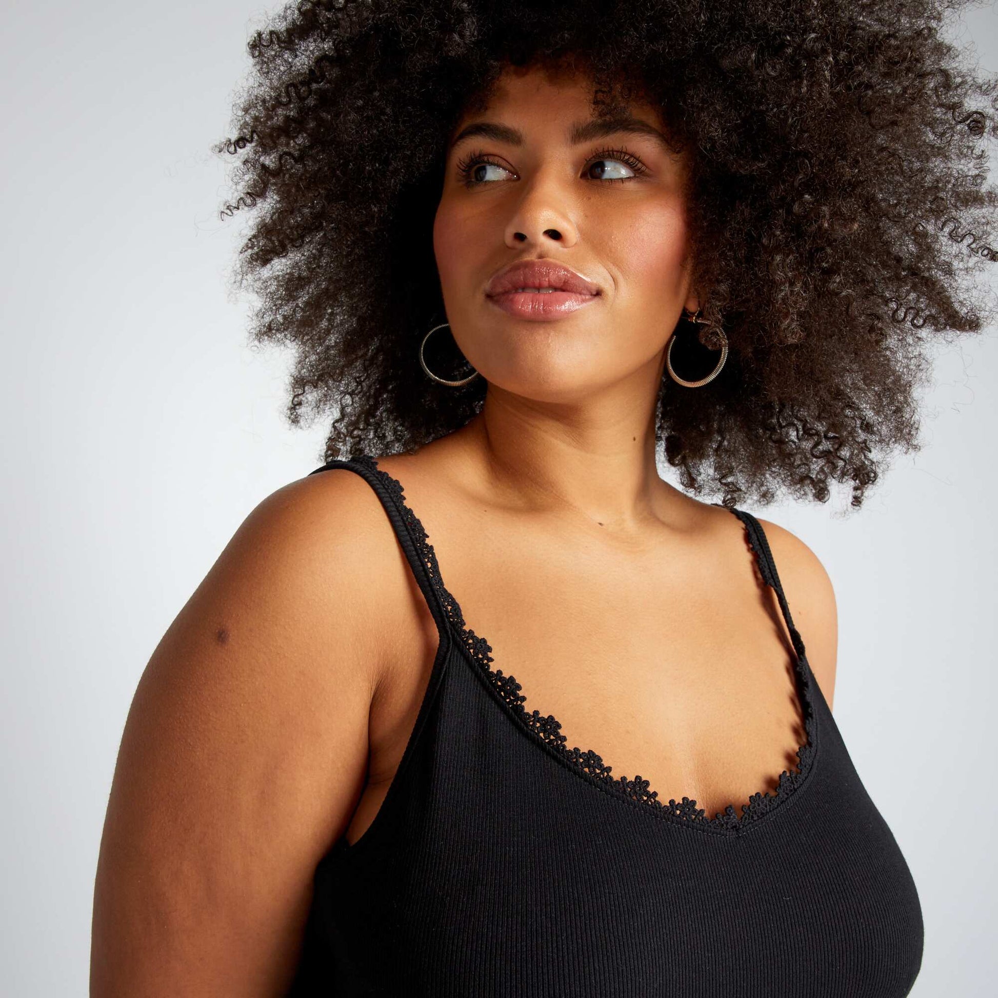 Sa mati re stretch vous apporte un maximum de confort. - D bardeur fines bretelles - En maille c tel e - Col V - D tails en dentelle - Longueur du dos : 68 cm - Notre mannequin porte une taille XL et mesure 1m75