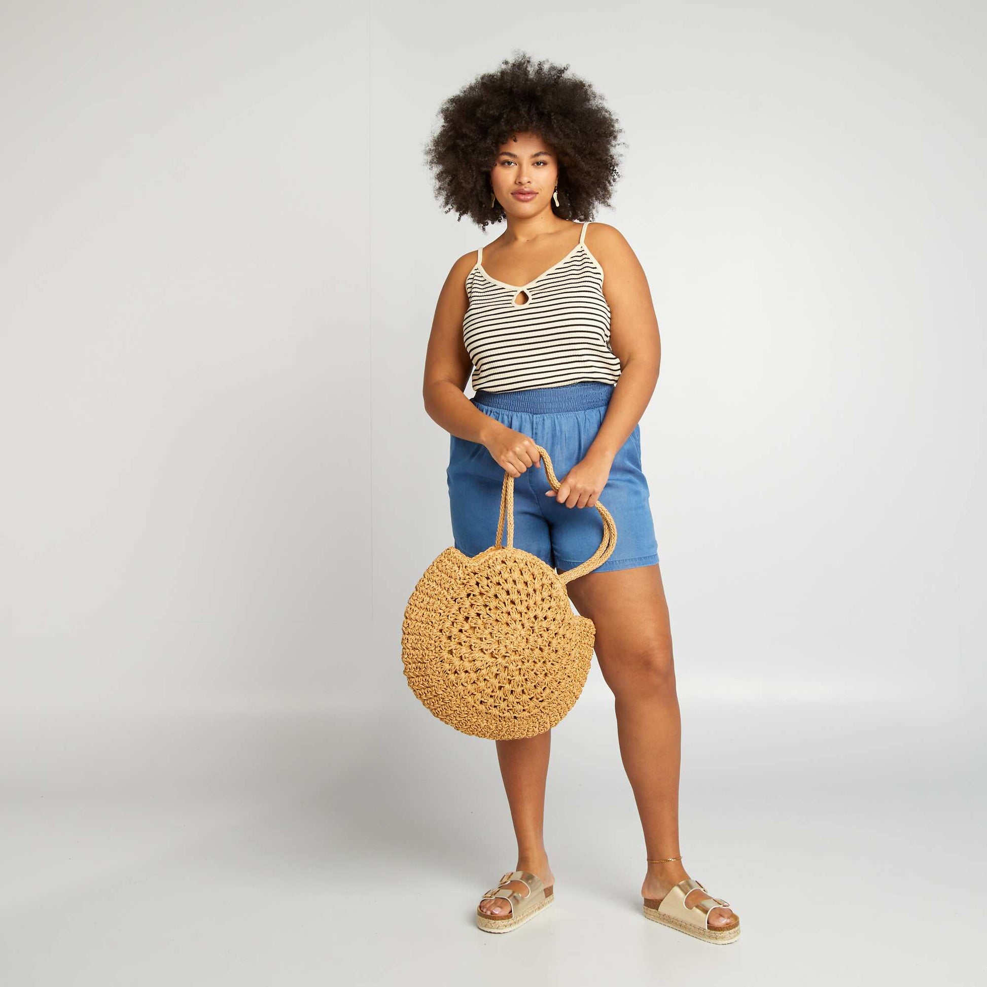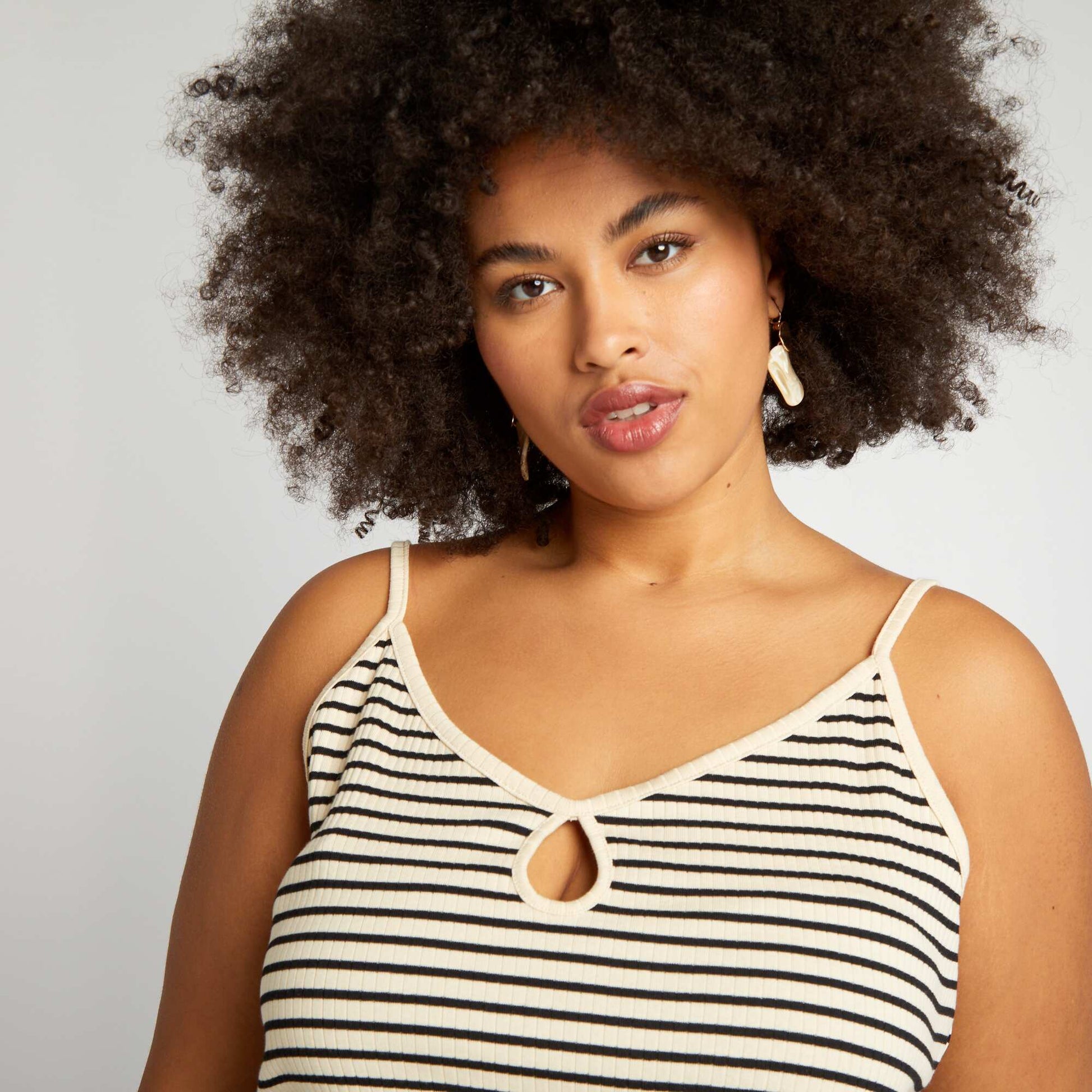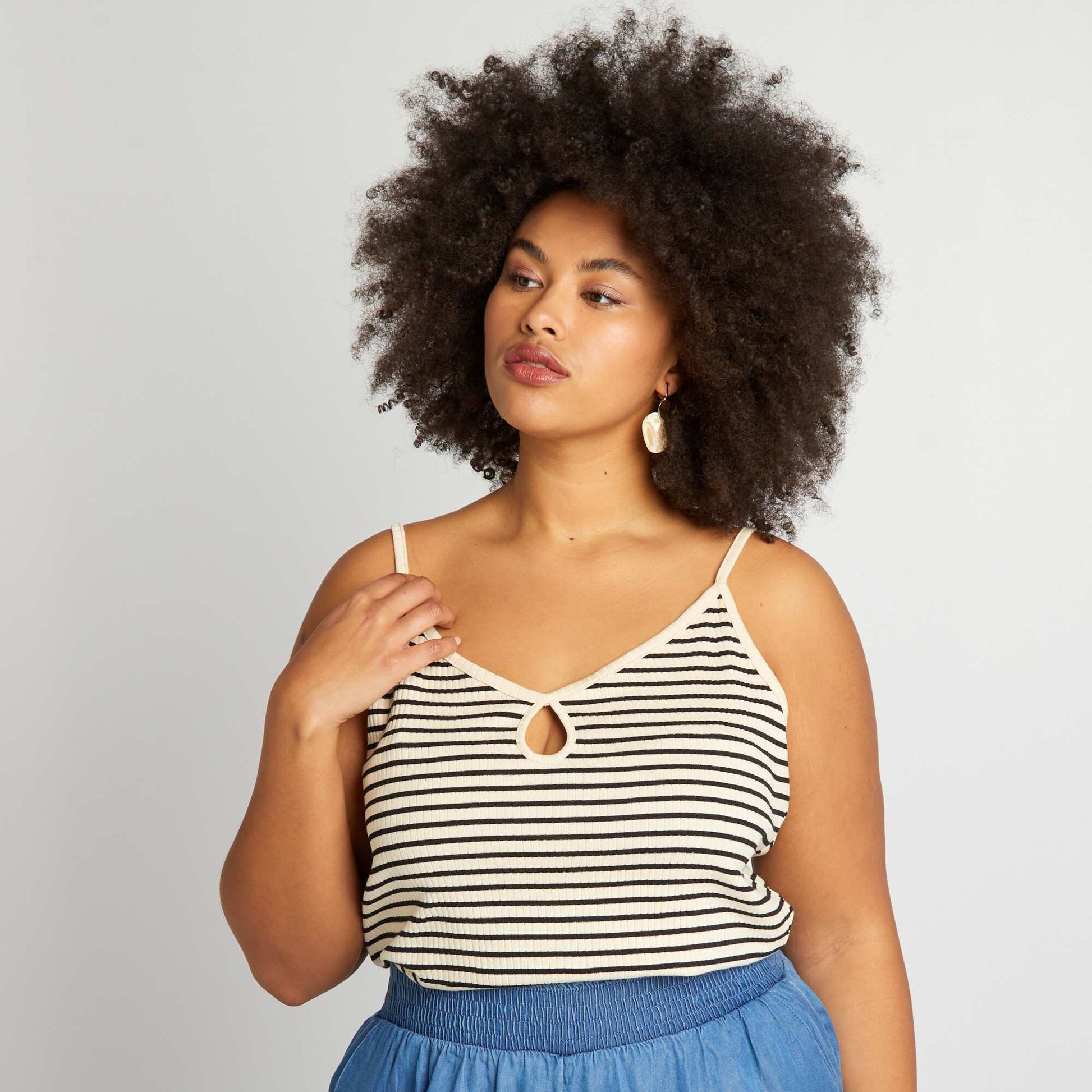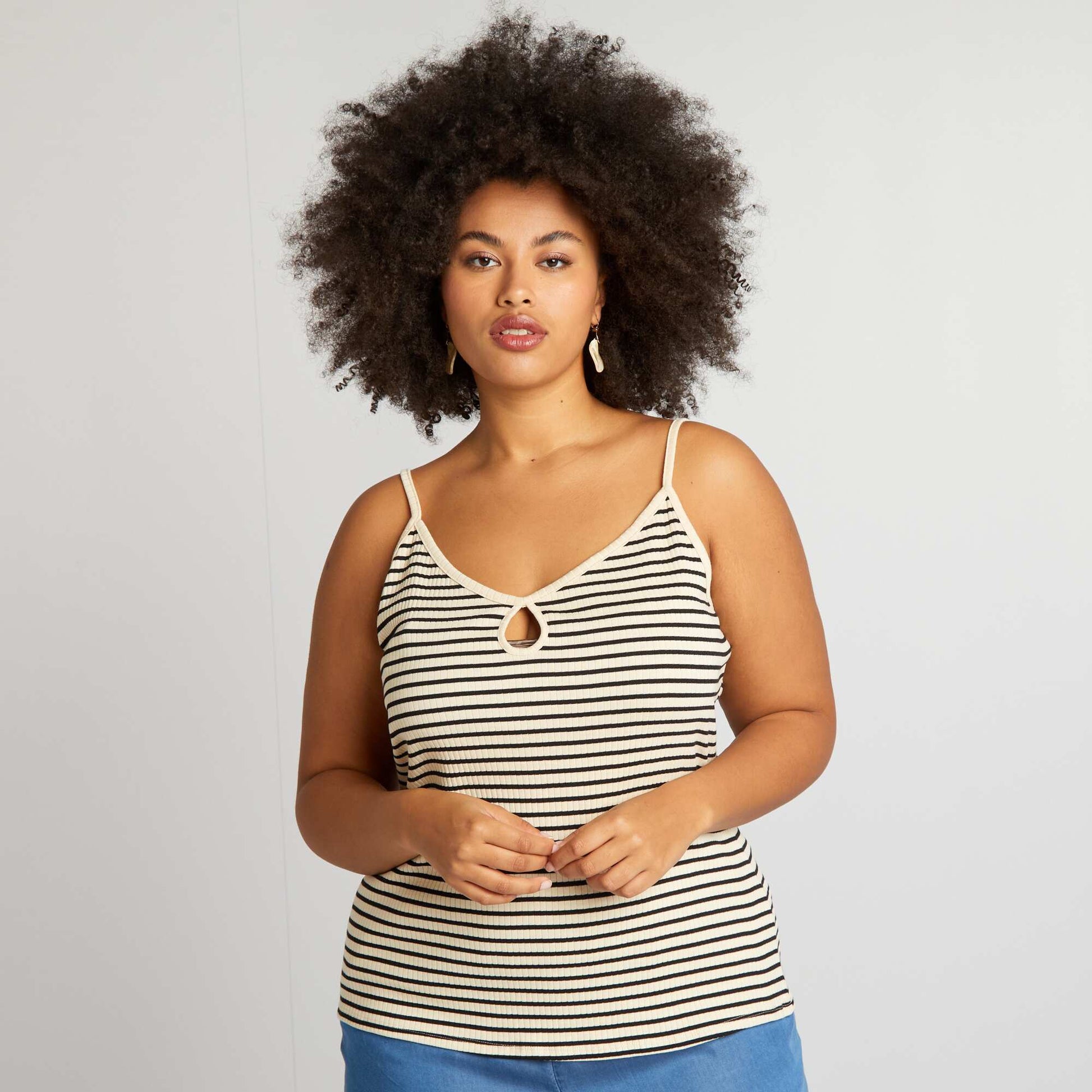 Ajoutez une dose de fra cheur votre garde-robe estivale avec ce d bardeur c tel . - D bardeur c tel - Fines bretelles - Encolure en V - Motif ray - Ouverture fantaisie devant - Longueur dos : 46 cm environ - Notre mannequin porte une taille XL et mesure 1m82