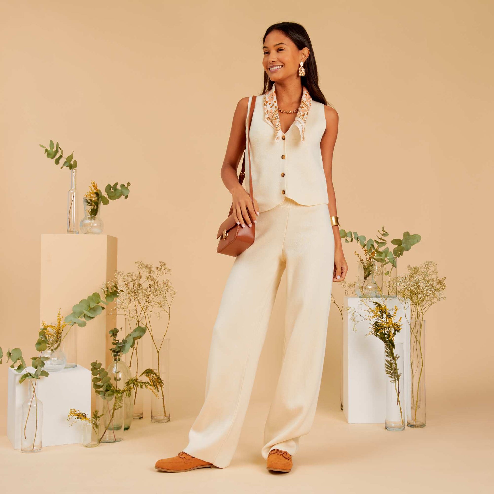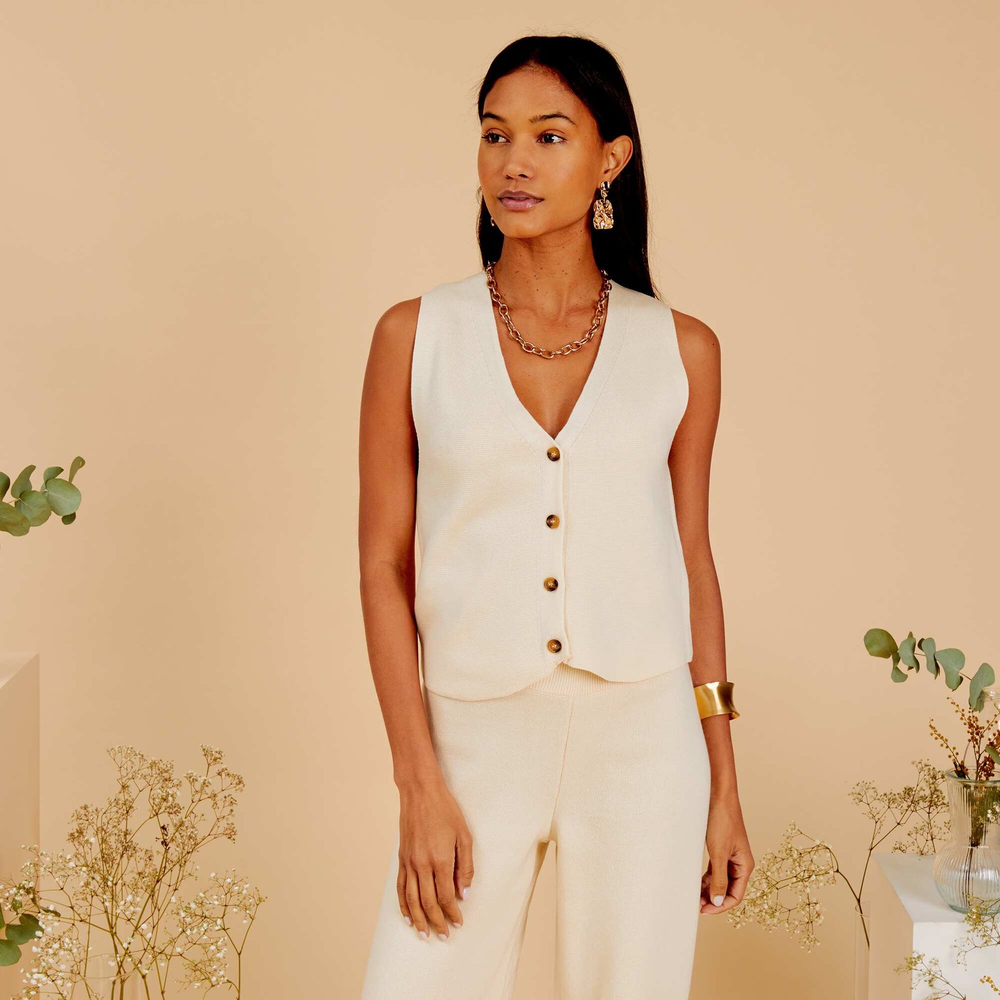Gilet col V sans manches Beige