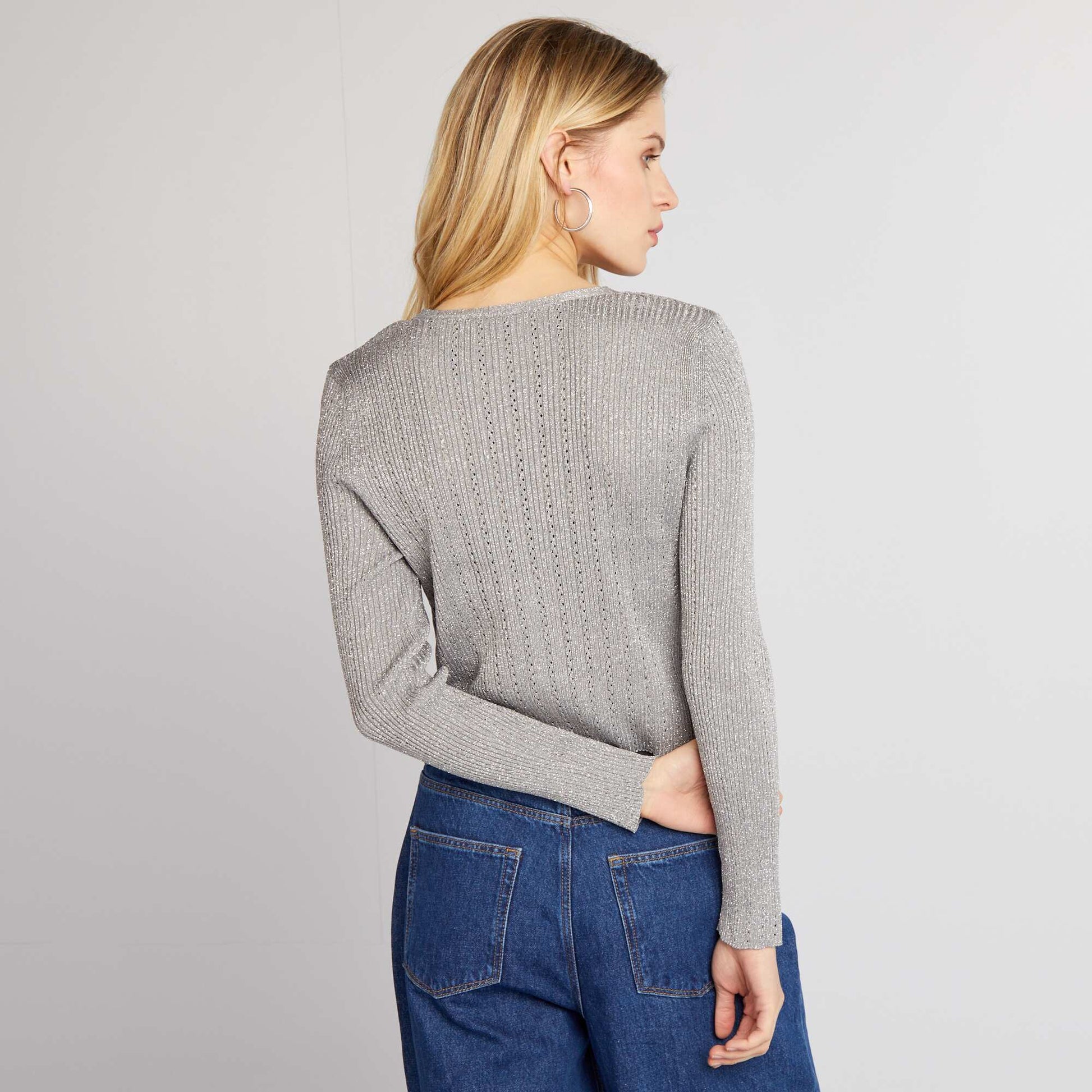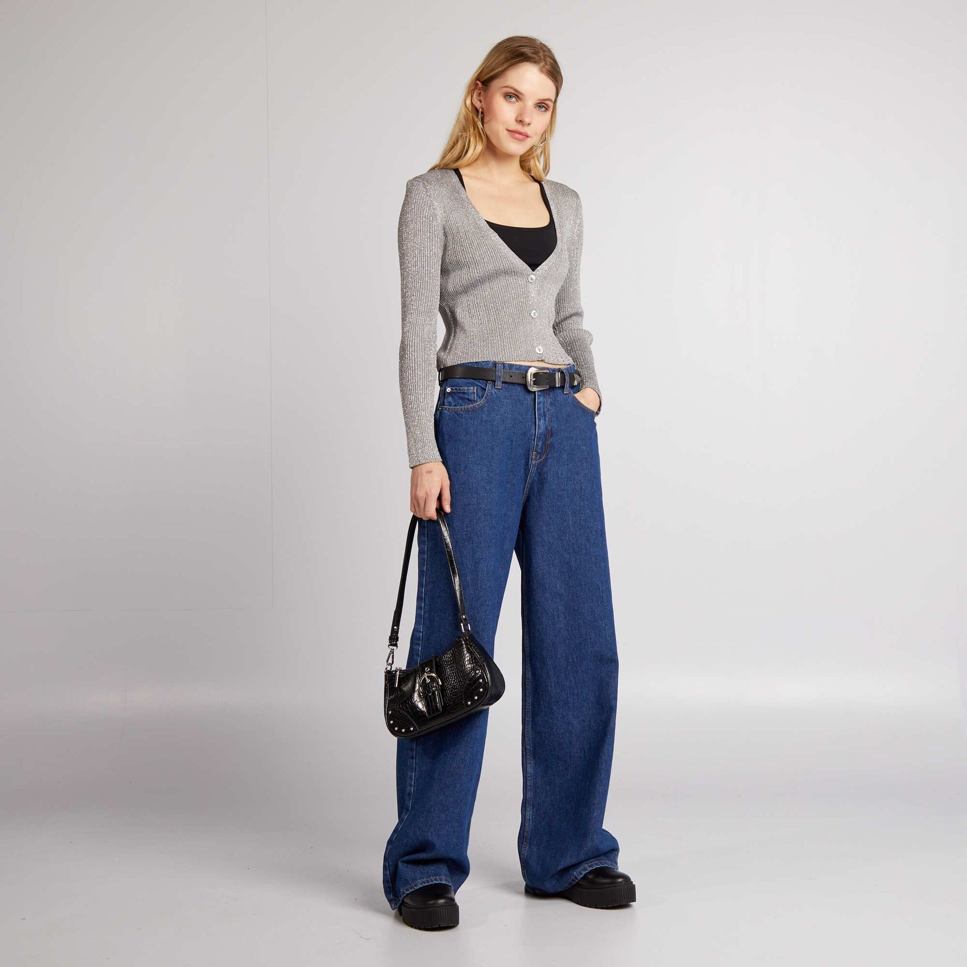 Optez pour une touche d' clat avec notre gilet crop top en maille brillante. - Gilet fin - Coupe crop top - Maille brillante - Manches longues - Ouverture 3 boutons - Finitions bords-c tes - Encolure en V - Longueur dos : 45 cm environ - Notre mannequin porte une taille M et mesure 1m76