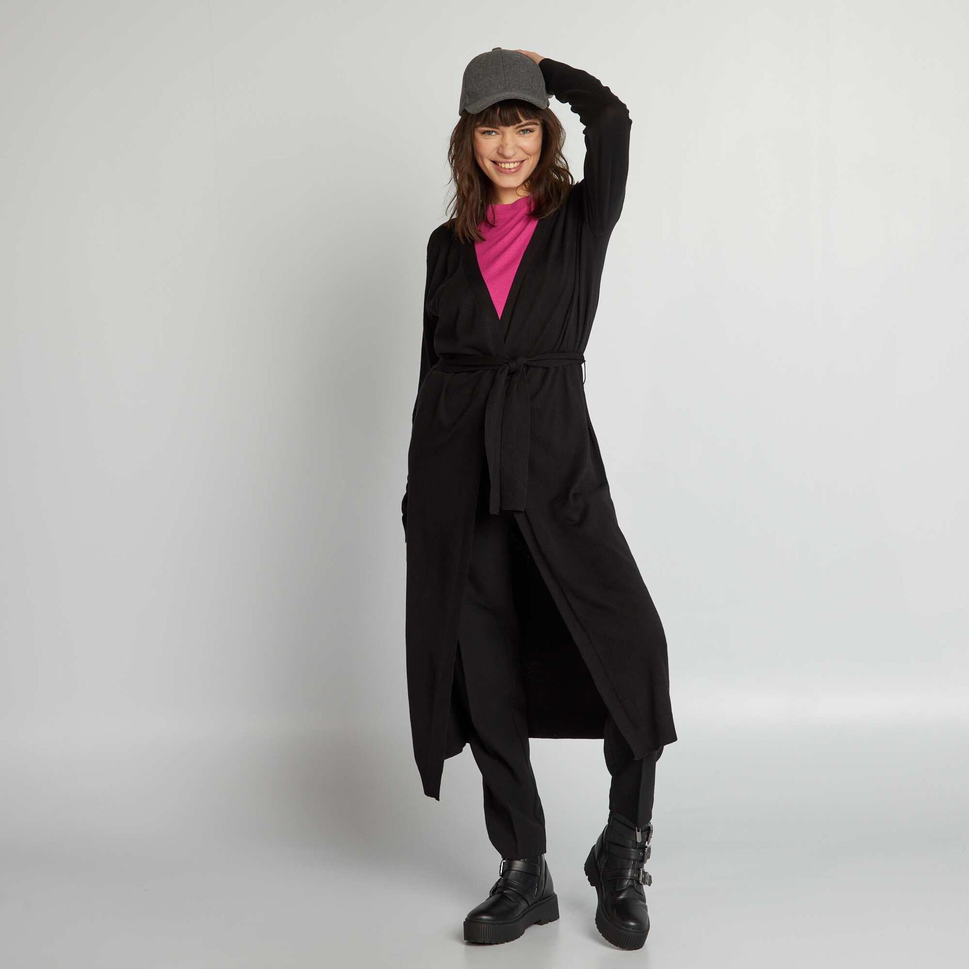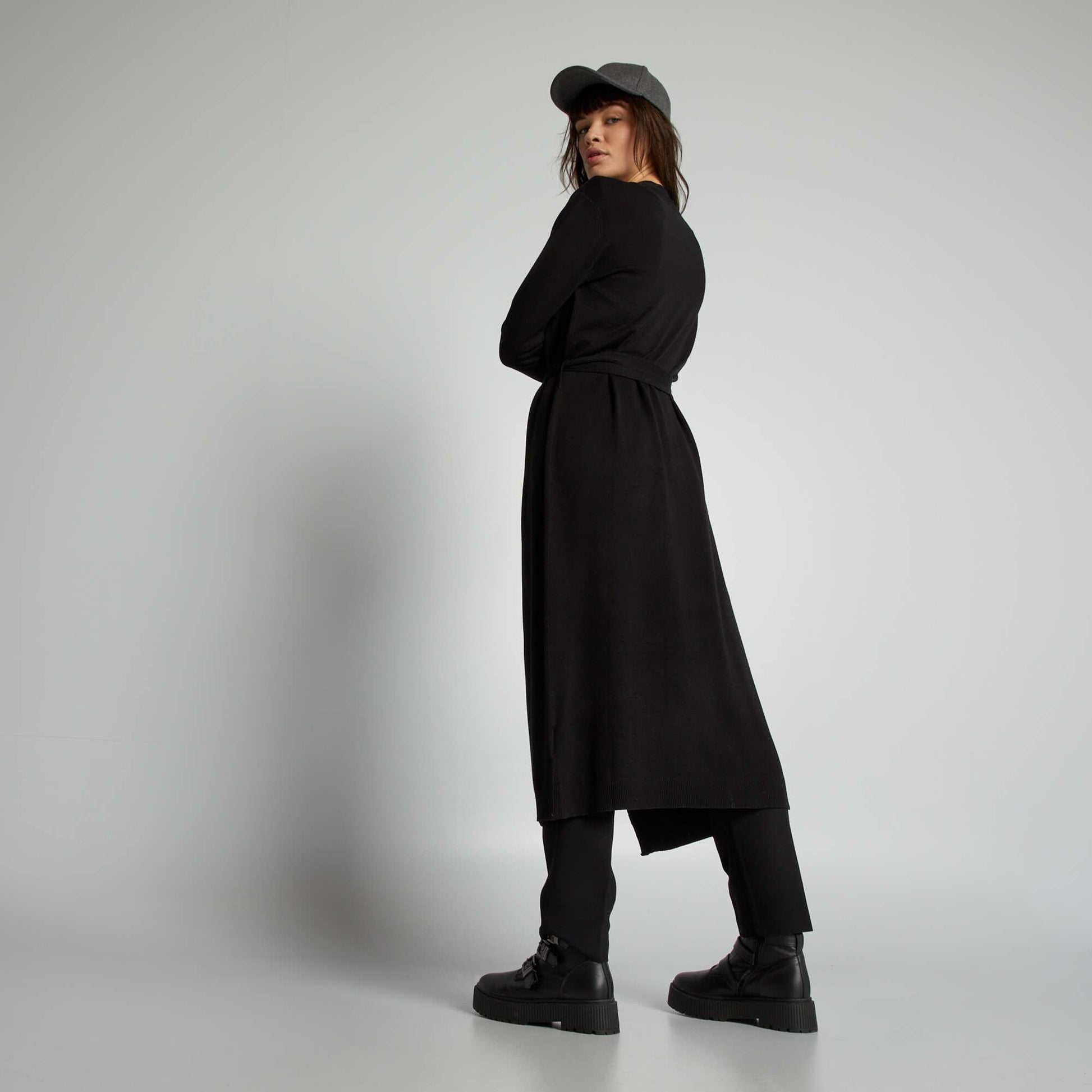 Gilet d contract et moderne : check ! - Gilet extra long ceinture - En maille - Sans col - Manches longues - Finitions bords-c tes - Couleur unie - Notre mannequin porte une taille M et mesure 1m75