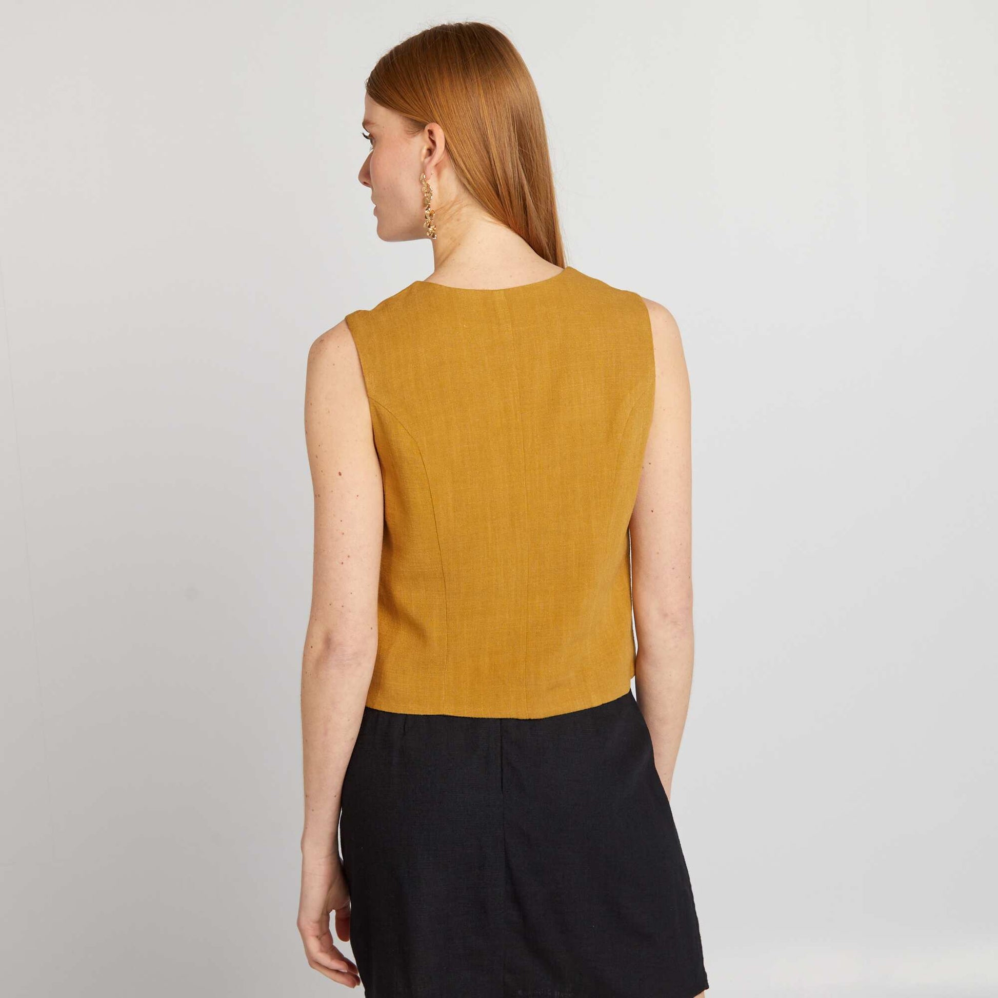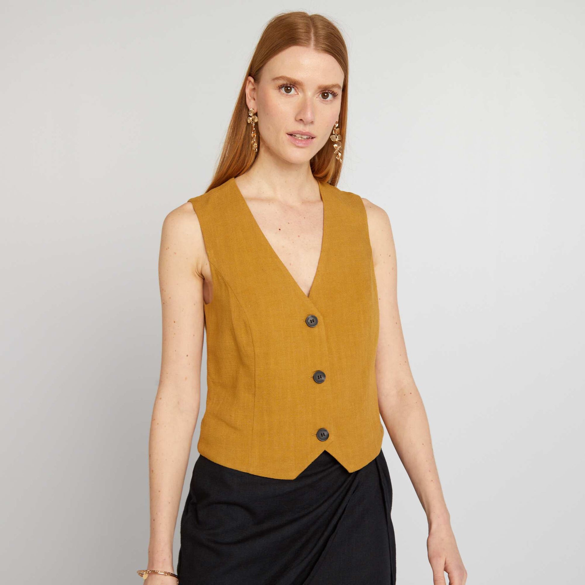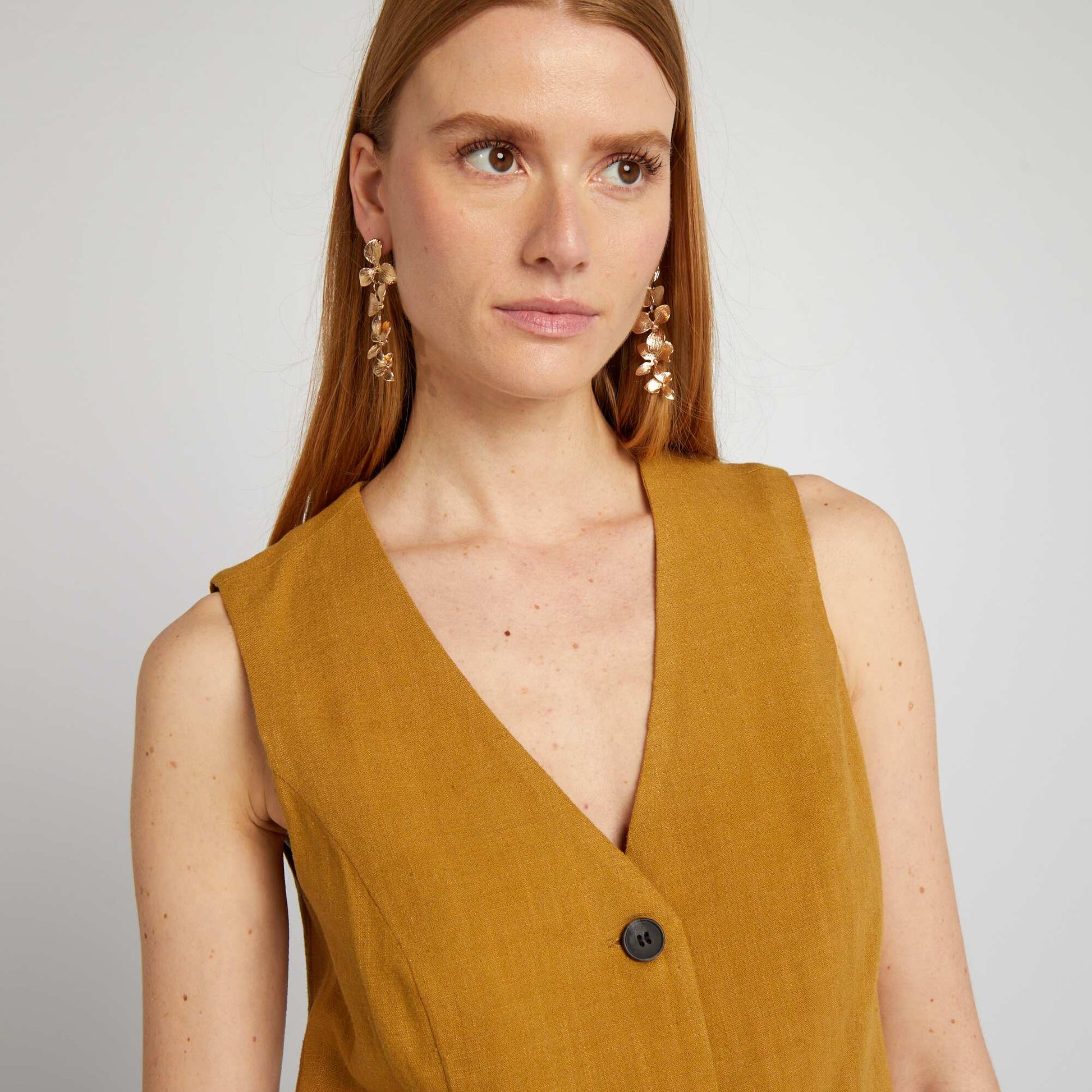 Associez ce gilet avec un pantalon pinces fluide style wide leg. Vous serez au top de la mode ! - Gilet gar on de caf en lin m lang - Col V - Sans manches - Ouverture boutonn e - Doubl - Couleur unie - Longueur du dos : 48 cm - Notre mannequin porte une taille M et mesure 1m75