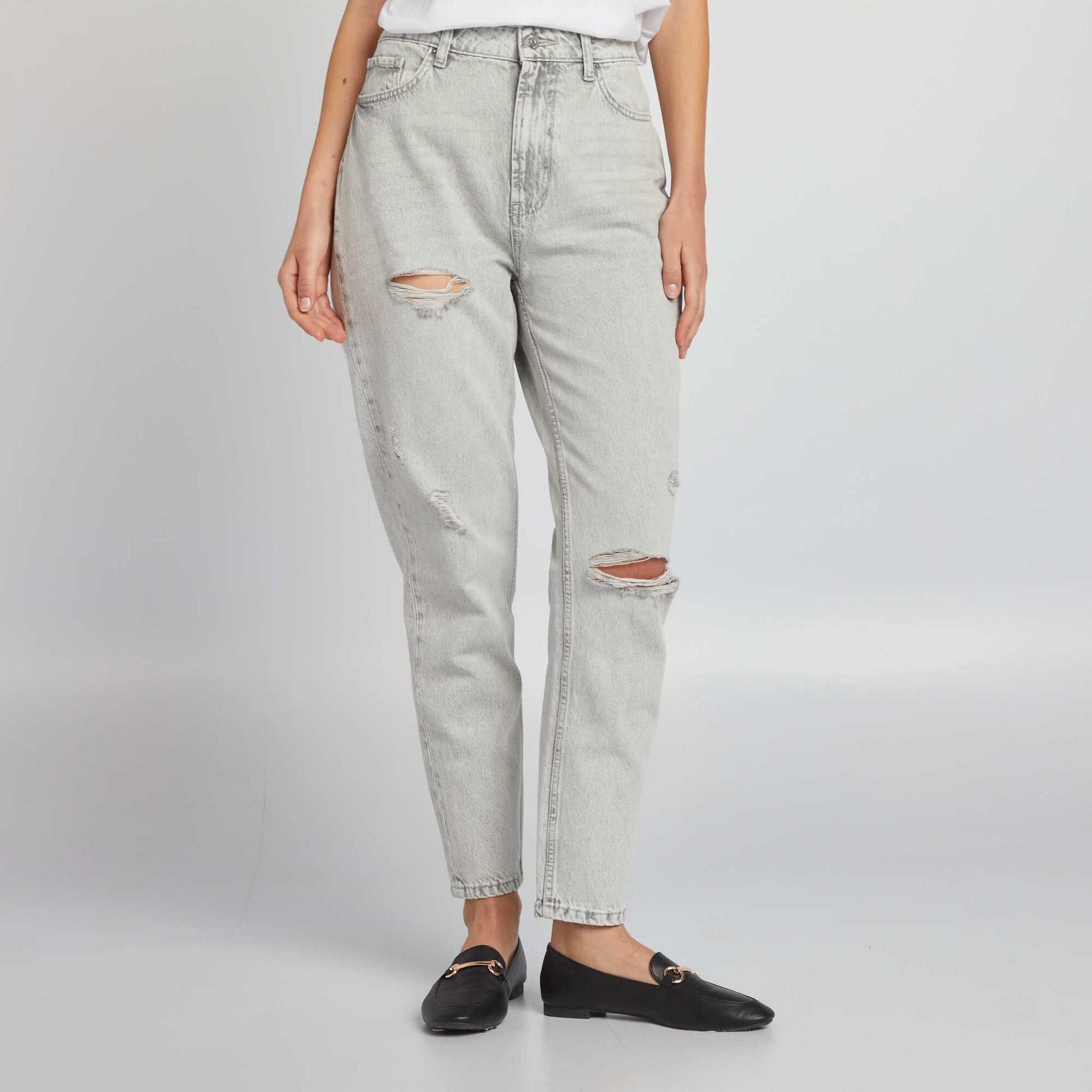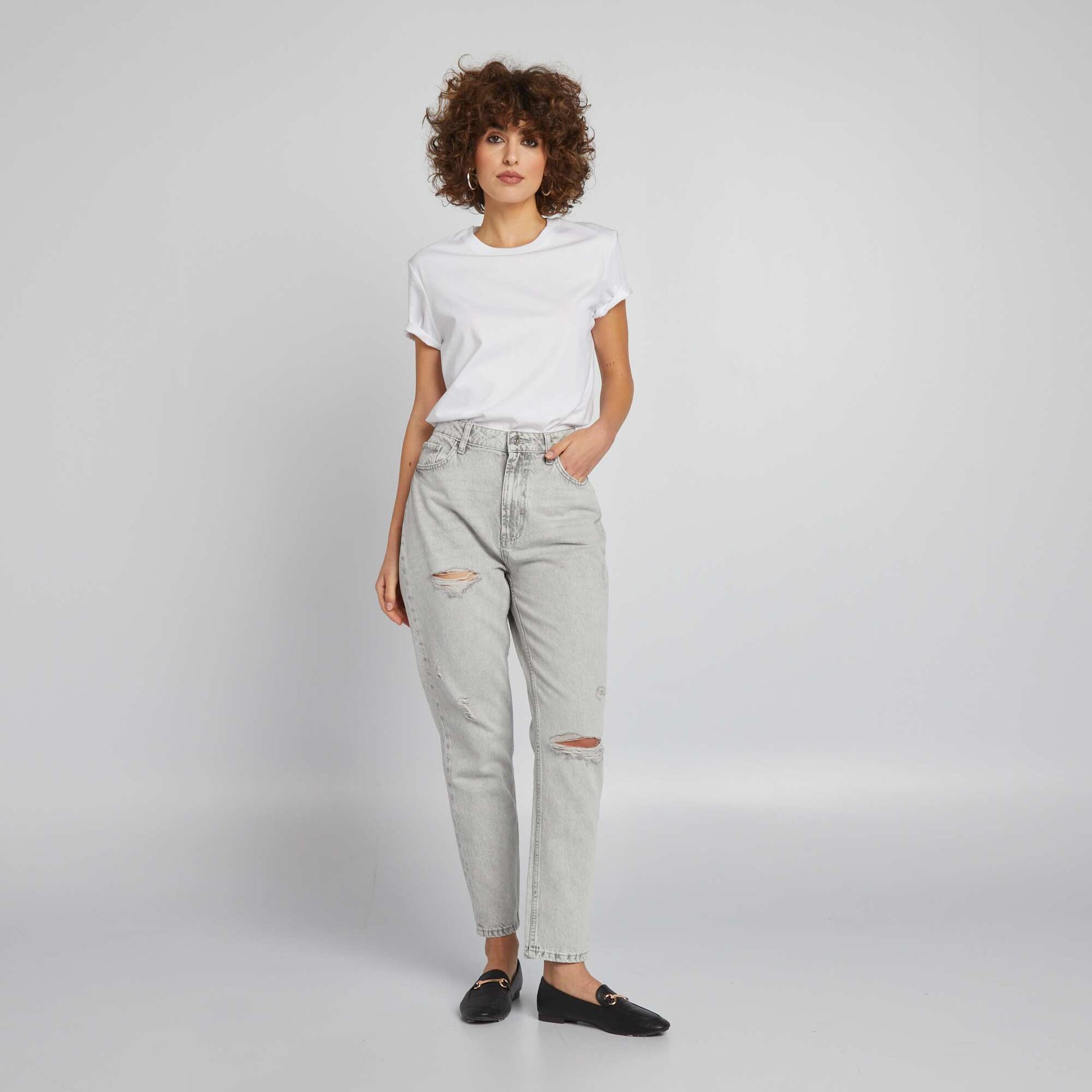 Ce jean la coupe Mom fit sublimera votre silhouette gr ce sa taille haute ! - Jean Mom fit - Taille haute - Ouverture boutonn e et zipp e devant - Passants pour ceinture - 2 poches + 1 poche ticket - 2 poches au dos - Denim trou - Longueur 34 ( pour les personnes mesurant +1m75) - Longueur entrejambe : 71 cm environ - Largeur bas de jambe : 15 cm environ