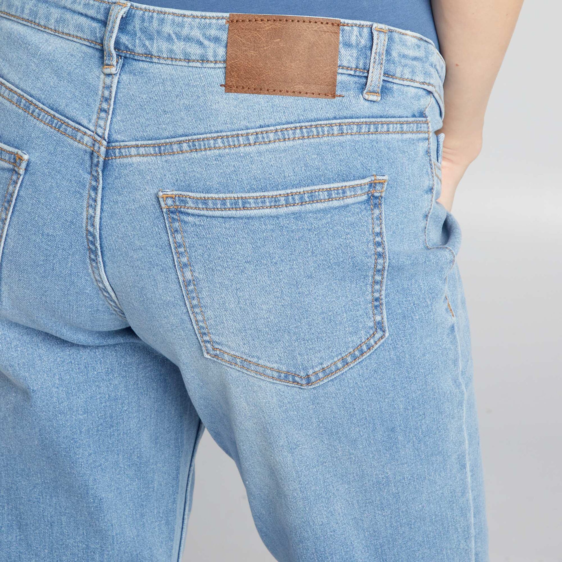 Un jean stretch et confortable, parfait pour les futures mamans. - Jean maternit - Coupe mom - Stretch - Bandeau lastique pour le ventre - Bouton fantaisie devant - 2 poches plaqu es + 1 ticket devant - 2 poches surpiqu es au dos - Abrasions / effet destroy - Longueur entrejambe : 70 cm environ - Largeur bas de jambe : 16 cm environ - Notre mannequin porte une taille 36 et mesure 1m76