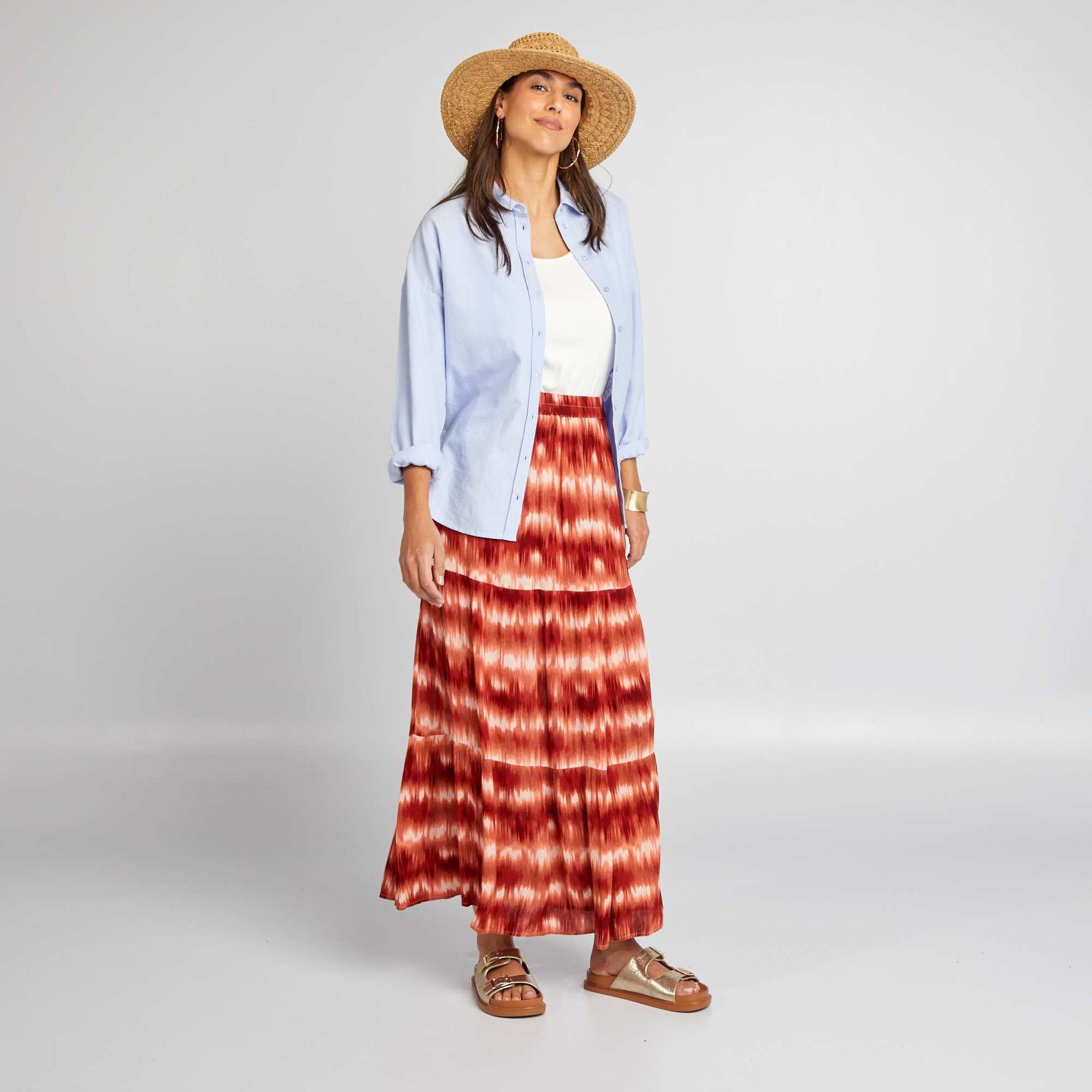 Une jupe confortable ambiance boh me. - Jupe longue en maille cr pe - Taille lastiqu e - Coupe vas e - Imprim d grad - Longueur du dos : 96 cm - Notre mannequin porte une taille M et mesure 1m85