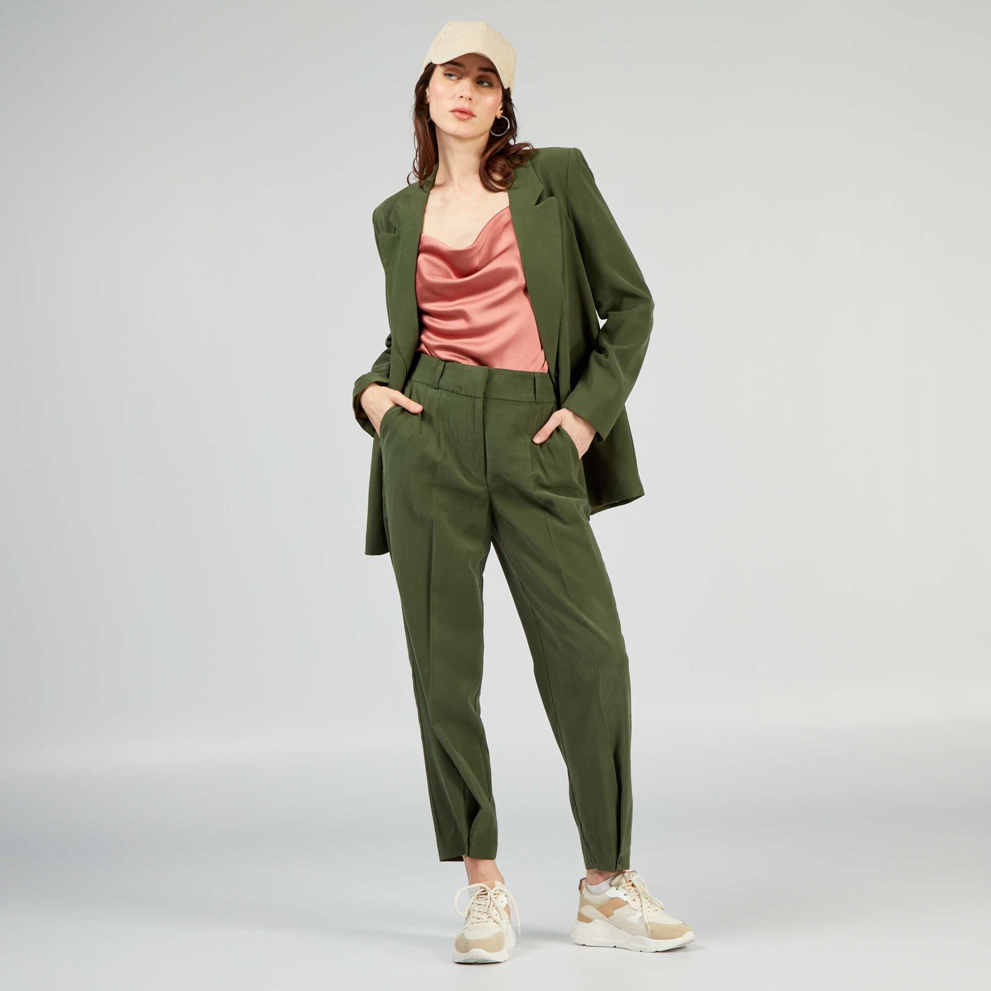 Ce pantalon vous offre style et une libert de mouvement ! Peut tre associ avec la veste coordonn e ATK91 (sous r serve de disponibilit ). - Pantalon en twill - Coupe regular - Ouverture par passants et zipp e devant - Passants pour ceinture - 2 poches devant - Bouton la base - Couleur unie - Longueur entrejambe : 69 cm environ - Largeur bas de jambe : 15 cm environ - Notre mannequin porte une taille 36 et mesure 1m76