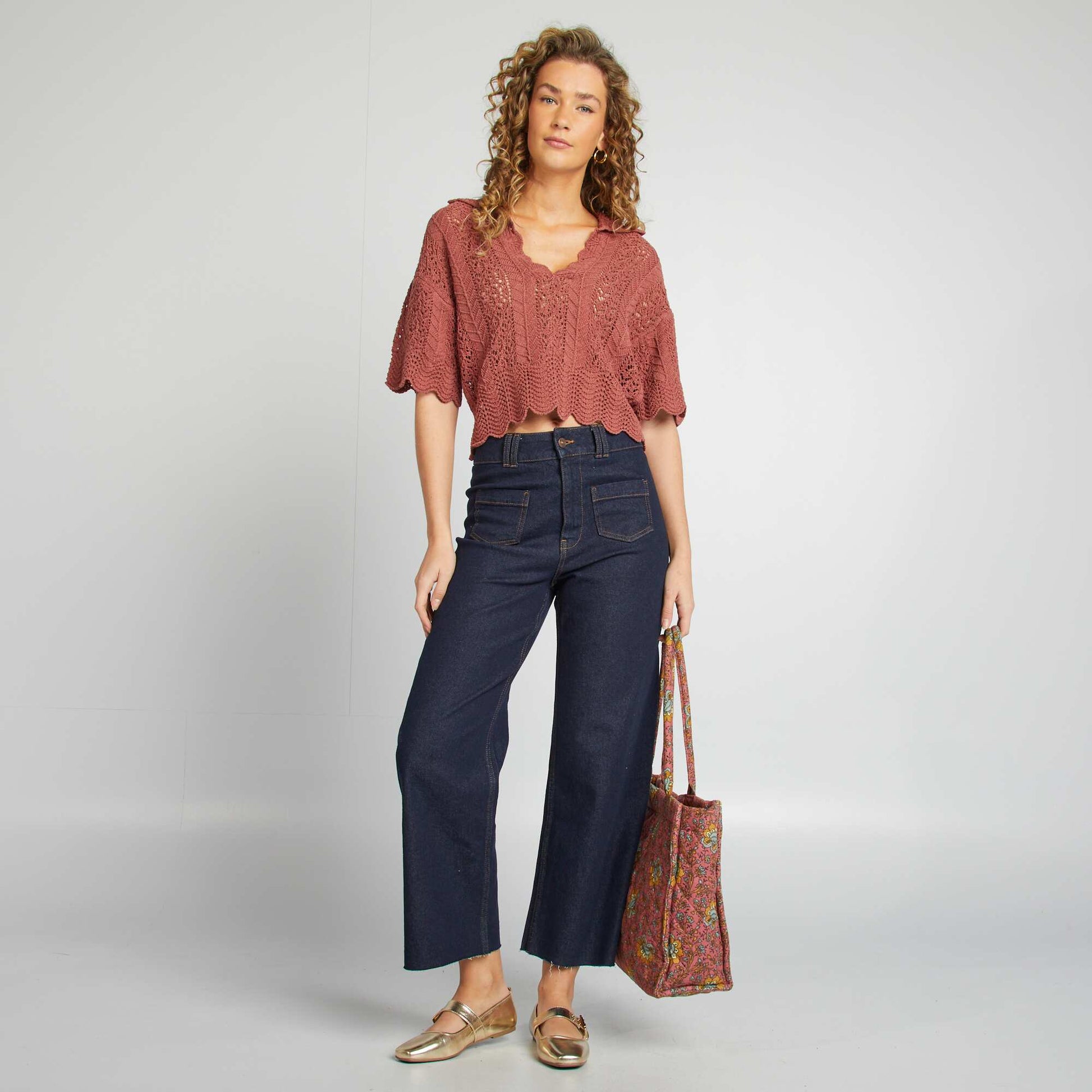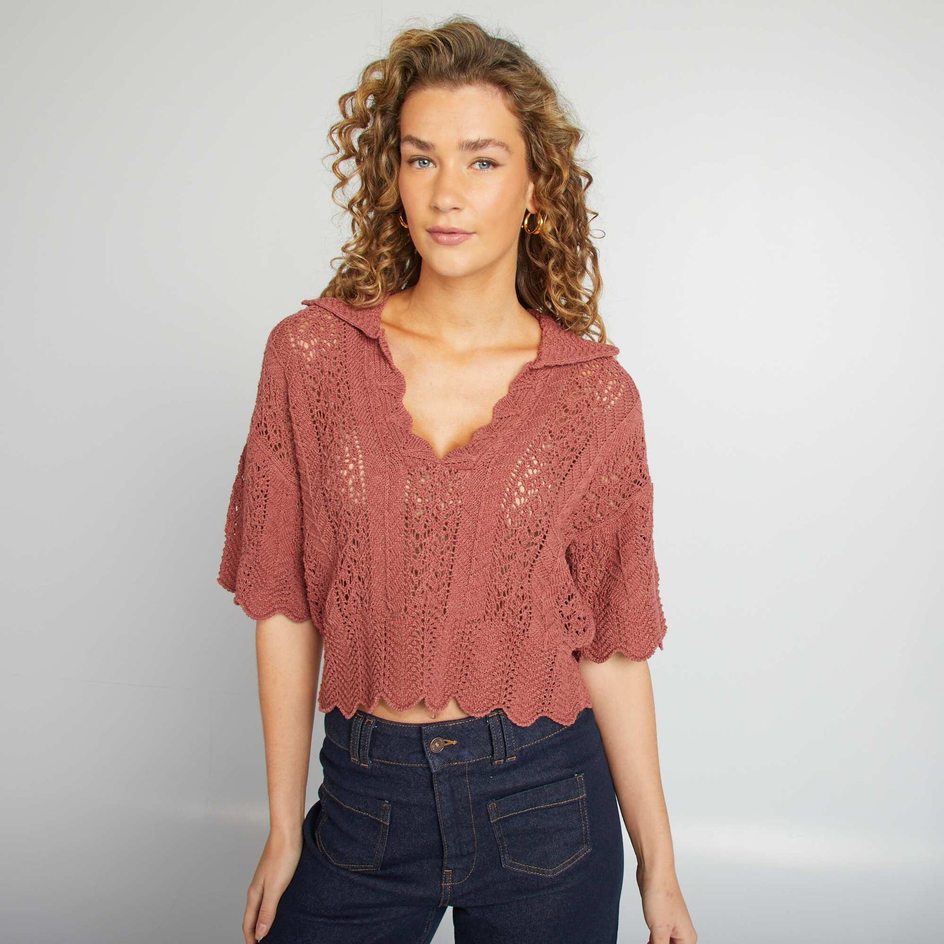 Ajoutez une touche bohème à votre style ! - Pull ajouré col polo - Col V - Manches courtes - Couleur unie - Longueur du dos : 52 cm - Notre mannequin porte une taille S et mesure 1m75