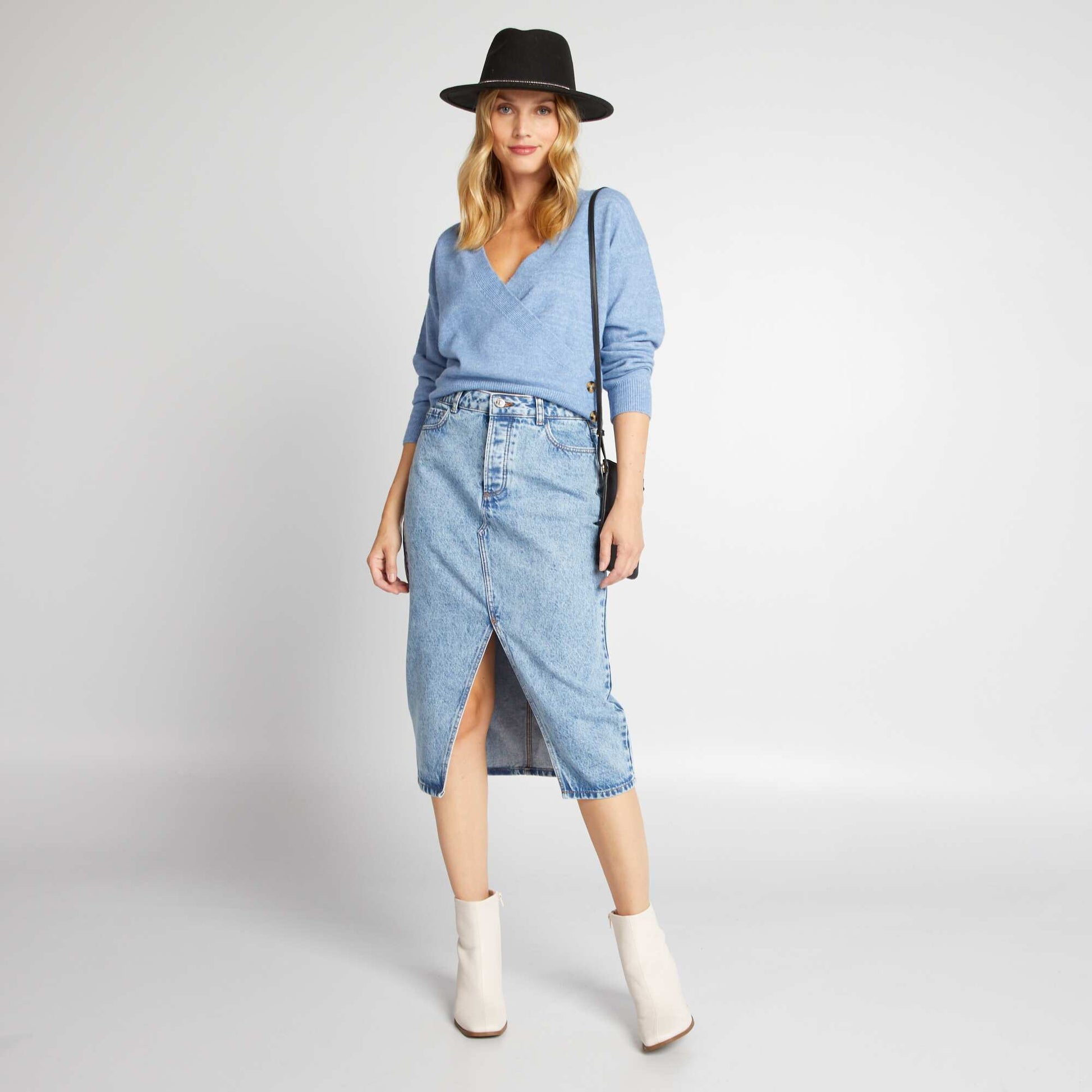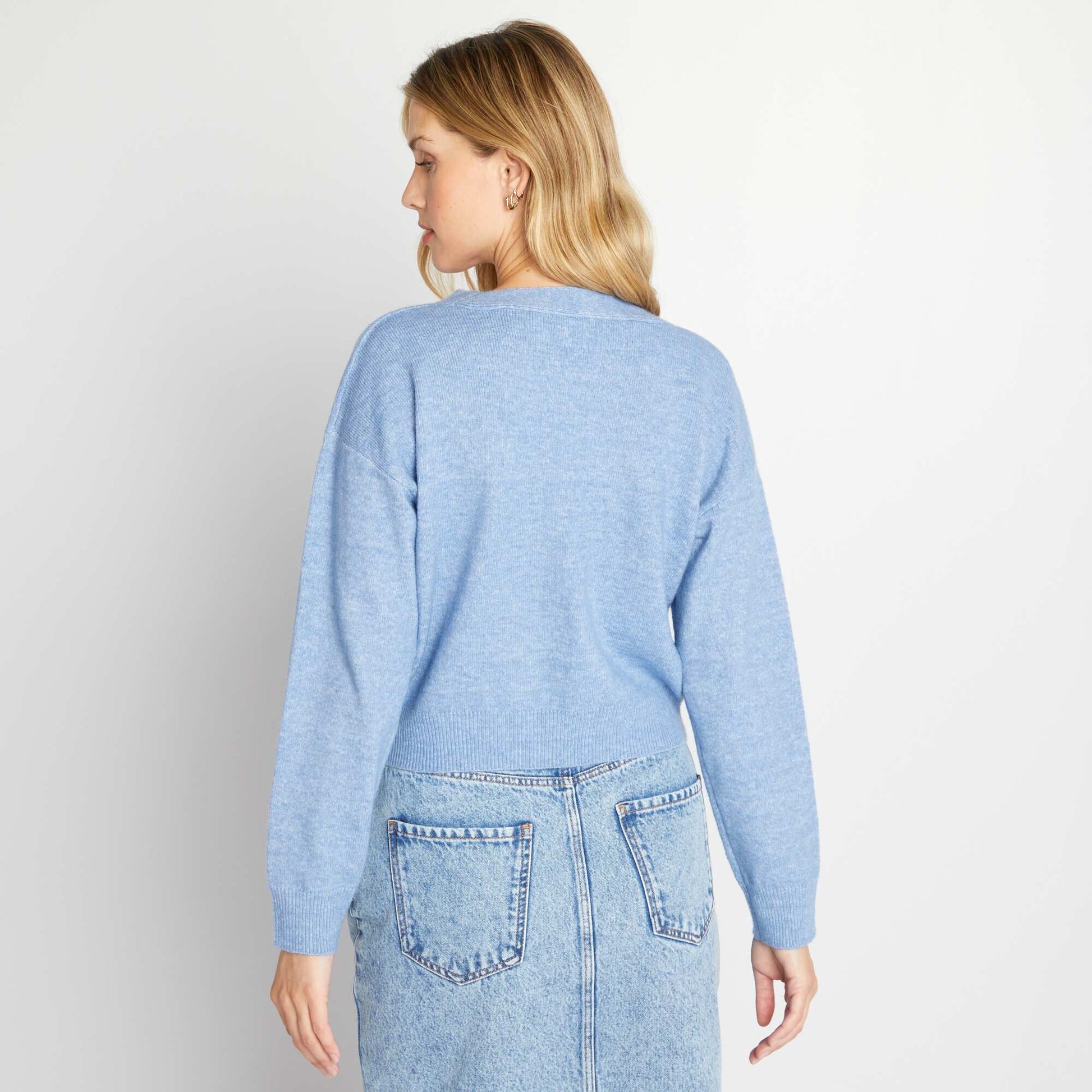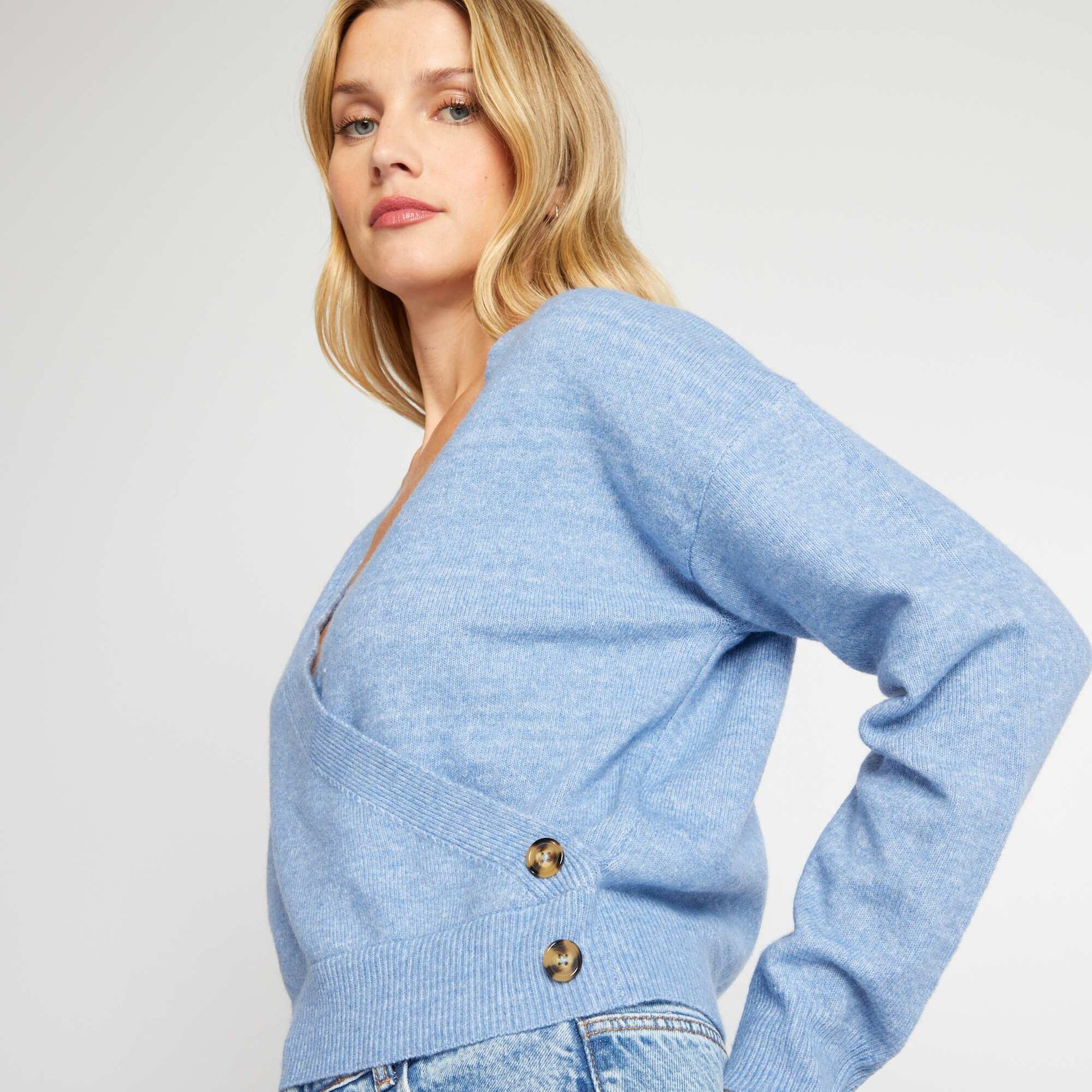 Ce pull est la pi ce indispensable pour rendre plus habill e votre tenue. - Pull - En maille - Encolure cache-c ur - Manches longues - Finitions bords-c tes - 2 boutons fantaisies la base - Longueur dos : 48 cm environ - Notre mannequin porte une taille M et mesure 1m75