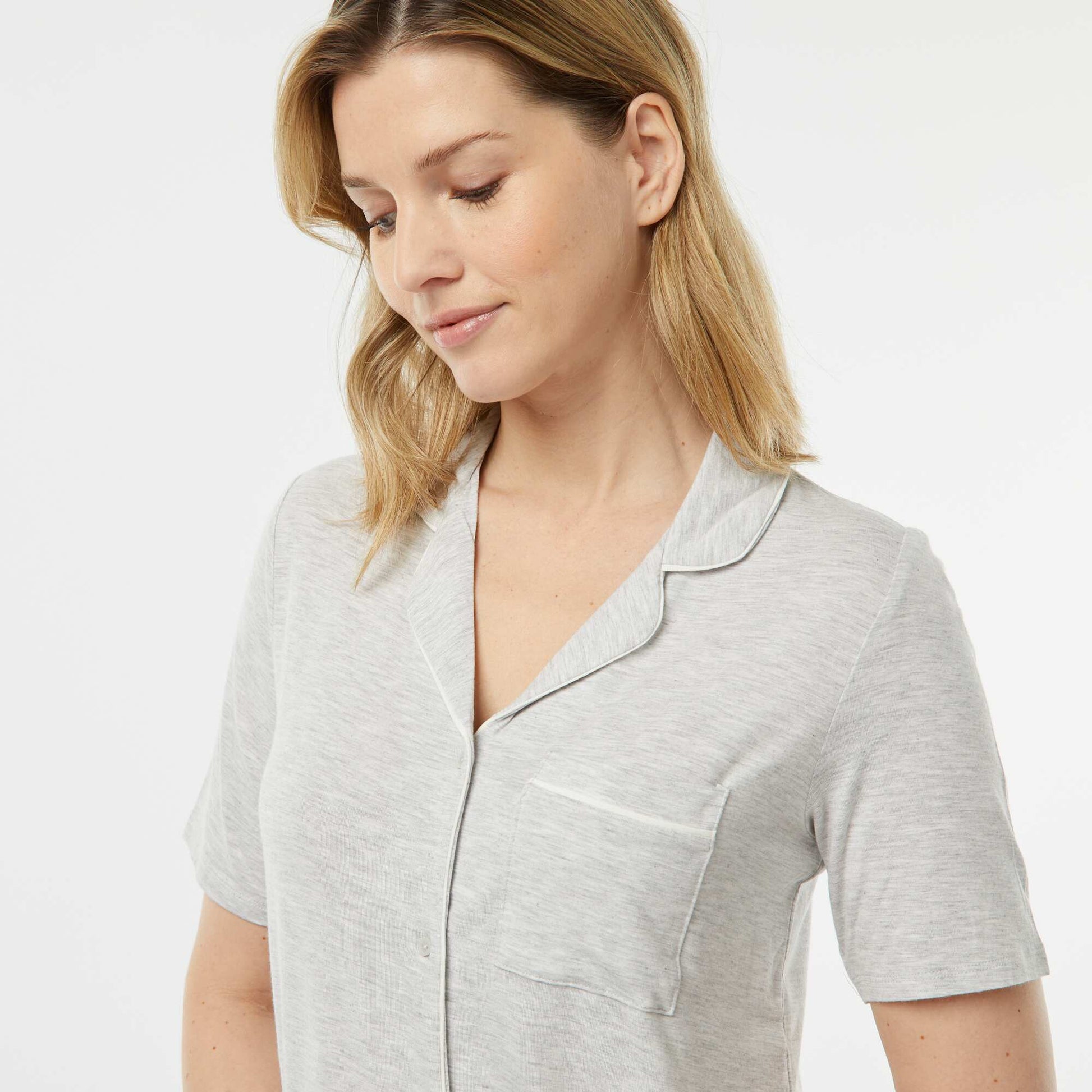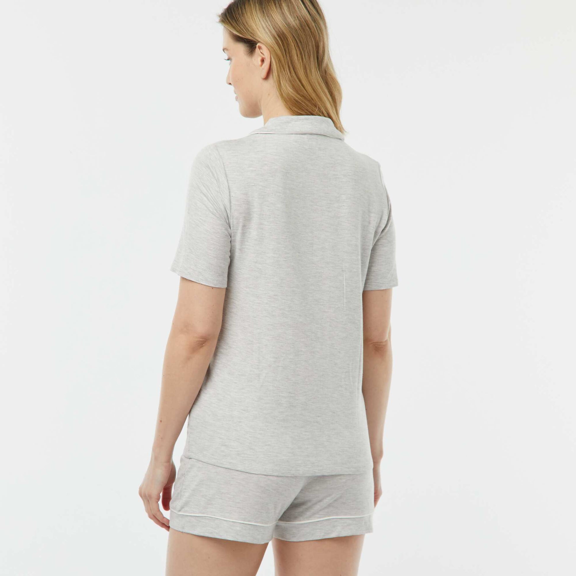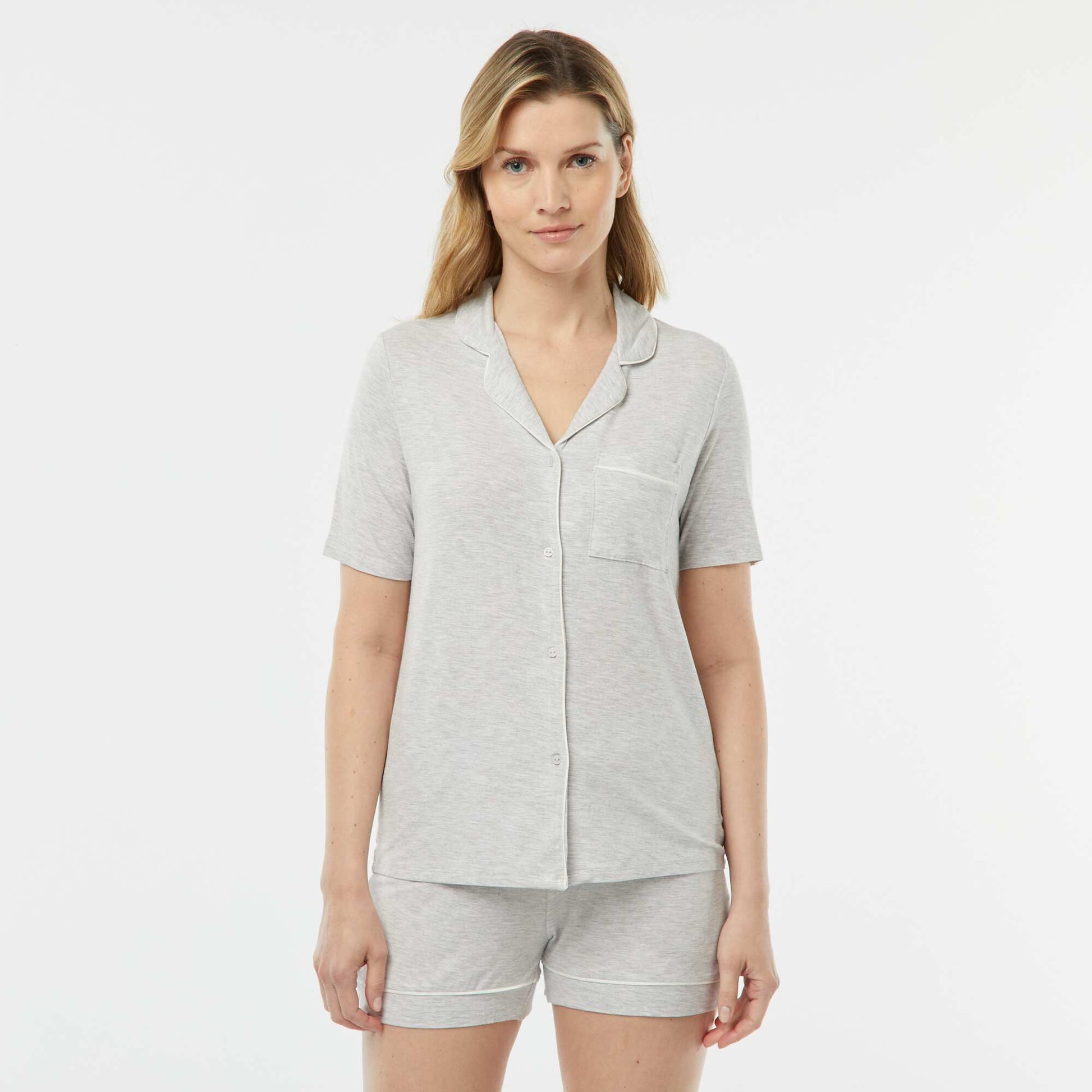 Le pyjama court 2 pièces qui apporte un maximum de style pour vos nuits ! - Pyjama court - Matière fluide - Tee-shirt uni - Manches courtes - Col pyjama - Bords contrastés - Ouverture boutonnée - Short assorti - Taille élastique - Bords sur la base - Notre mannequin porte une taille S et mesure 1m75
