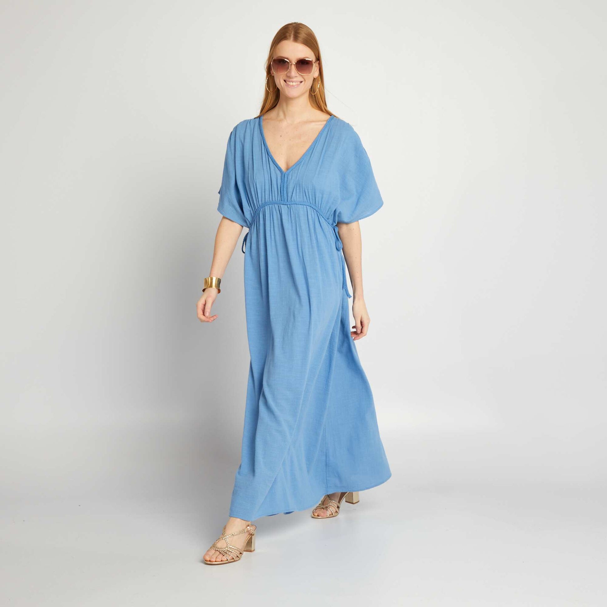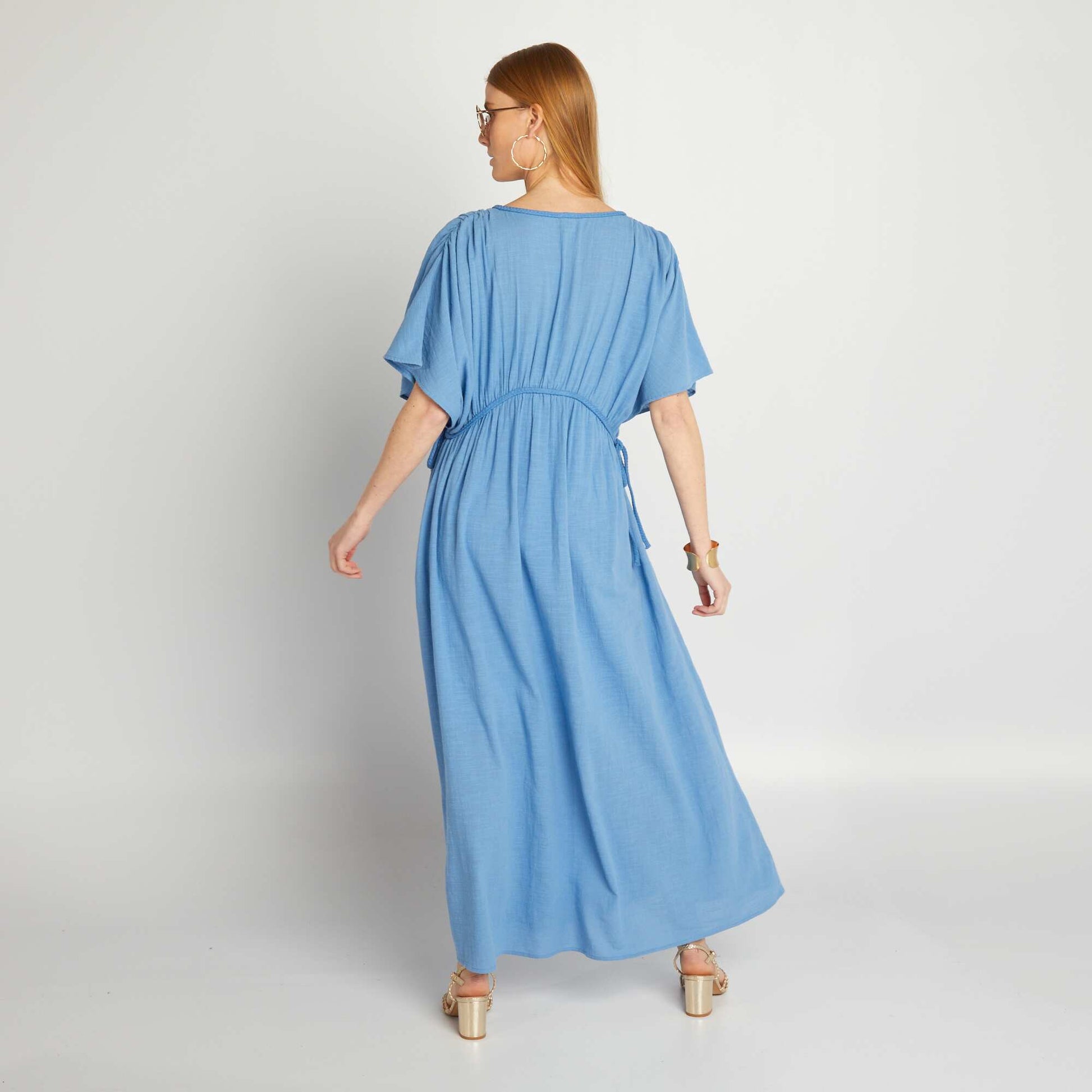 Une jolie robe longue et l g re qui saura vous sublimer l'arriv e des beaux jours. - Robe longue - En double gaze de coton - Coupe longue vas e - Col V - Manches courtes larges - Taille marqu e - Cordon de serrage des deux c t s - Couleur unie - Notre mannequin porte une taille M et mesure 1m75