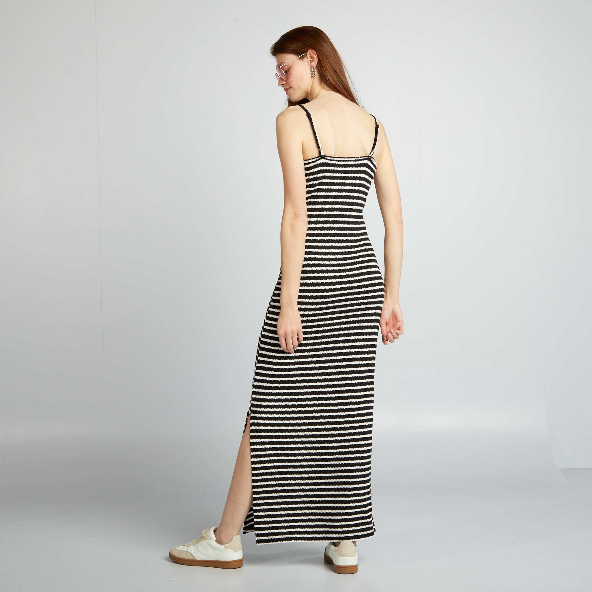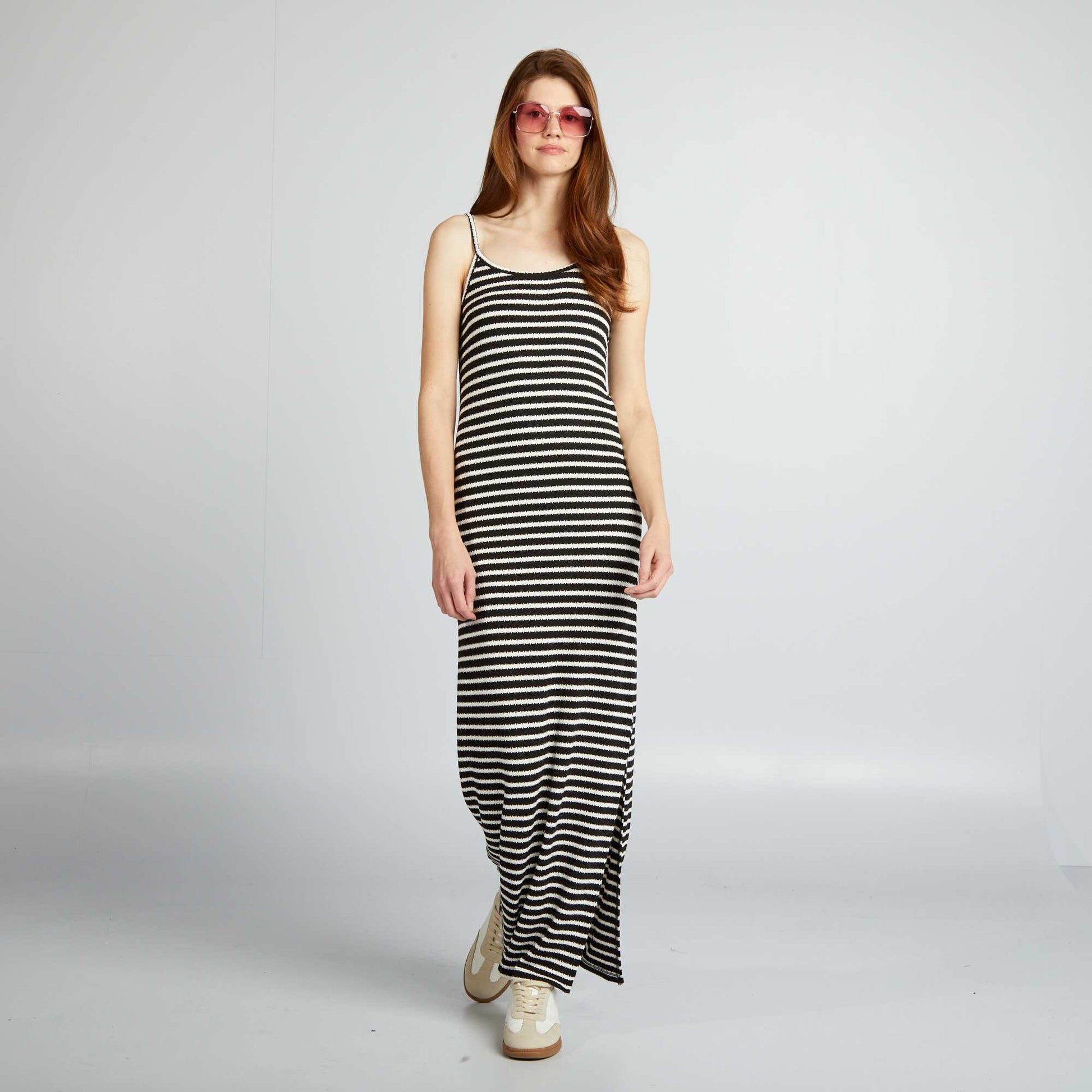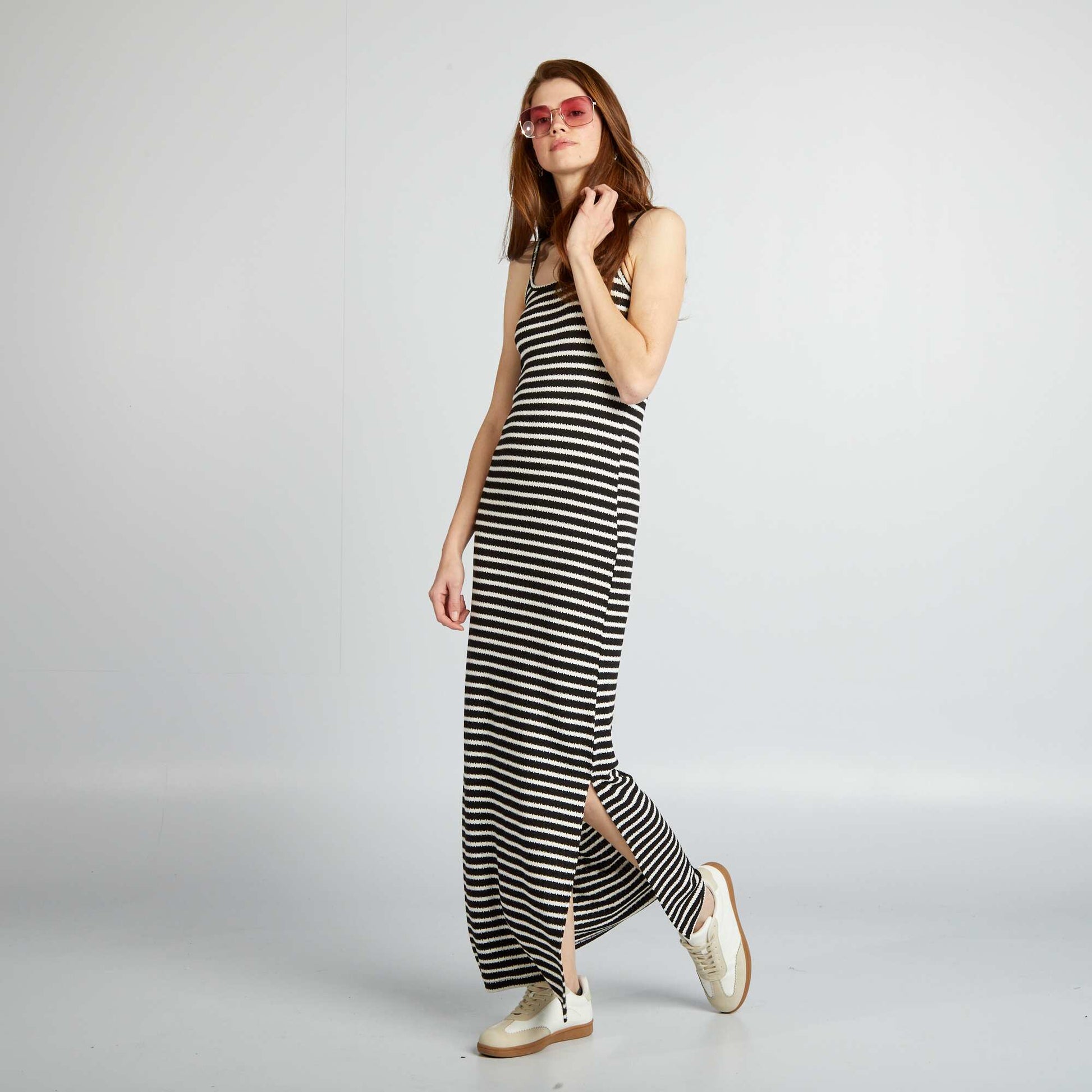 Avec cette robe, votre look est fait en seulement quelques secondes. - Robe longue ray e en maille - Fines bretelles r glables - Col rond - Longueur du dos : 130 cm environ - Notre mannequin porte une taille S et mesure 1m76