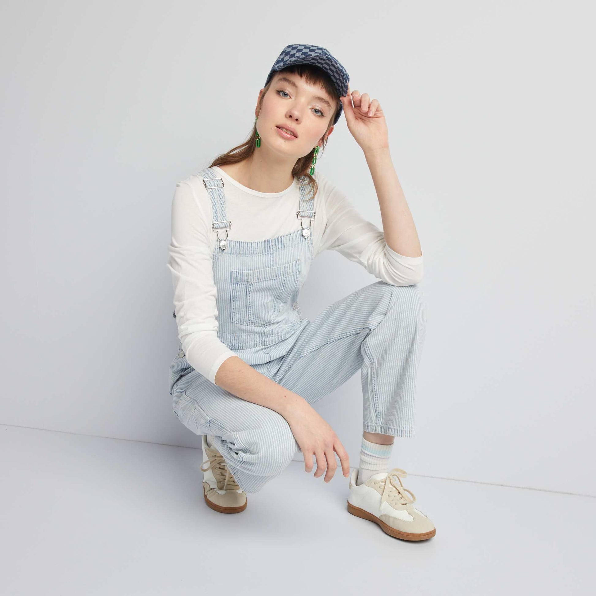 Donnez une nouvelle dimension votre garde-robe avec cette salopette en jean la coupe large. Ses rayures all-over insufflent un vent de fra cheur et d'originalit , parfait pour celles qui cherchent allier confort et style. - Salopette en jean - Coupe large / Wide leg - Bretelles avec ouverture par pressions m tallique - 1 poche poitrine - 2 poches devant - 1 poche plaqu e droite - Ray all over - Longueur entrejambe : 75 cm environ - Largeur bas de jambe : 21 cm environ - Notre mannequin porte une taille 36 et mesure 1m76