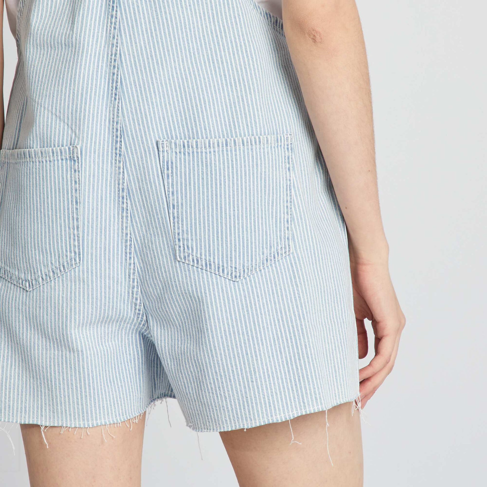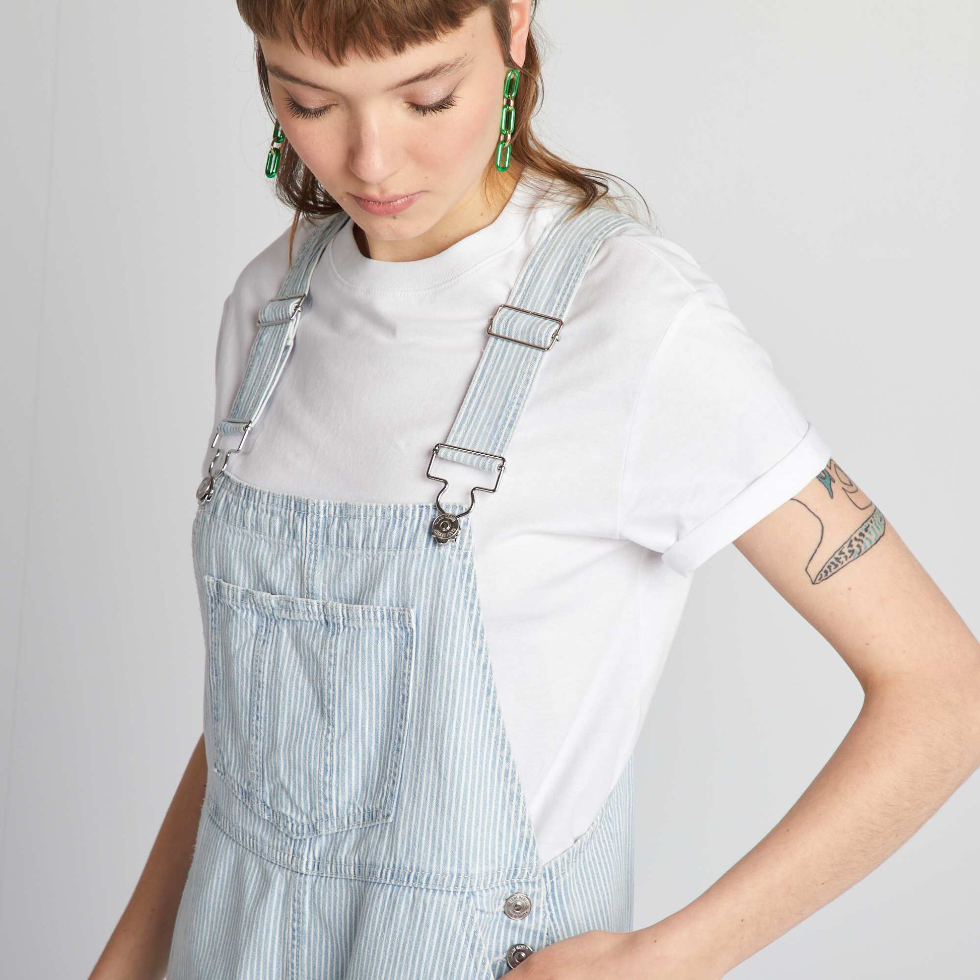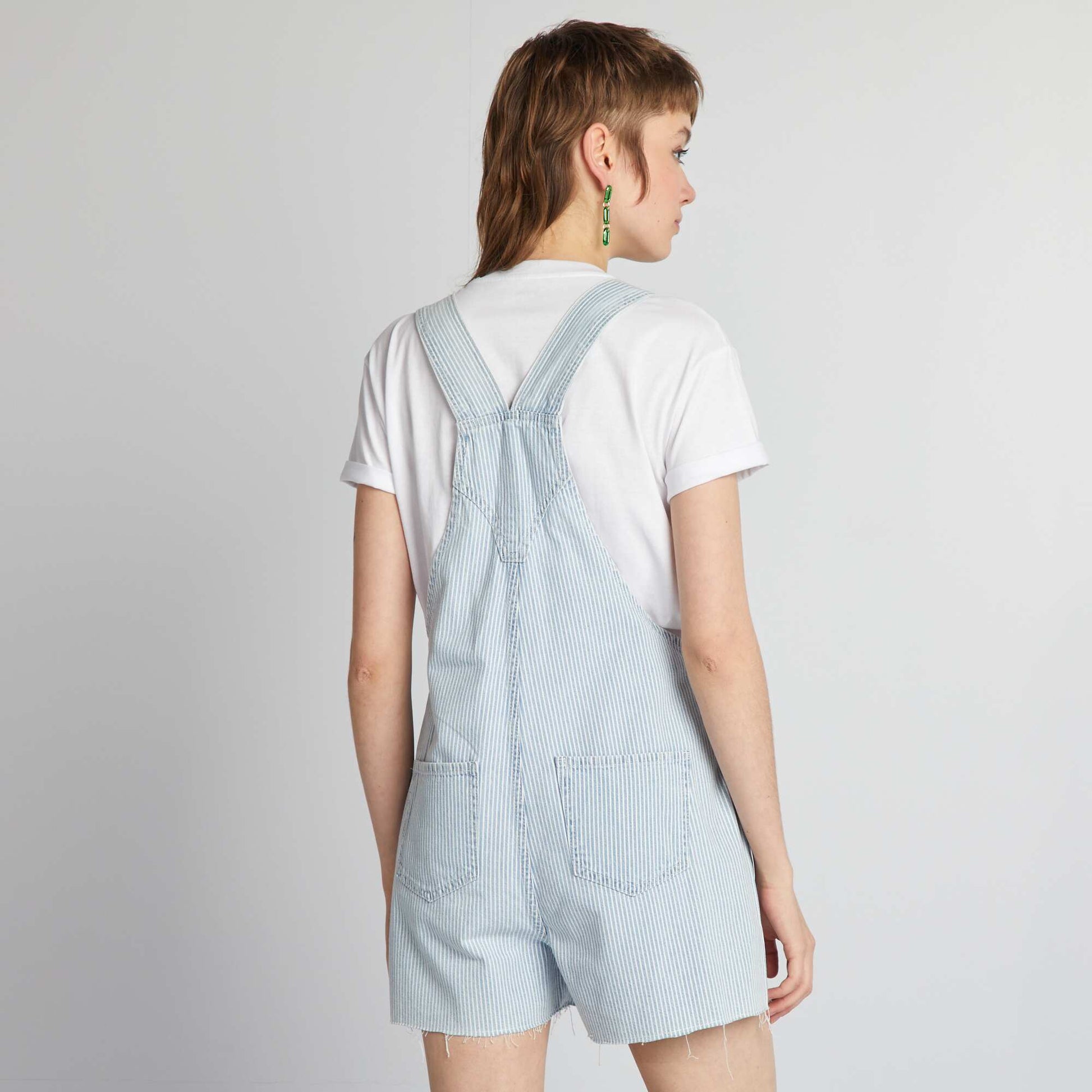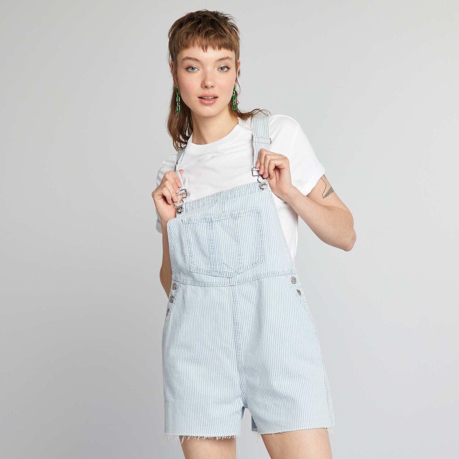 Une salopette fra che qui donne du caract re la tenue ! - Salopette short en jean rayures - Ouverture boutonn e - Bretelles larges et r glables - 2 poches plaqu es devant - 1 poche poitrine - 2 poches au dos - Rayures fines all-over - Longueur du dos : 78 cm - Notre mannequin porte une taille S et mesure 1m76