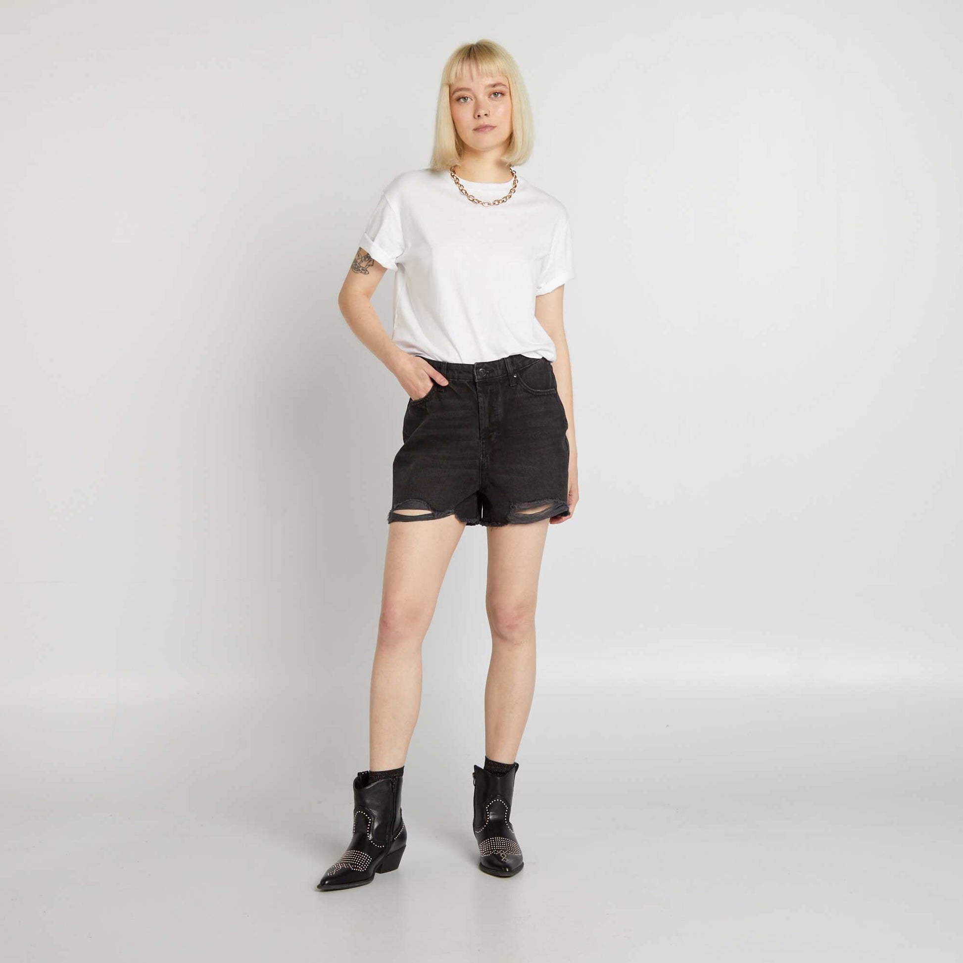 Le short longueur mi-cuisse est la tendance de cet t ! - Short en jean destroy - Taille haute - En coton - Ouverture boutonn e - 2 poches + 1 ticket - 2 poches au dos - Passants pour ceinture - D chirure en bas de jambe - Longueur entrejambe : 9 cm - Largeur bas de jambe : 30 cm - Notre mannequin porte une taille S et mesure 1m75
