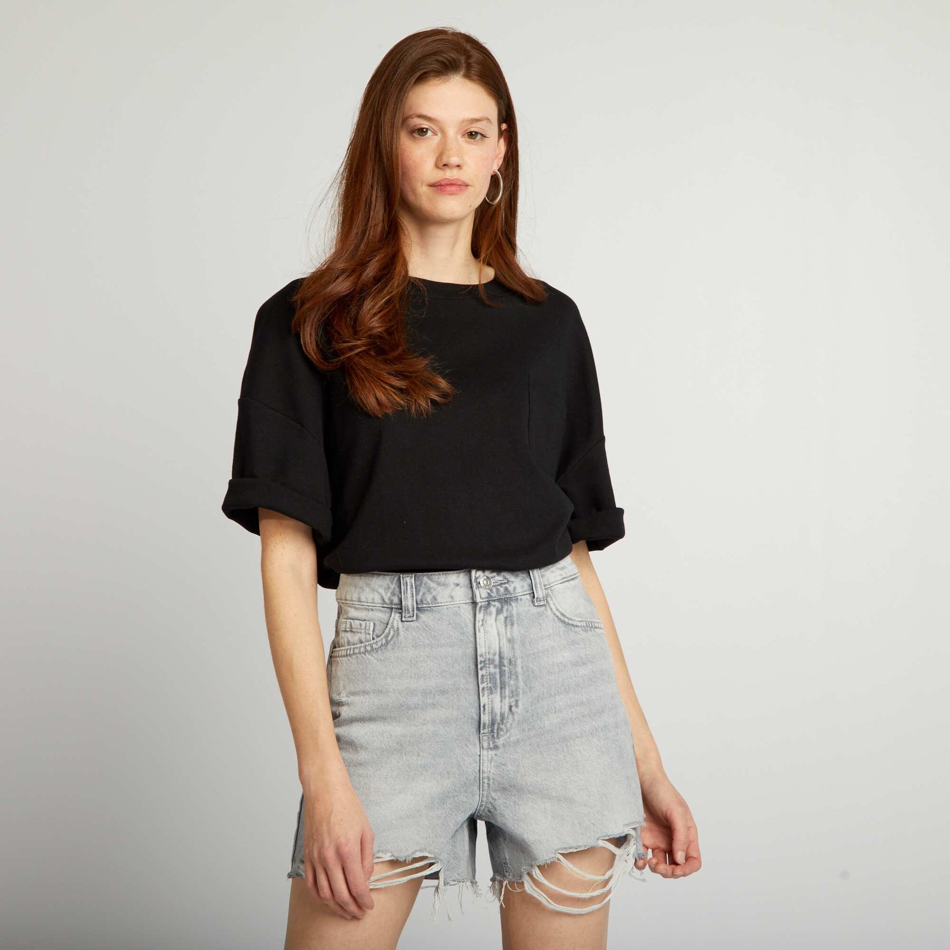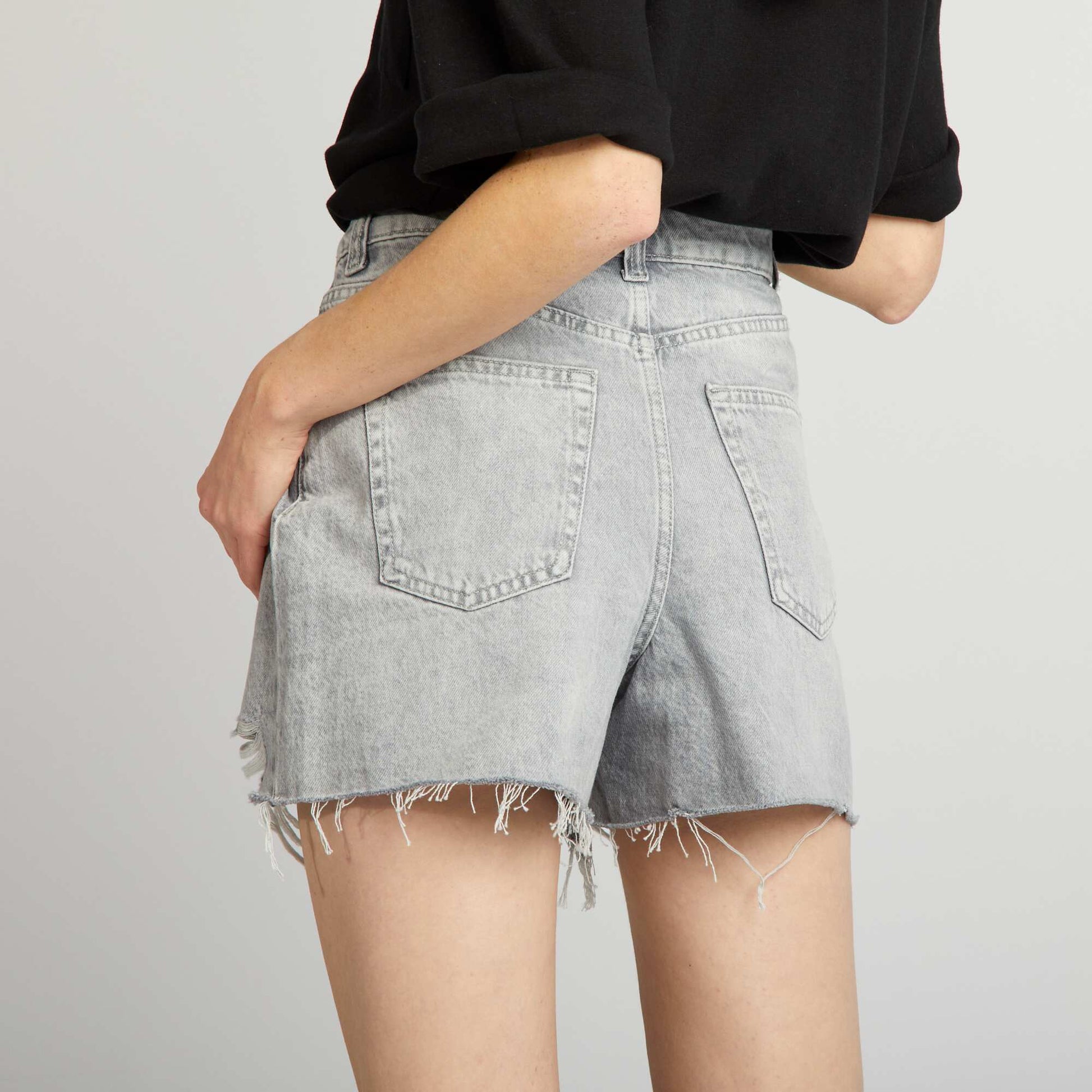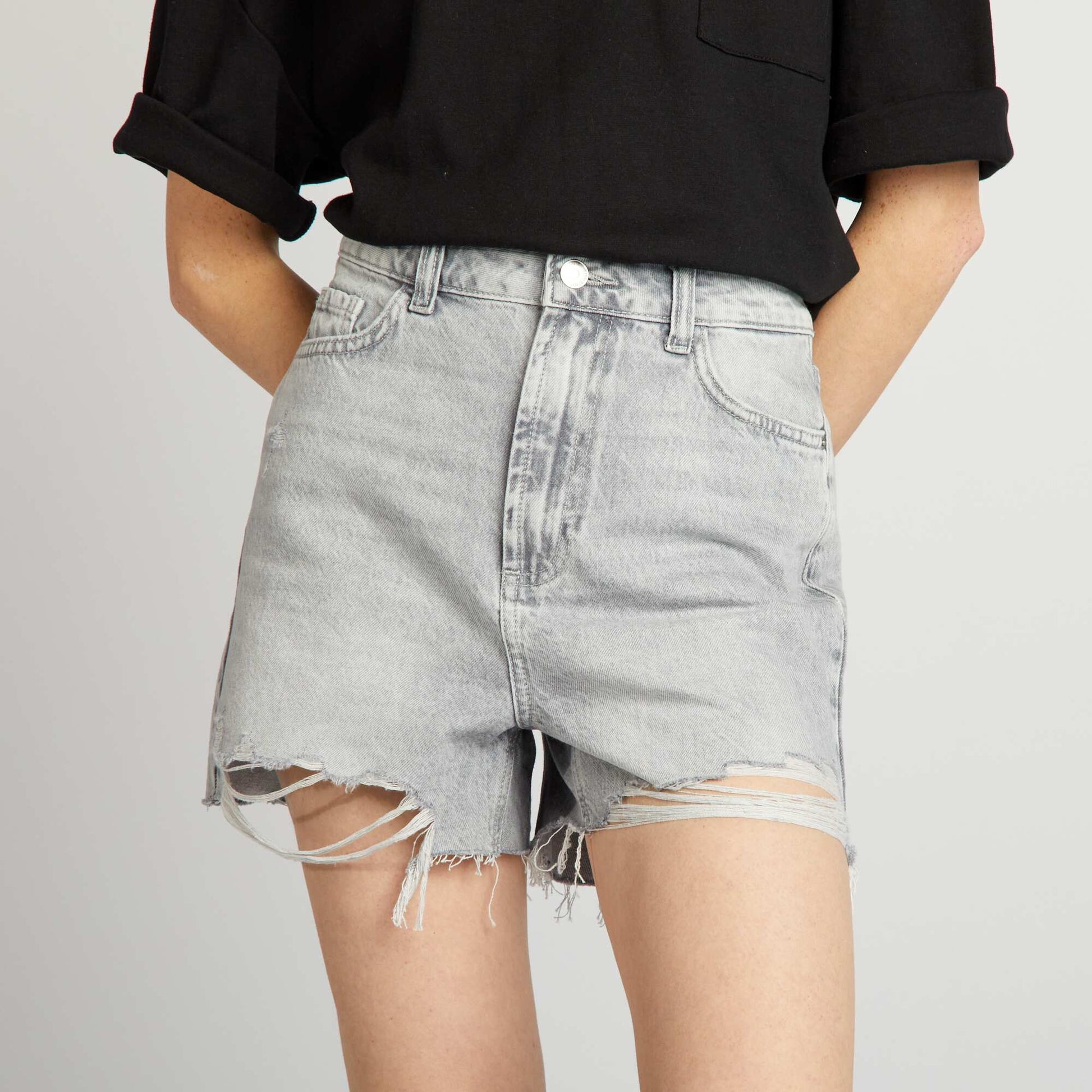 Optez pour ce short en jean avec quelques d chirures pour un look moins classique. - Short en jean taille haute - Ouverture zipp e et boutonn e - Passants pour ceinture - 5 poches - Longueur entrejambe : 9 cm - Largeur bas de jambe : 26 cm - Notre mannequin porte une taille S et mesure 1m75