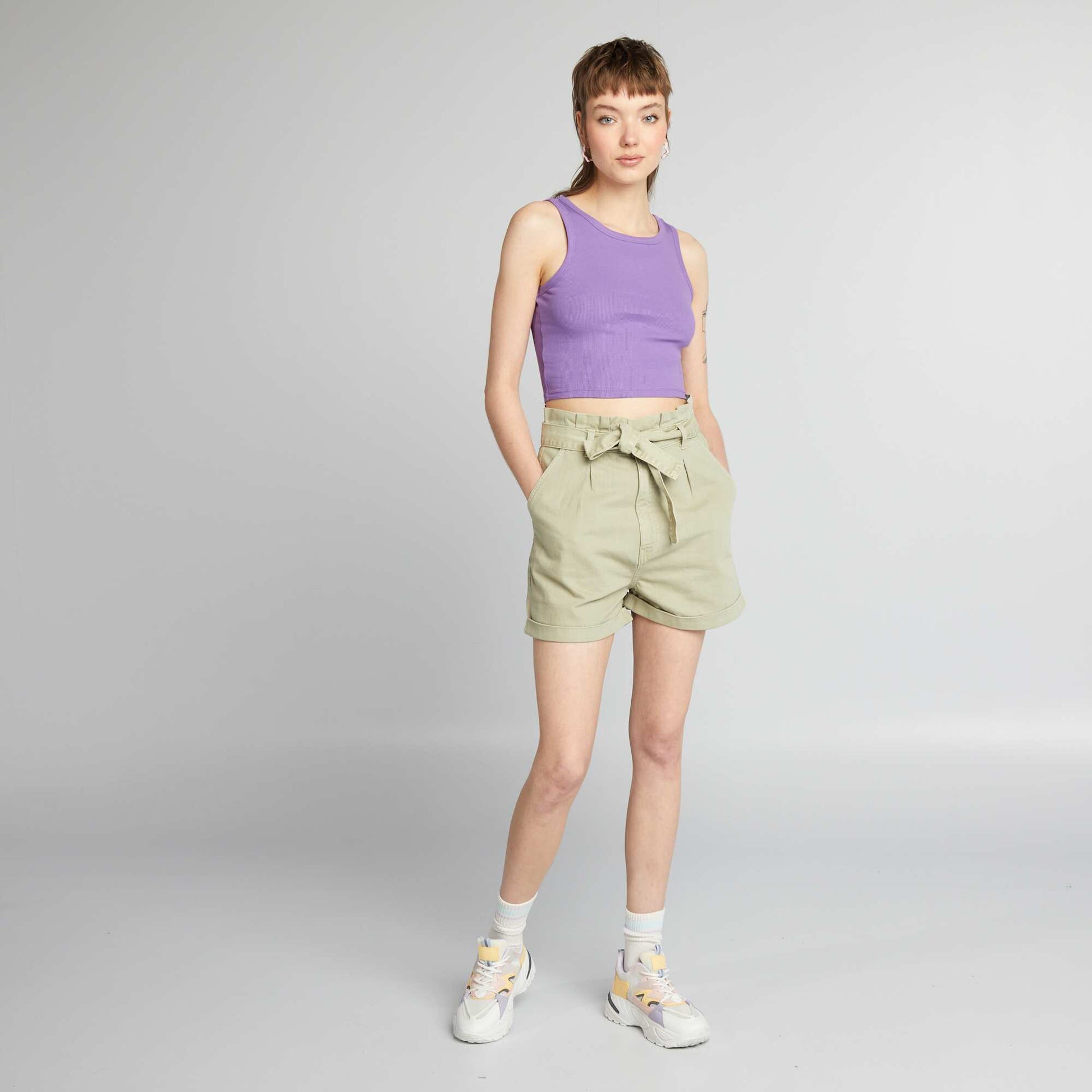 Ce short en twill, avec sa ceinture nouer sous passants, allie l gance et d contraction. Les pinces l'avant structurent la silhouette, tandis que l'ourlet la base apporte une finition soign e. Parfait pour cr er des looks estivaux sophistiqu s avec une touche de l g ret . - Short en twill - Ceinture sous passant nouer - 2 poches devant - Pinces l'avant - Ourlet la base - Longueur entrejambe : 6 cm environ - Largeur bas de jambe : 30 cm environ - Notre mannequin porte une taille 36 et mesure 1m75