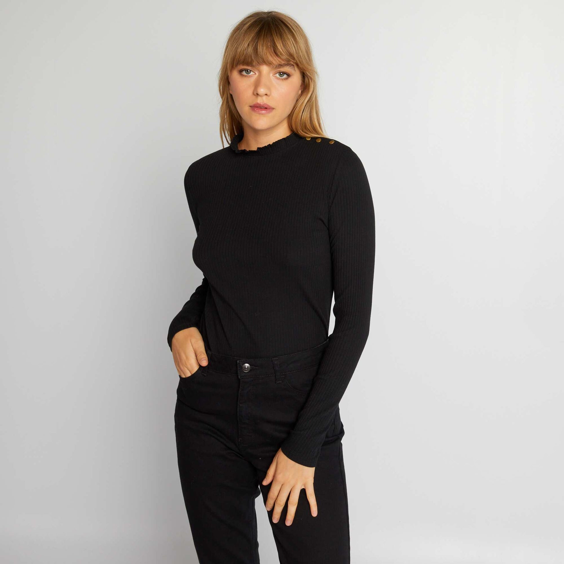 Ne manquez pas ce t-shirt pour femme manches longues ! - T-shirt en maille c tel e - Col montant - Manches longues - Ouverture par boutons l'emmanchure - Couleur unie - Longueur dos : 57 cm environ - Notre mannequin porte une taille M et mesure 1m75