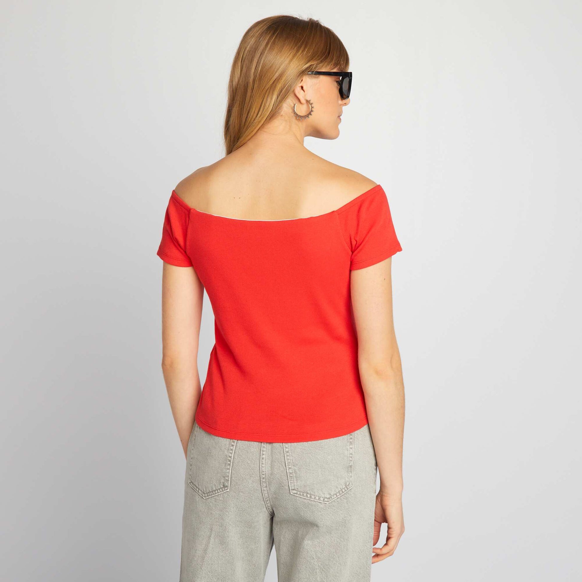 Un tee-shirt avec un col bardot, en maille c tel e. On adore - T-shirt c tel - En coton - Col bardot - Manches courtes - Couleur unie - Longueur dos : 40 cm environ - Notre mannequin porte une taille S et mesure 1m76