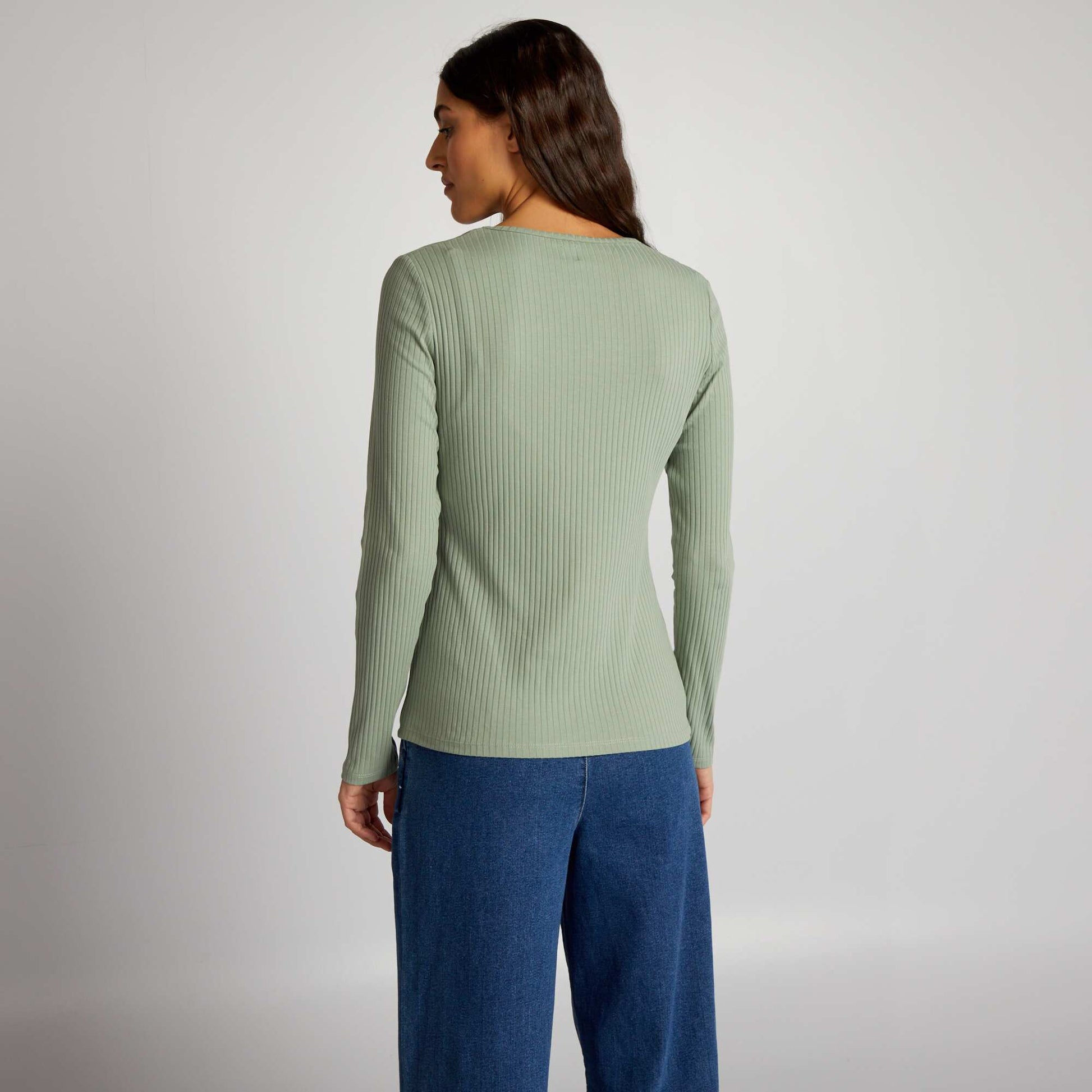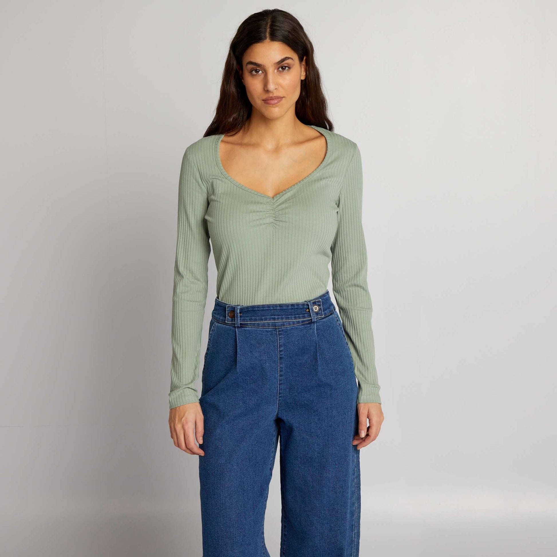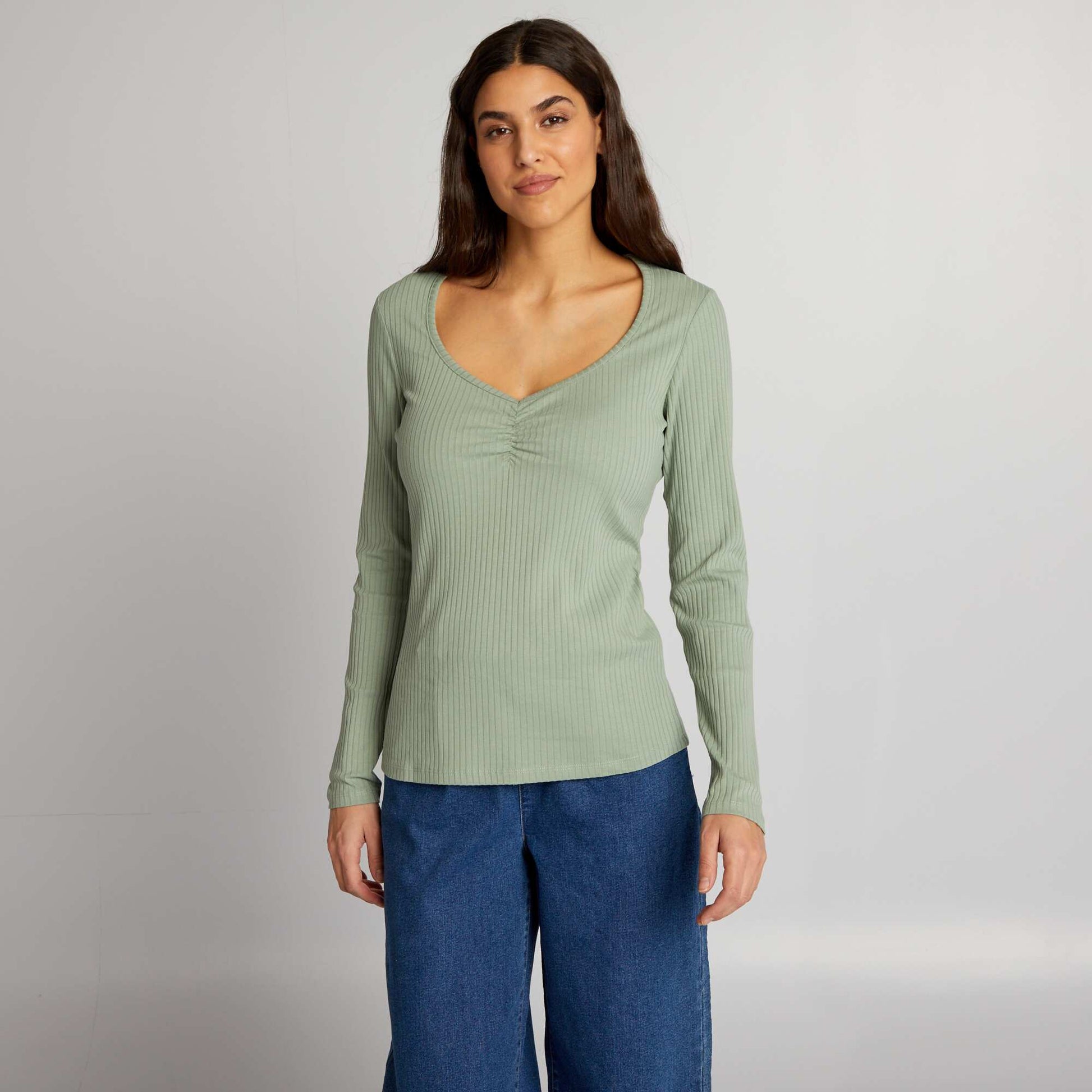 Ce tee-shirt, c'est la pi ce essentielle qui s'accorde tous vos looks ! - T-shirt c tel - Mati re stretch - Col V avec fronces - Manches longues - Couleur unie - Longueur dos : 56 cm environ - Notre mannequin porte une taille M et mesure 1m77