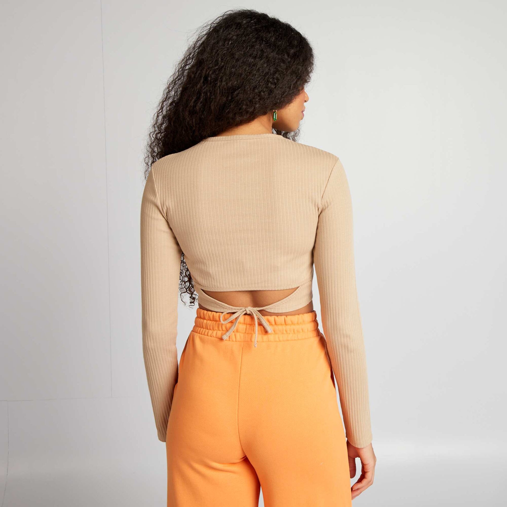 Un t-shirt cropped et c tel avec un n ud la base ! - T-shirt cropped c tel - Mati re stretch - Col rond - Manches longues - N ud la base - Longueur dos : 44 cm environ - Notre mannequin porte une taille S et mesure 1m75