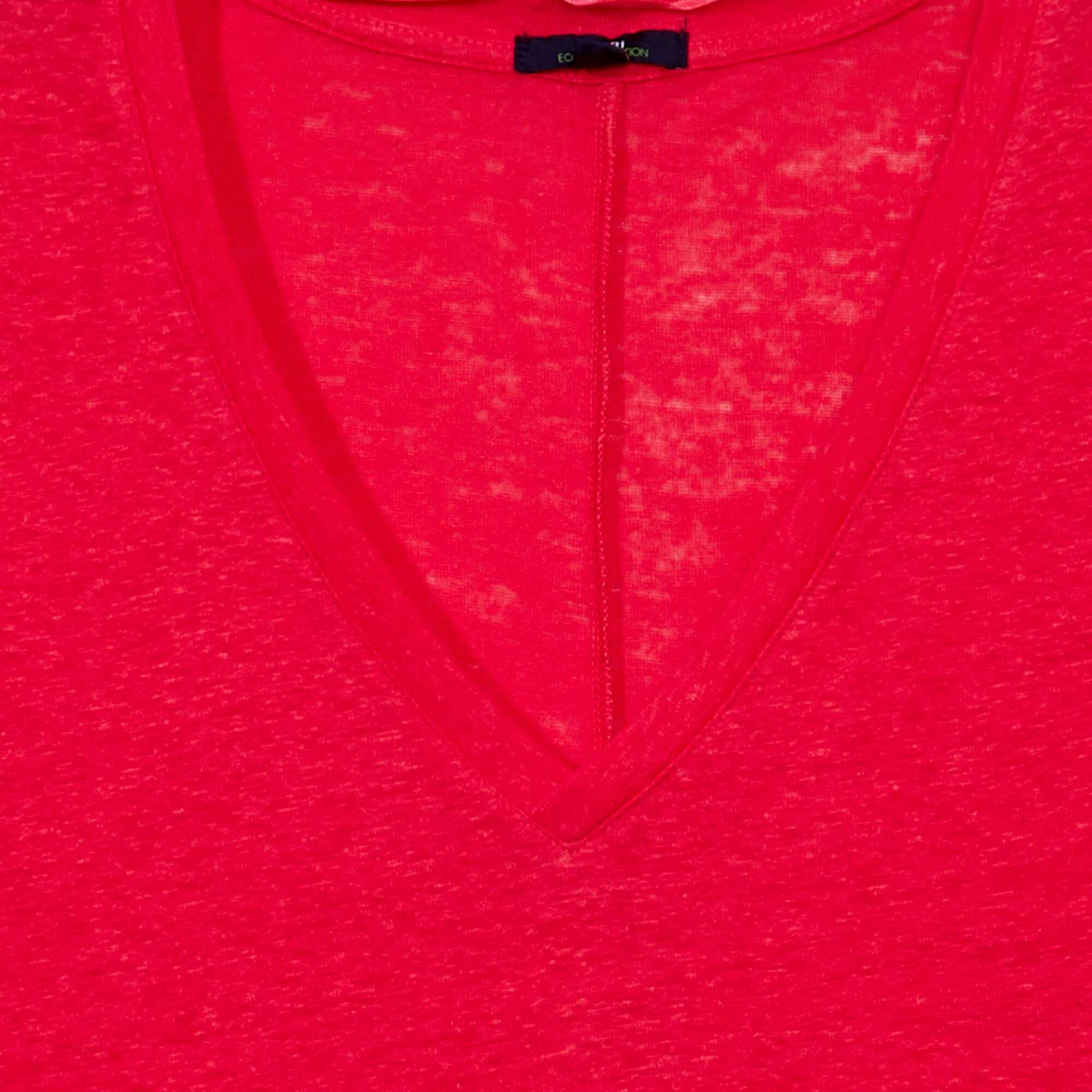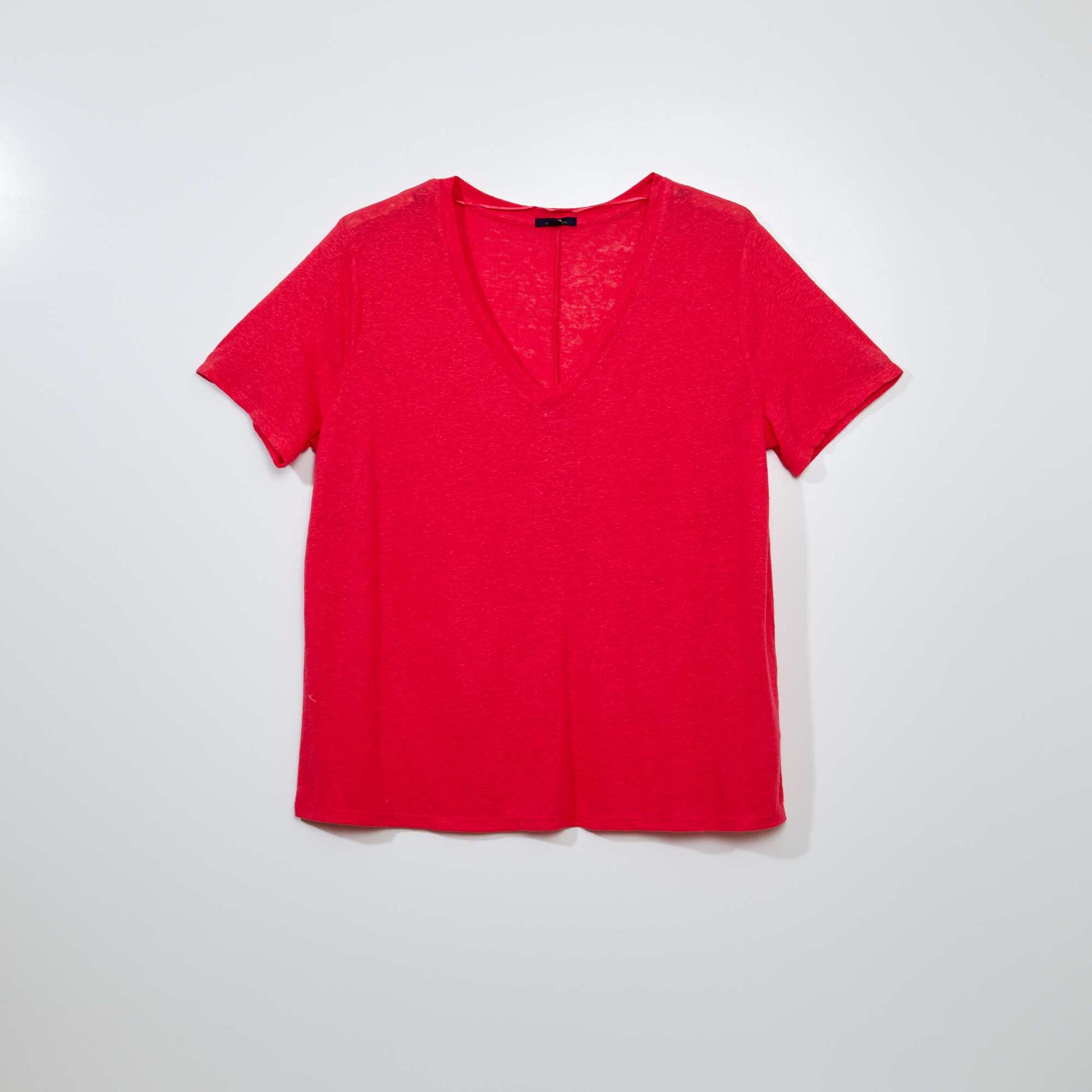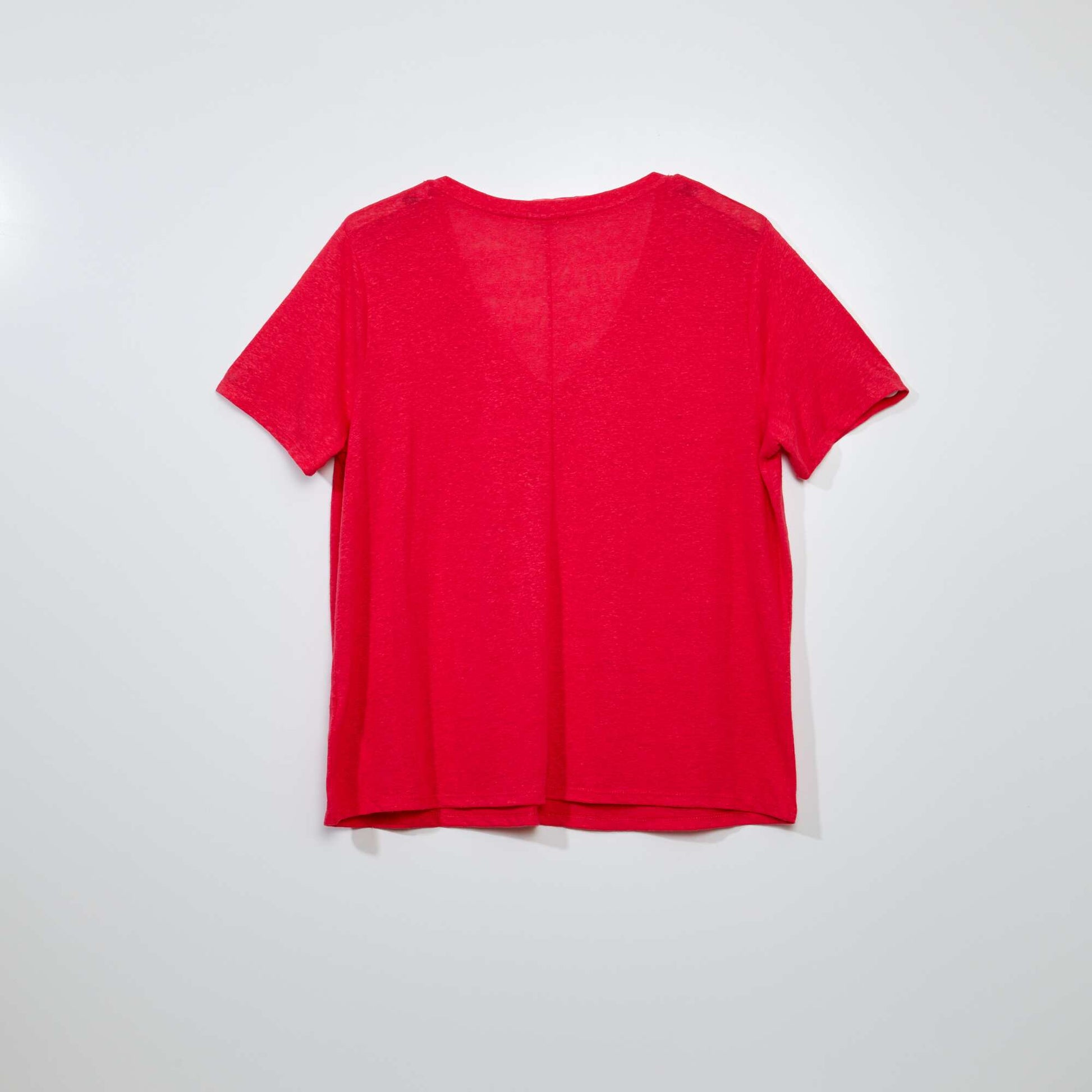 Un classique à porter facilement avec une jupe ou un jean ! - T-shirt en lin - Manches courtes - Encolure V - Longueur dos: 67 cm - Notre mannequin porte une taille XL et mesure 1m80