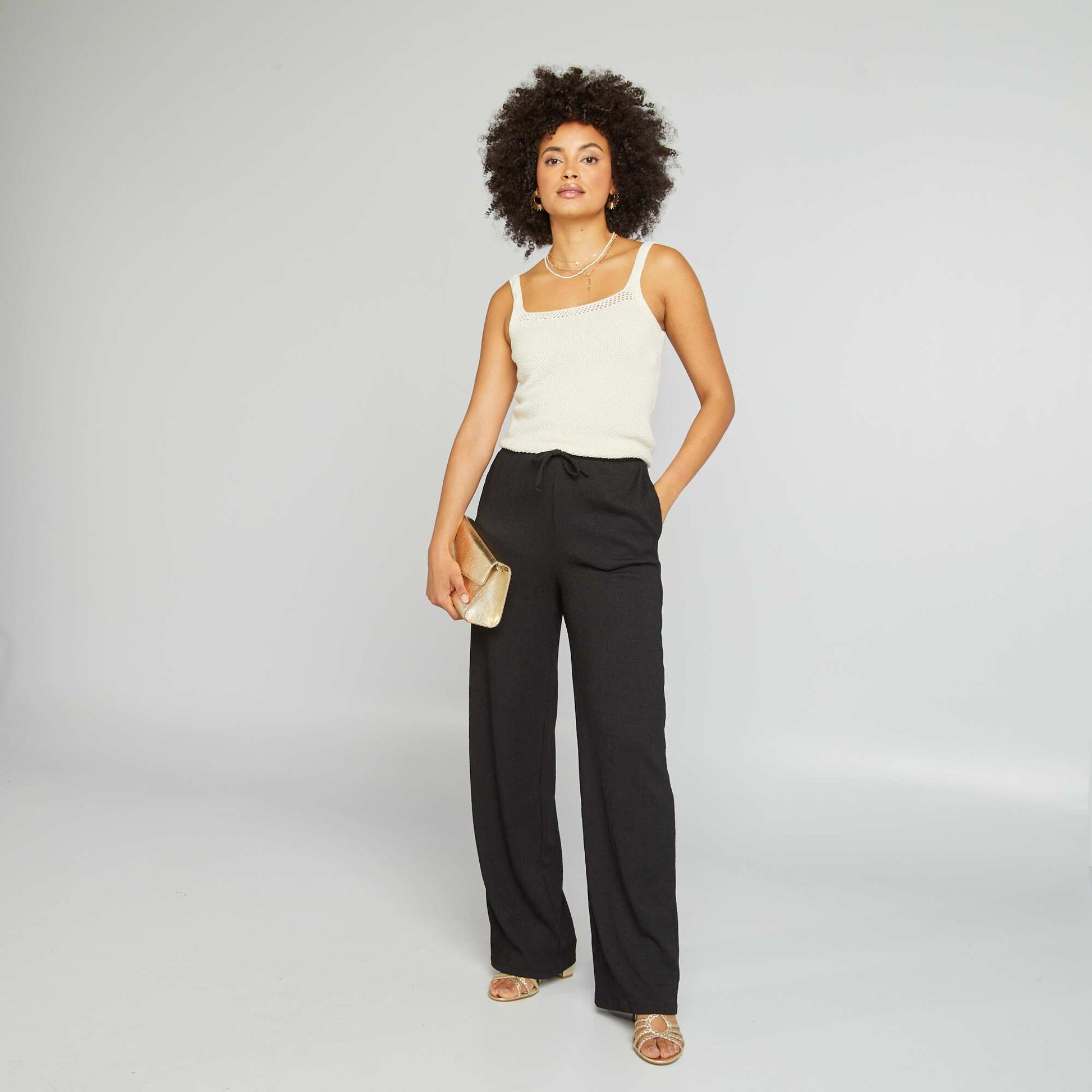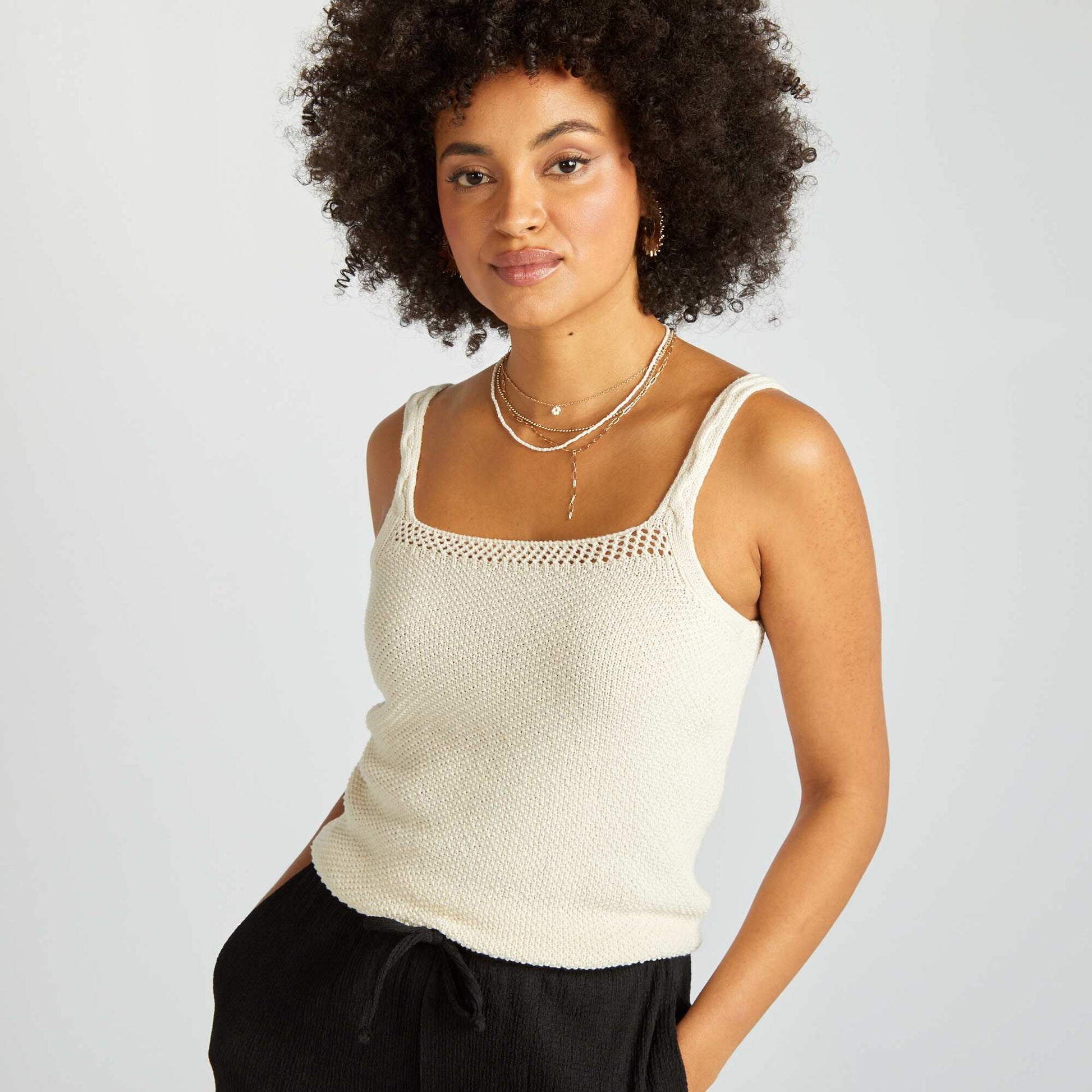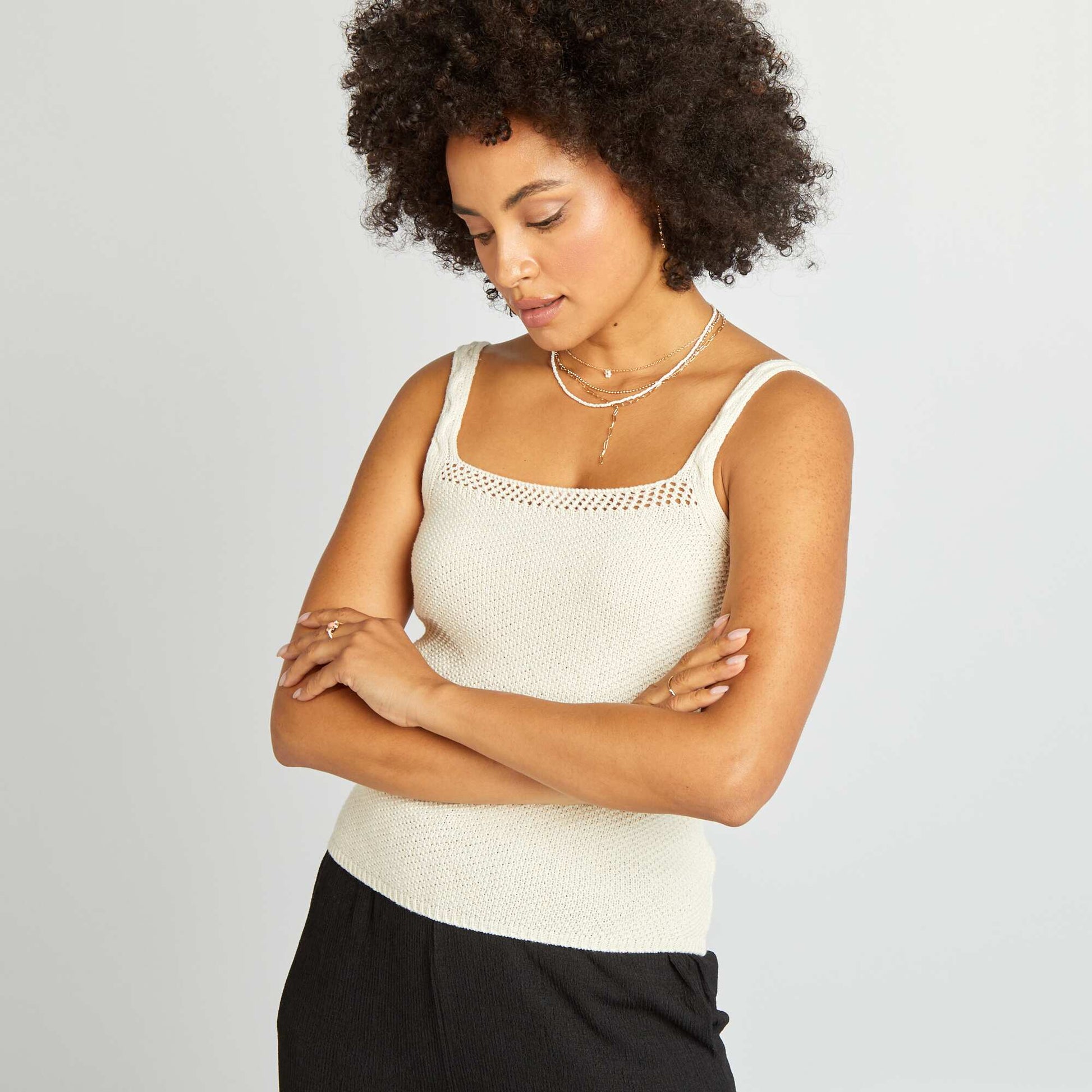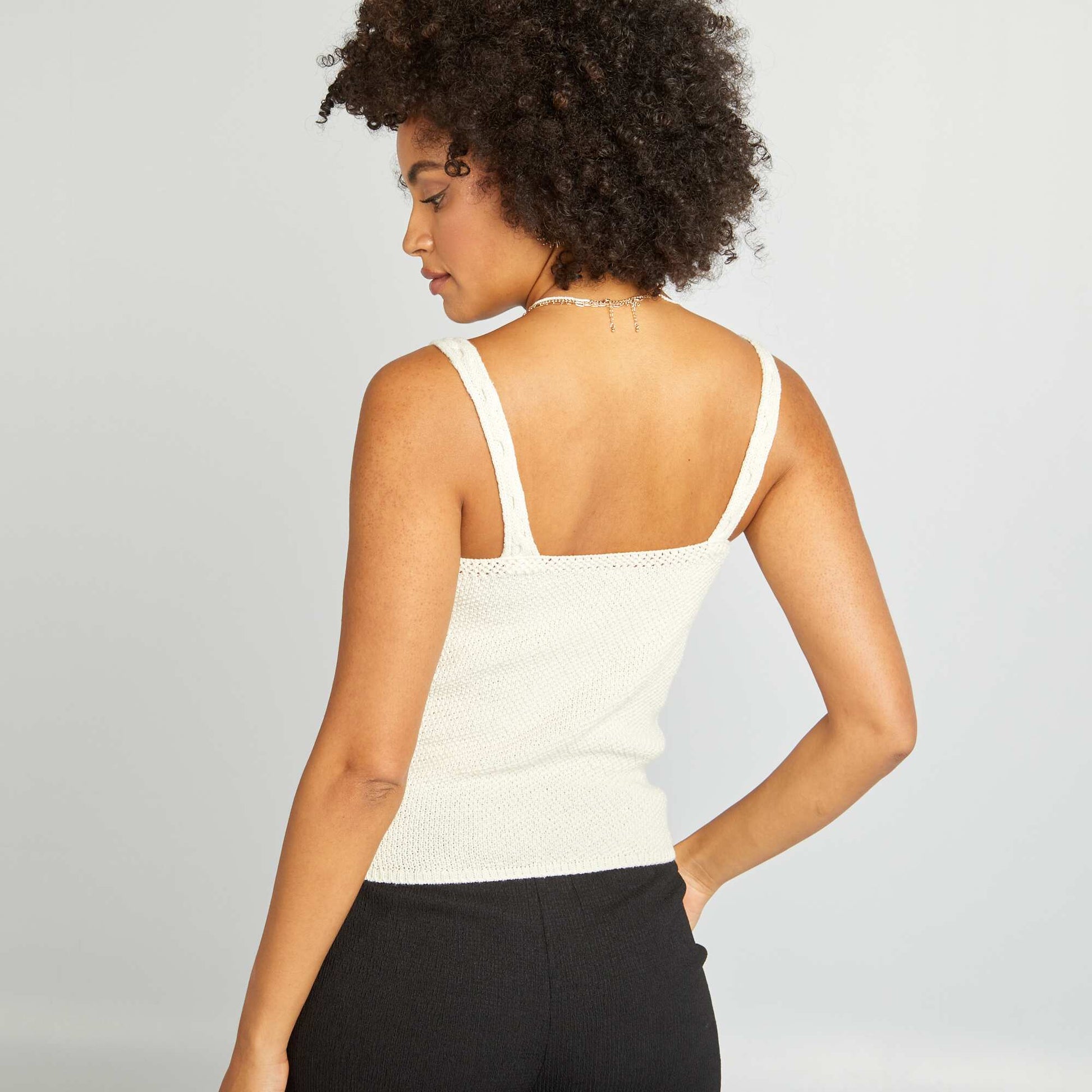 Un top discret avec un effet crochet tr s tendance. - Top en crochet - Avec fines bretelles - Bordure de col ajour e - Couleur unie - Longueur du dos : 53 cm - Notre mannequin porte une taille S et mesure 1m75