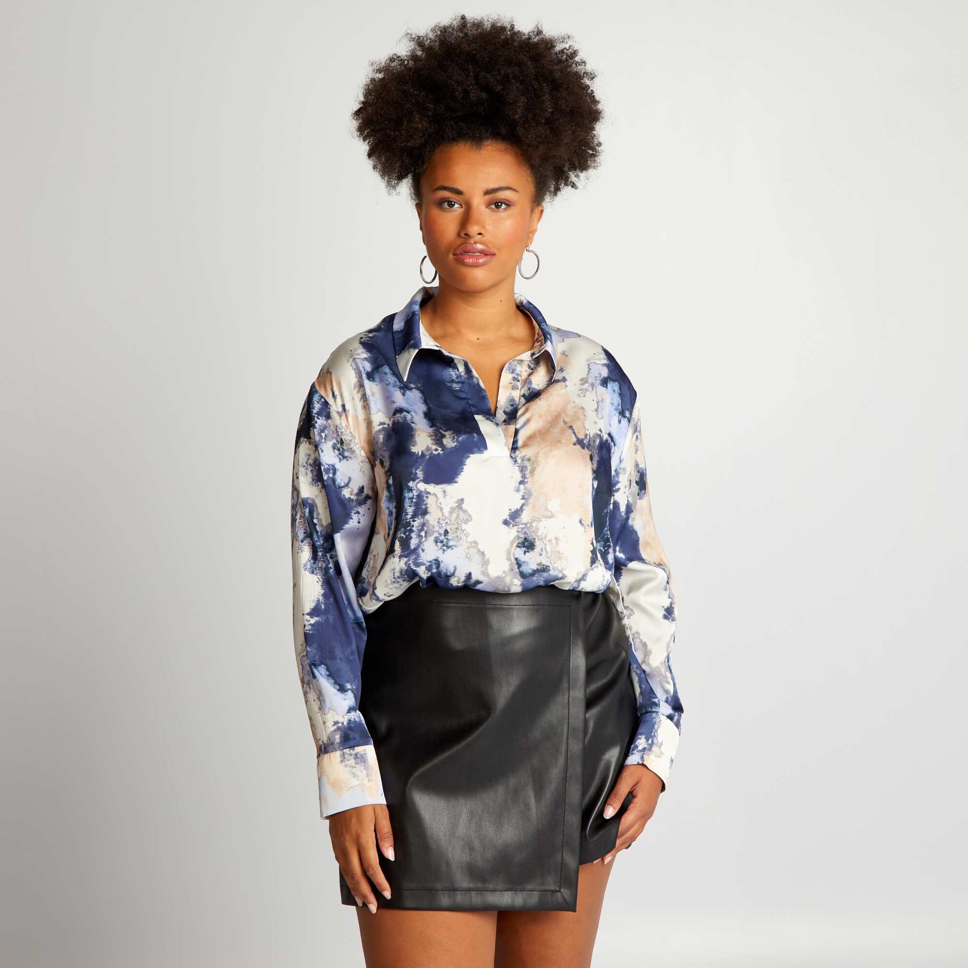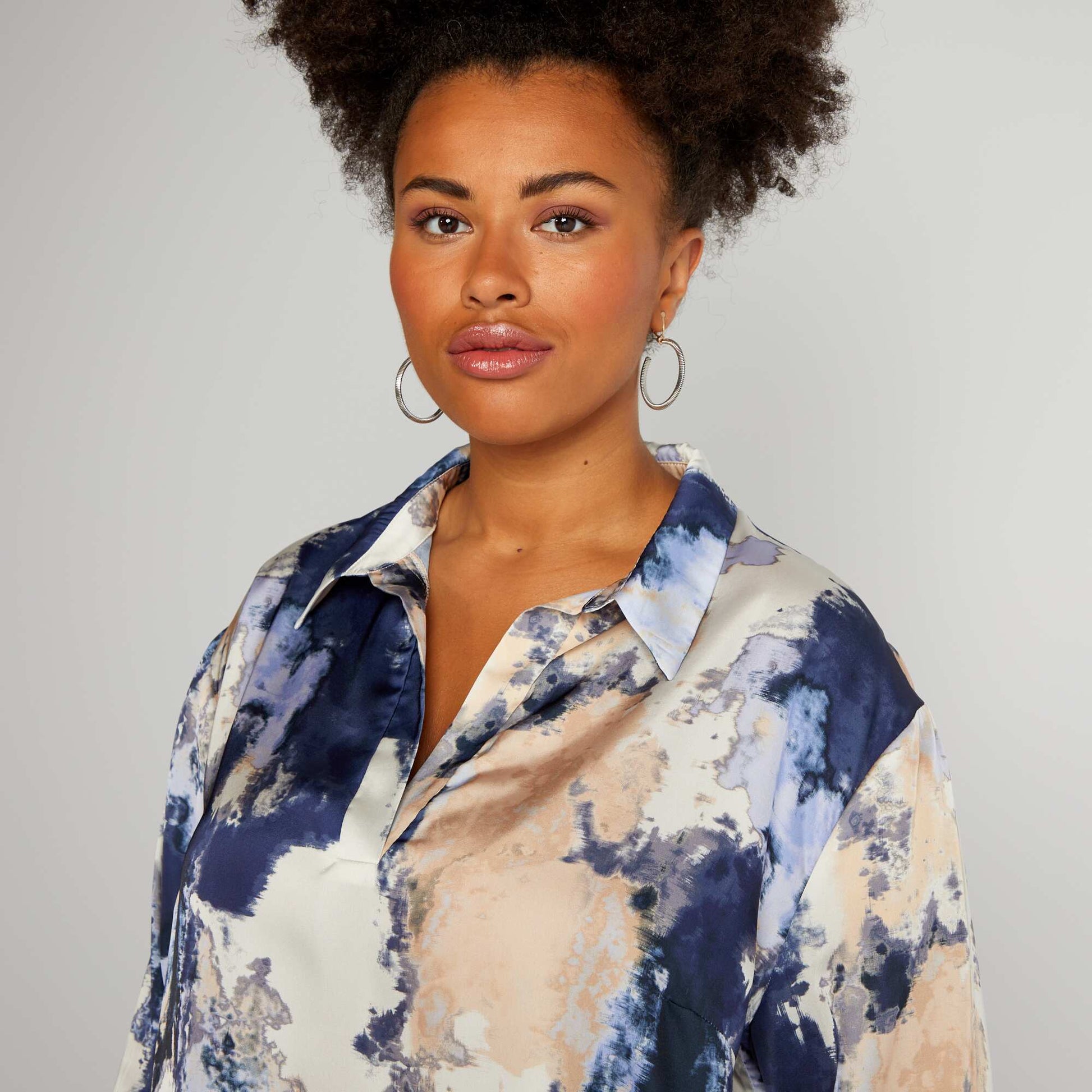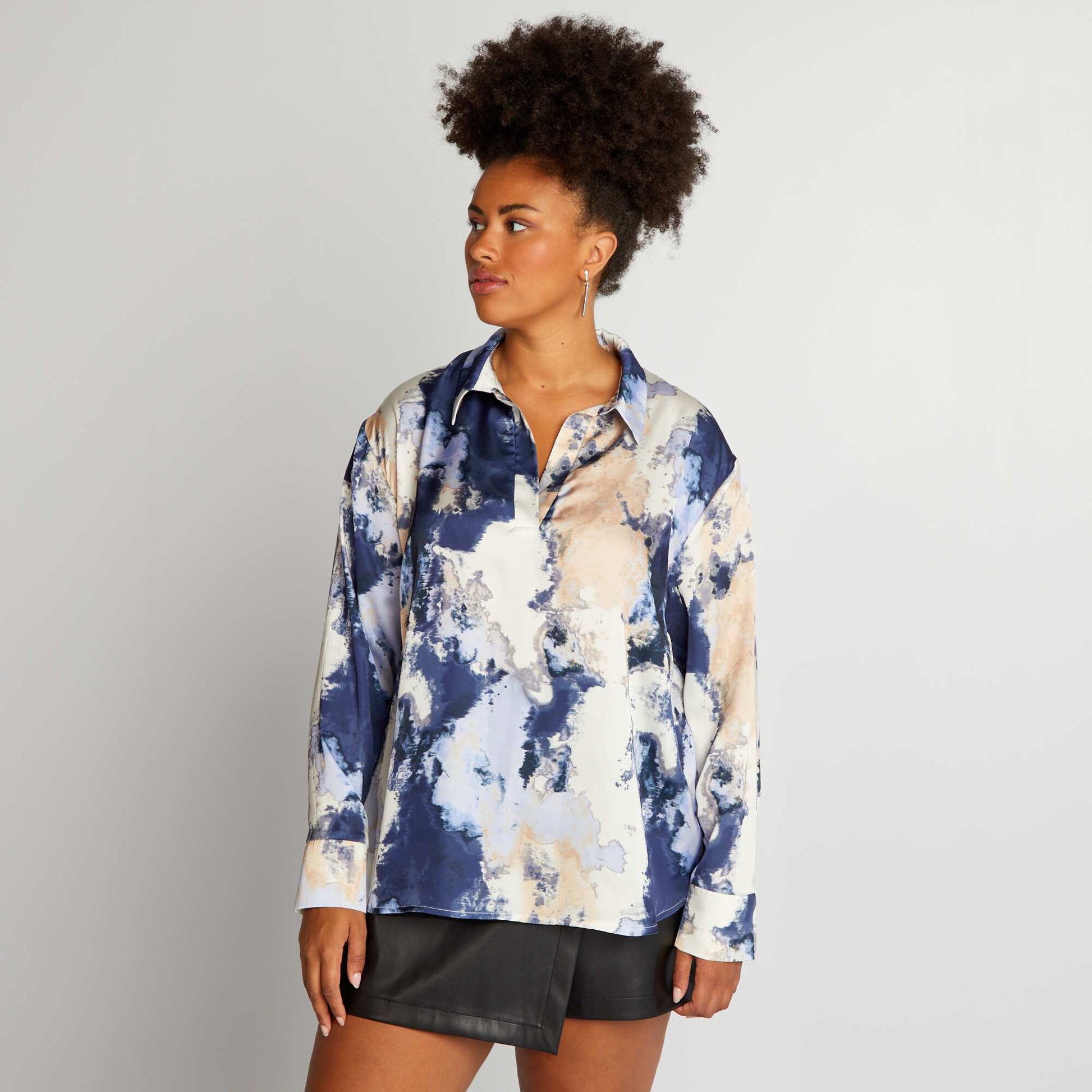Offrez du peps vos tenues gr ce cette blouse fluide color e ! - Une blouse fluide - Col italien - Manches longues - Effet tie and dye all-over - Longueur dos : 71 cm environ - Notre mannequin porte une taille XXL et mesure 1m82