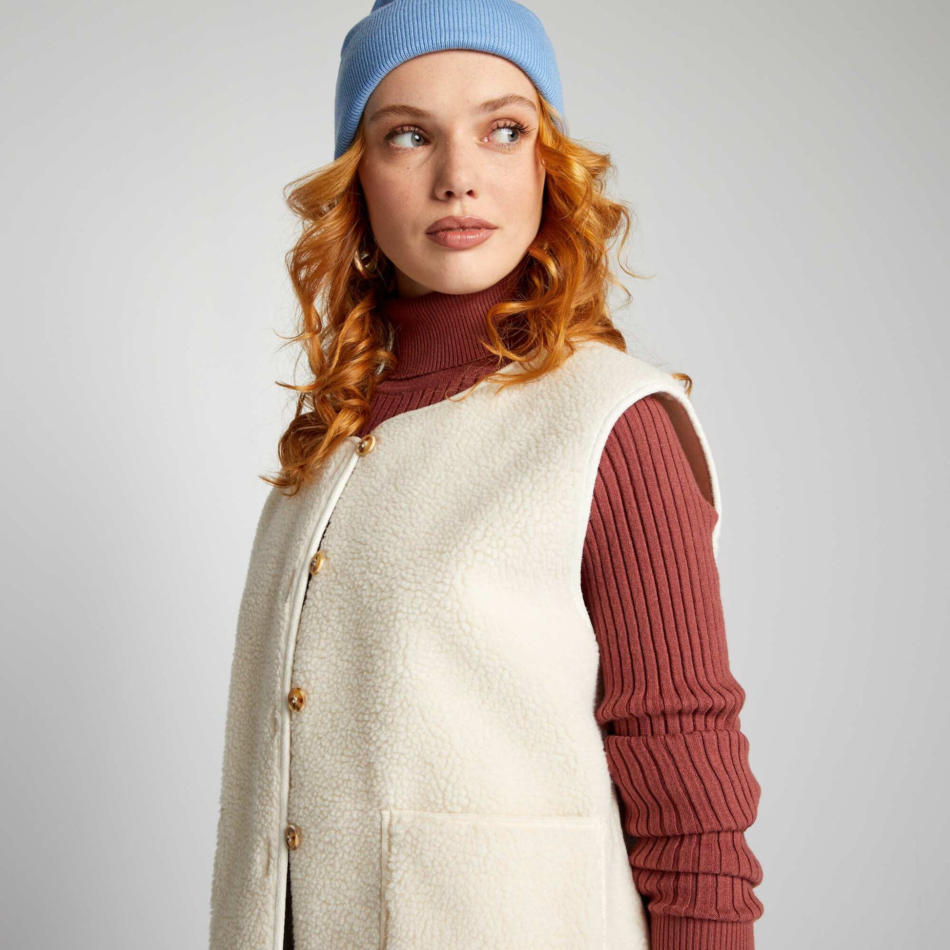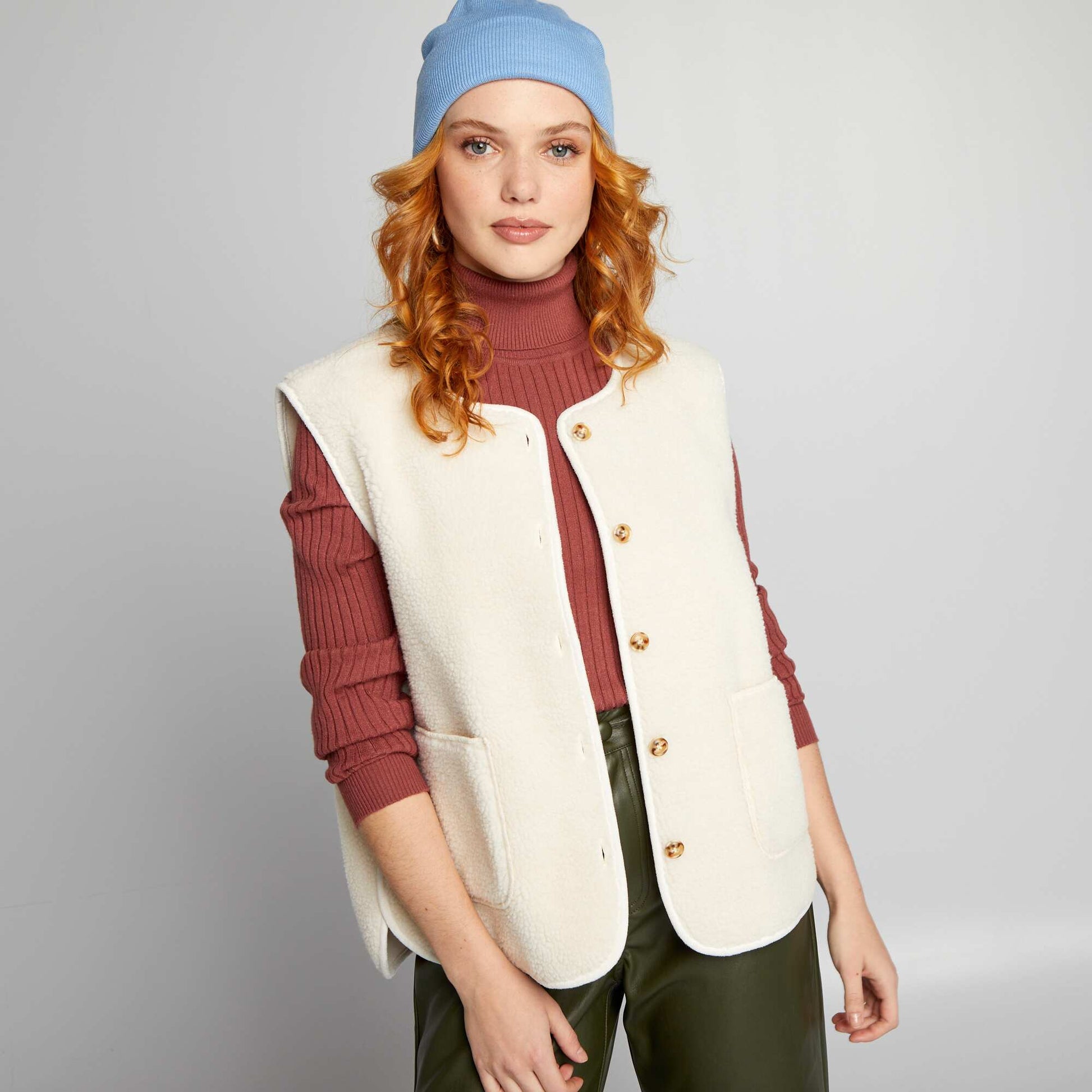 Veste porter la cool qui ira parfaitement avec un jean fit un peu large et un sweat oversize. - Veste en sherpa - Int rieur su dine - Col rond - Sans manches - Ouverture boutonn e - 2 poches plaqu es devant - Longueur du dos : 62 cm Notre mannequin porte une taille M et mesure 1m75