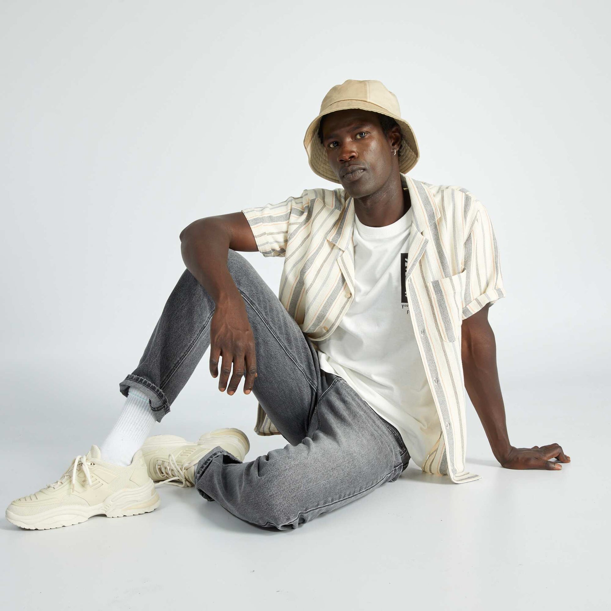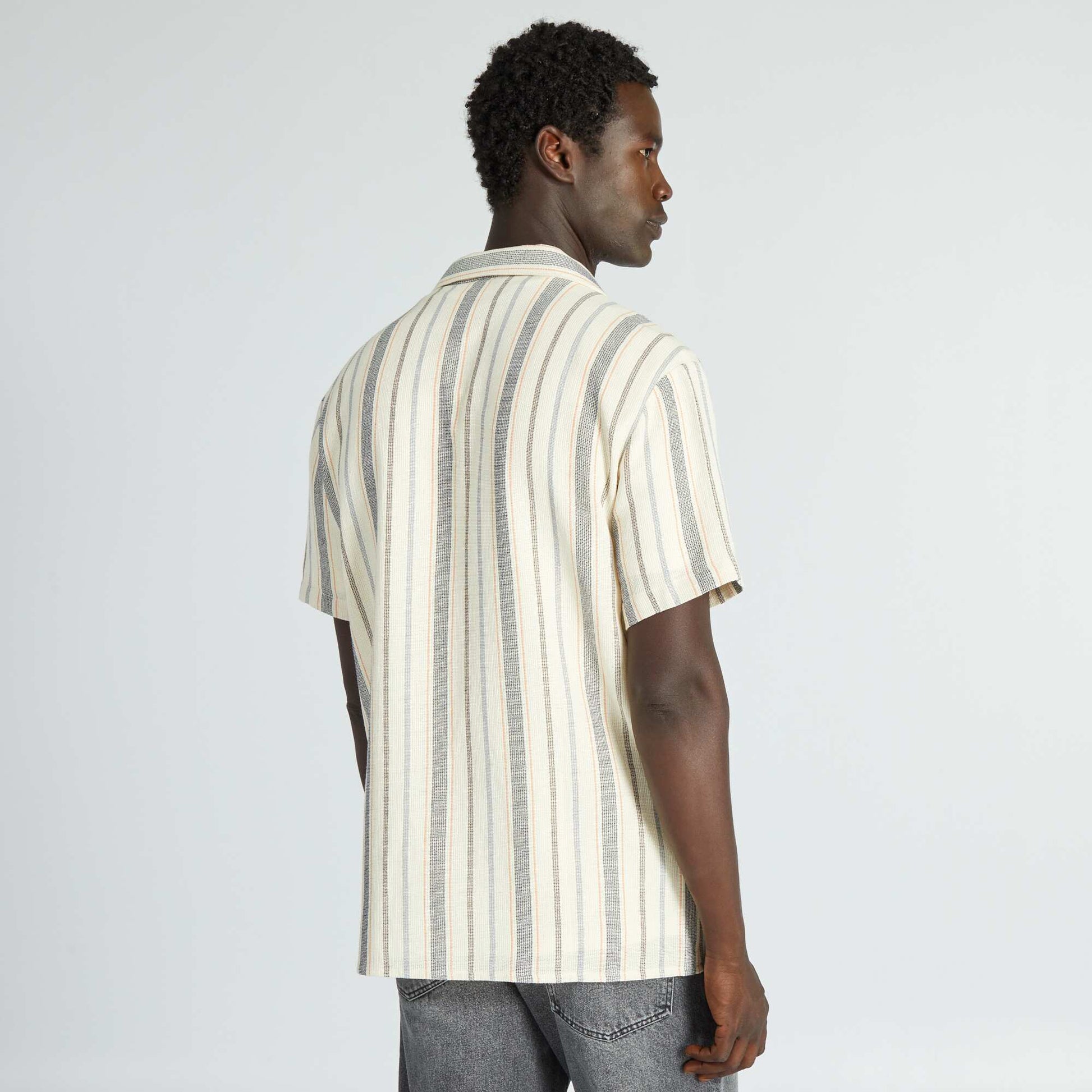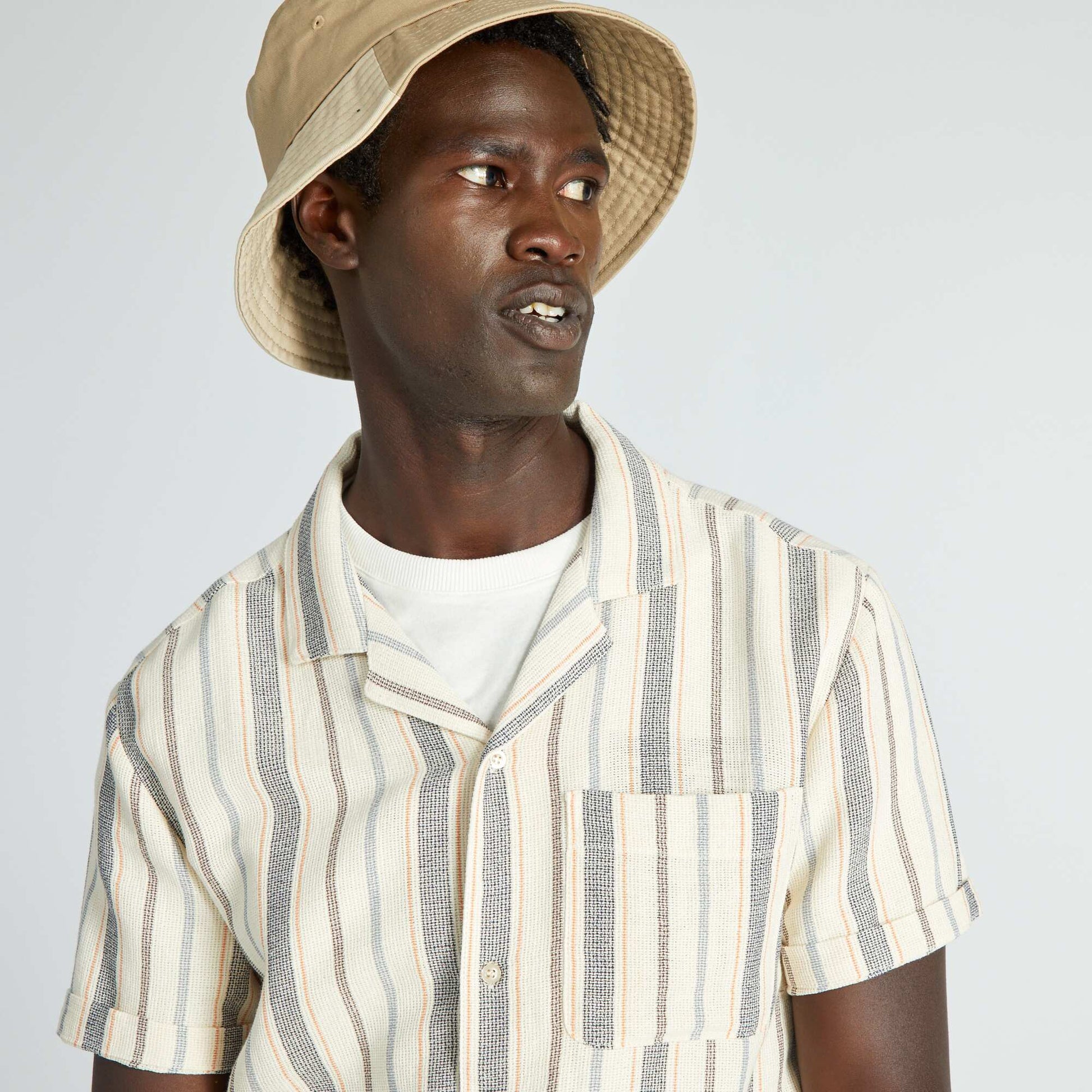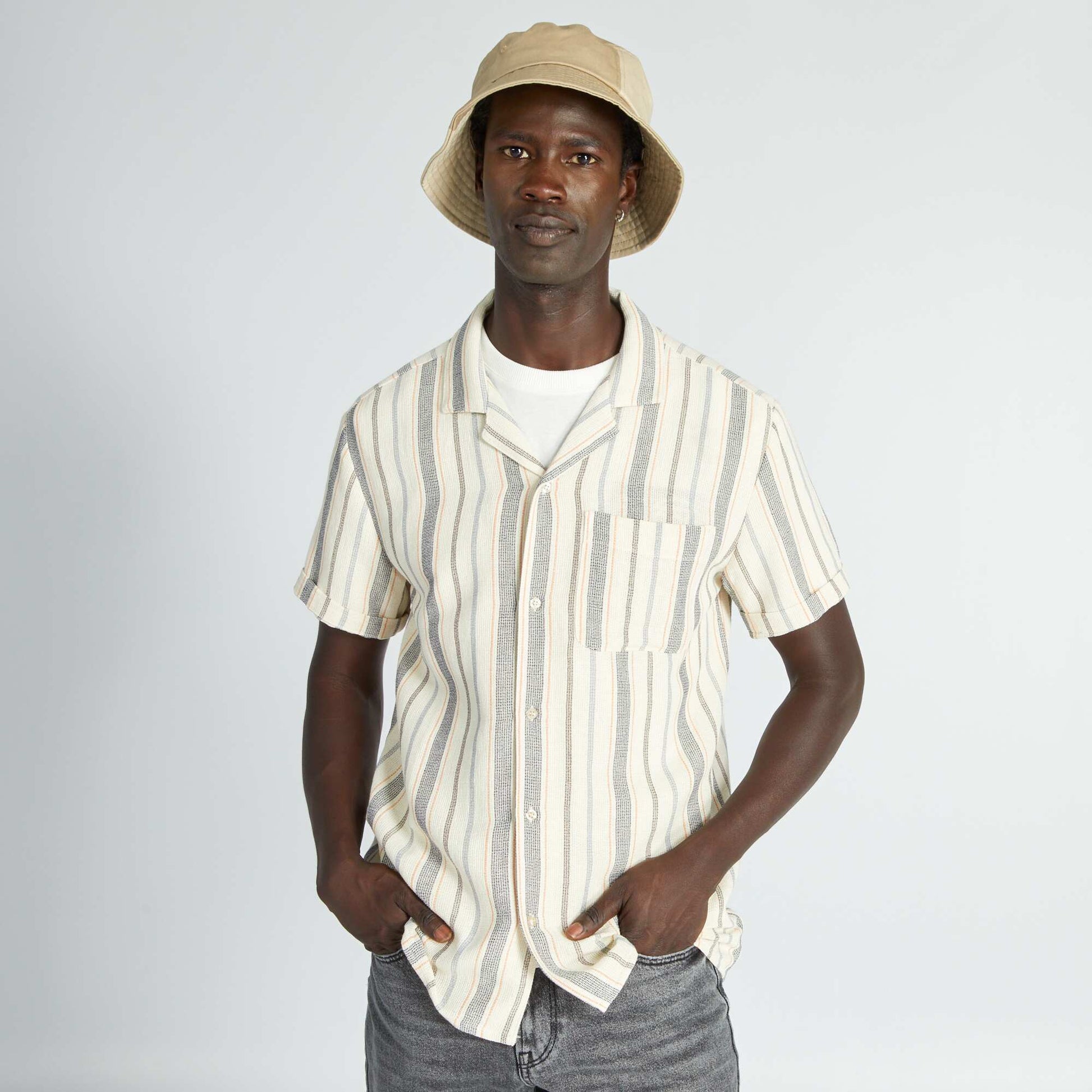 Une chemise fa on azt que, avec sa mati re fluide a r e et ses rayures color s ,-) - Chemise fluide et l g re - Regular fit / coupe droite - Col italien - Manches courtes - Ouverture boutonn e - Imprim rayures - Base arrondie - Longueur dos : 78 cm - Notre mannequin porte une taille M et mesure 1m88