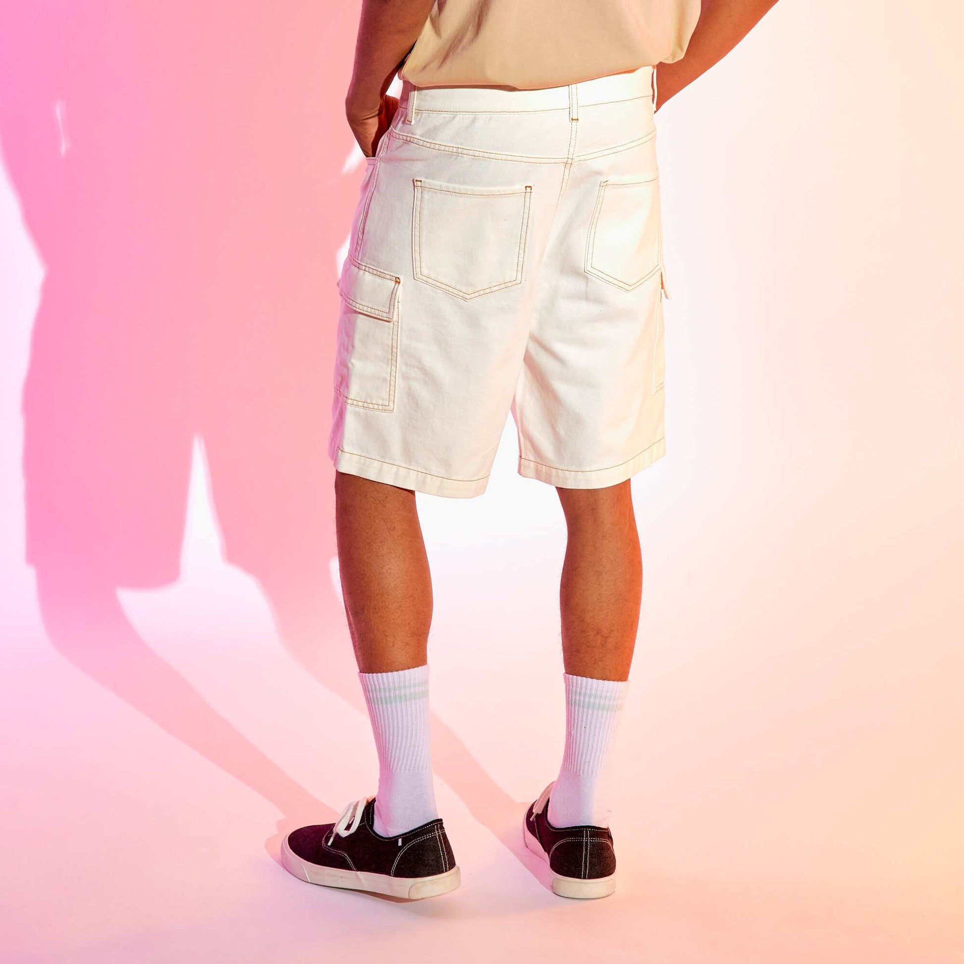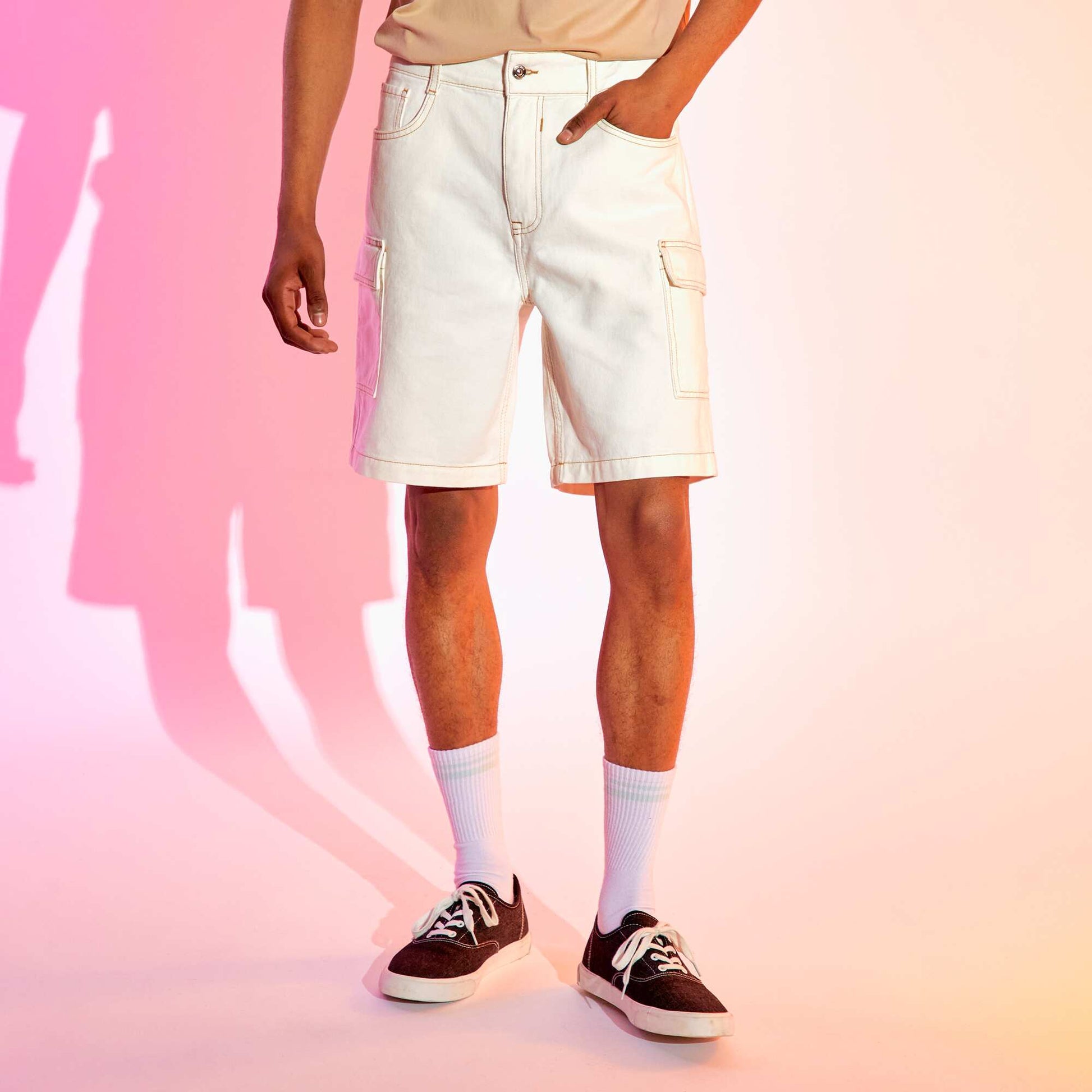 Un short en denim super styl ! - Short bermuda en denim - 100% coton - Col rond - Ouverture par boutons pressions - 2 poches devant + 1 poche ticket - 2 poches rabat devant - 2 poches plaqu es au dos - Surpiqures apparentes - Couleur unie
