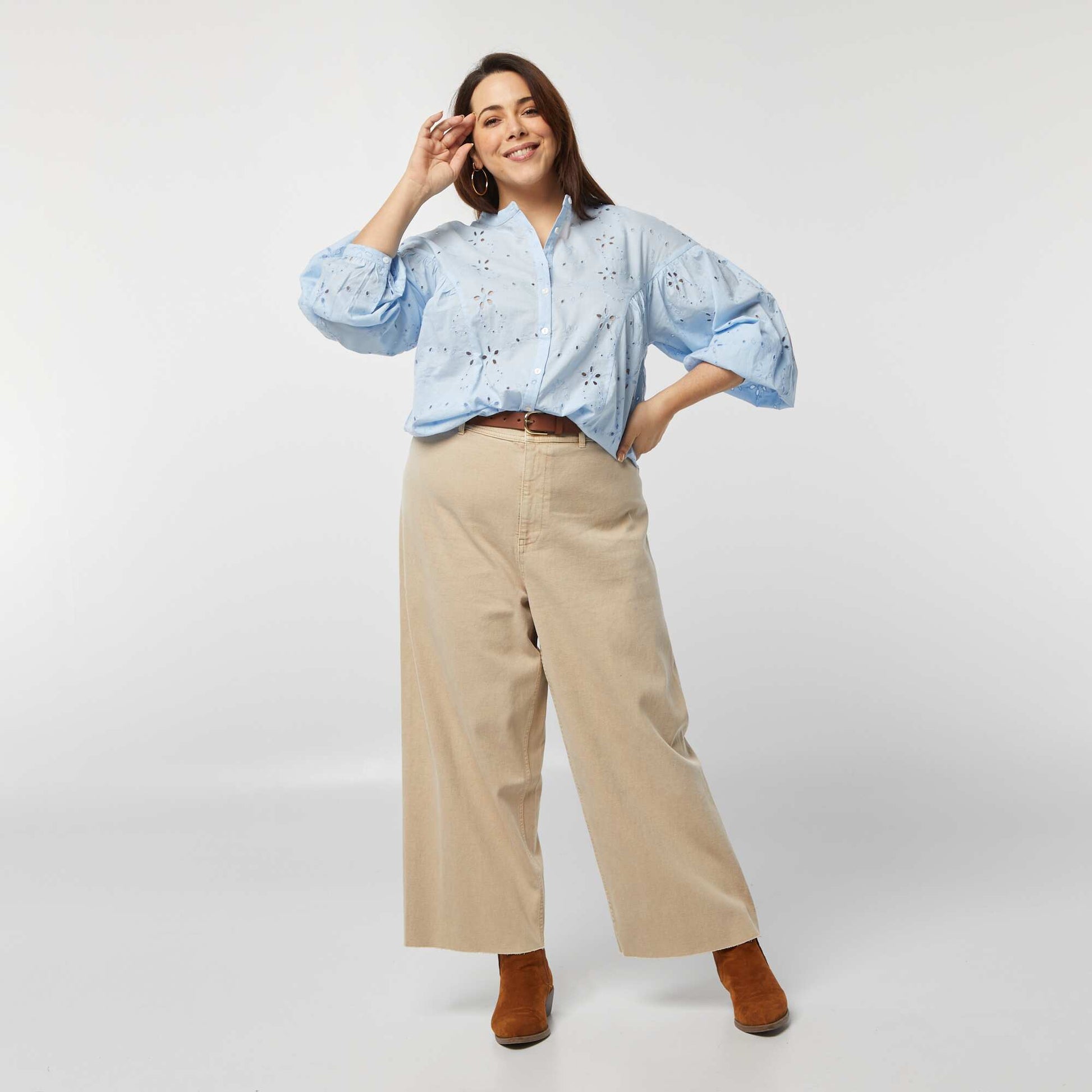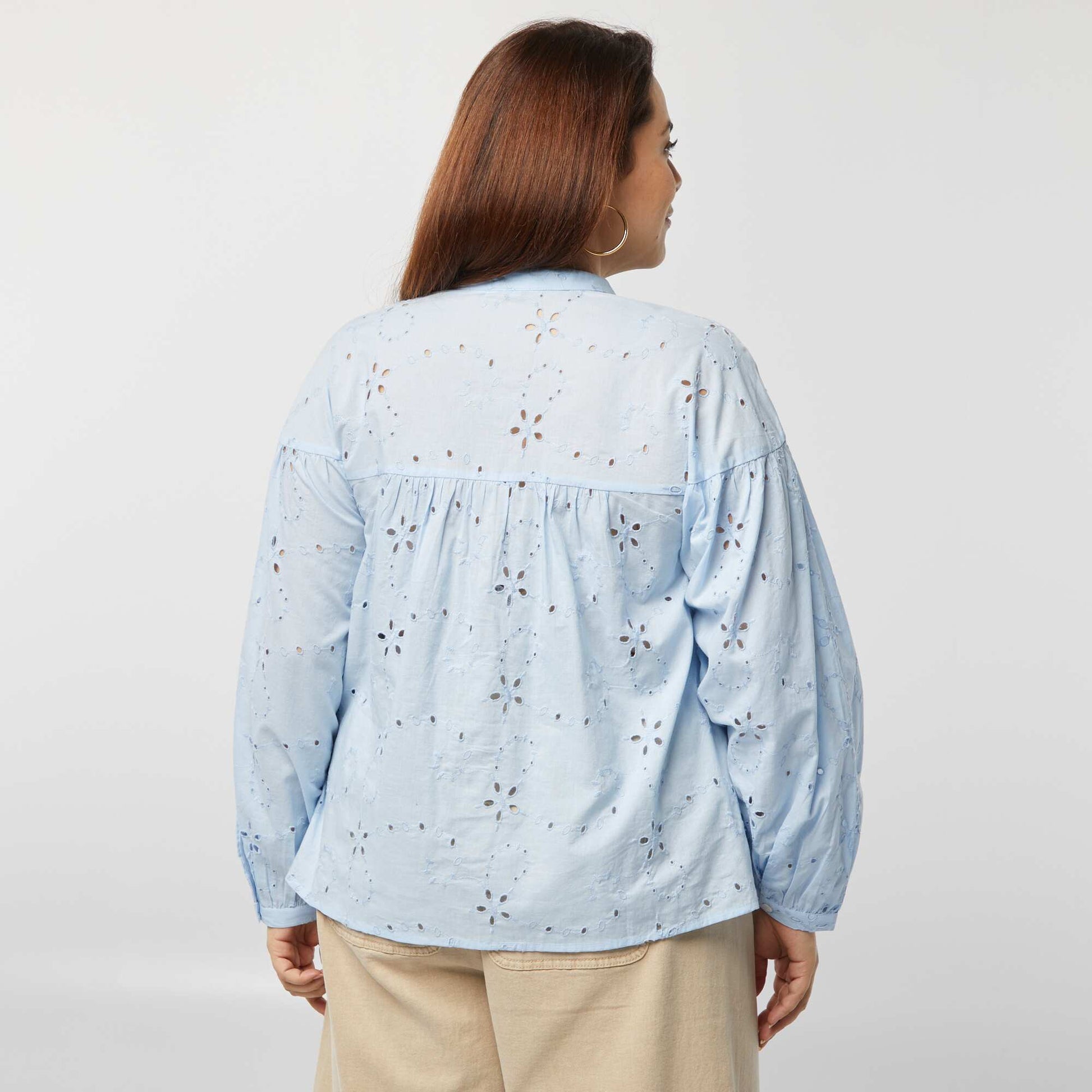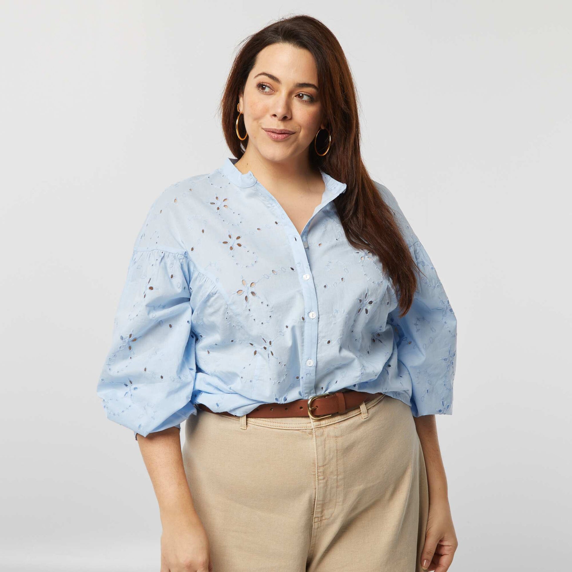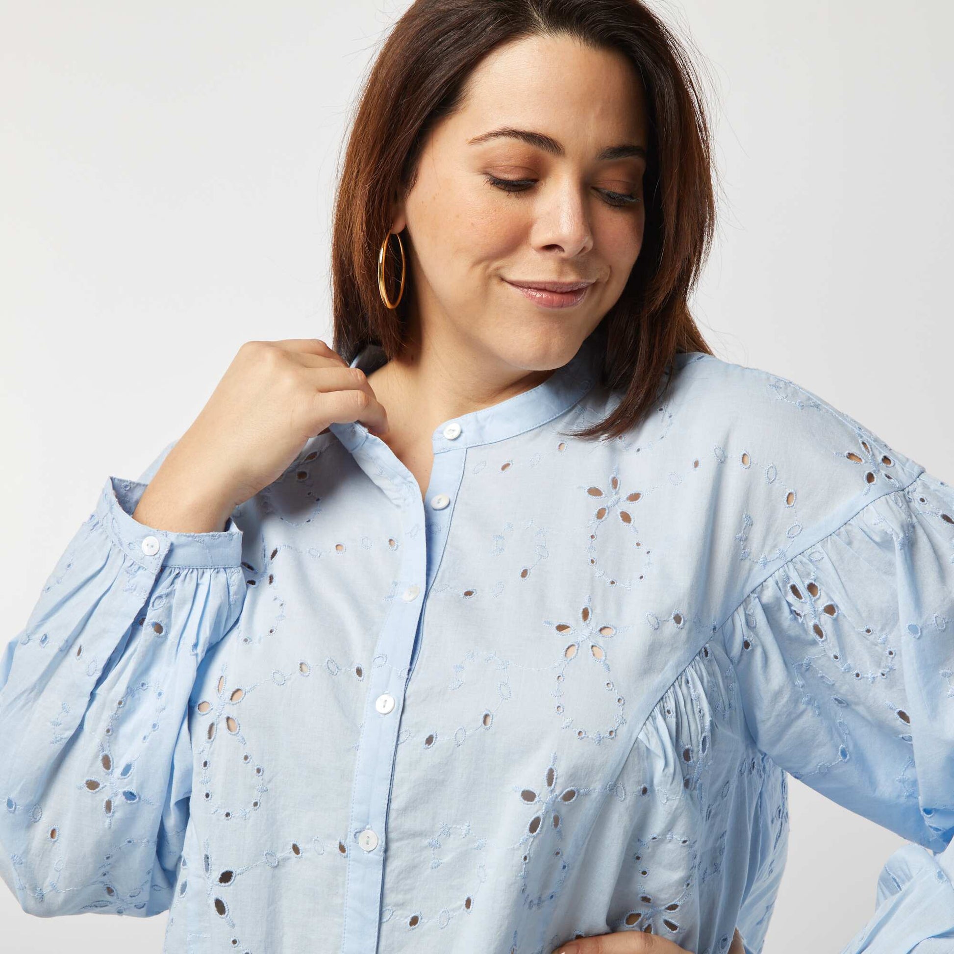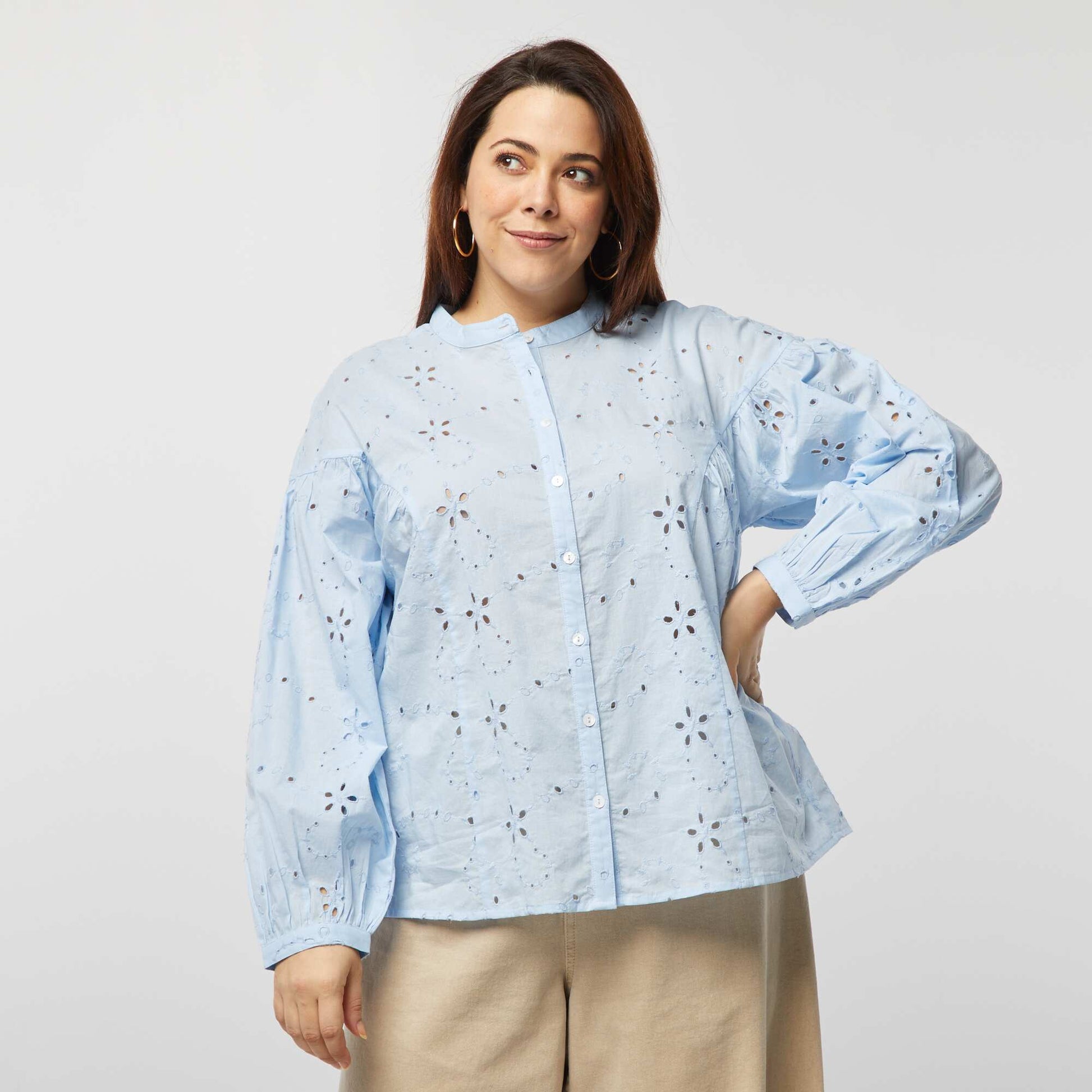 Chic, féminine, ajourée : cette blouse est parfaite pour une tenue habillée. - Blouse unie - En coton - Encolure ronde - Manches longues ballon - Ouverture boutonnée - Motifs brodés ajourés - Effet plissé sur les côtés - Longueur dos : 72 cm environ - Notre mannequin porte une taille XL et mesure 1m75