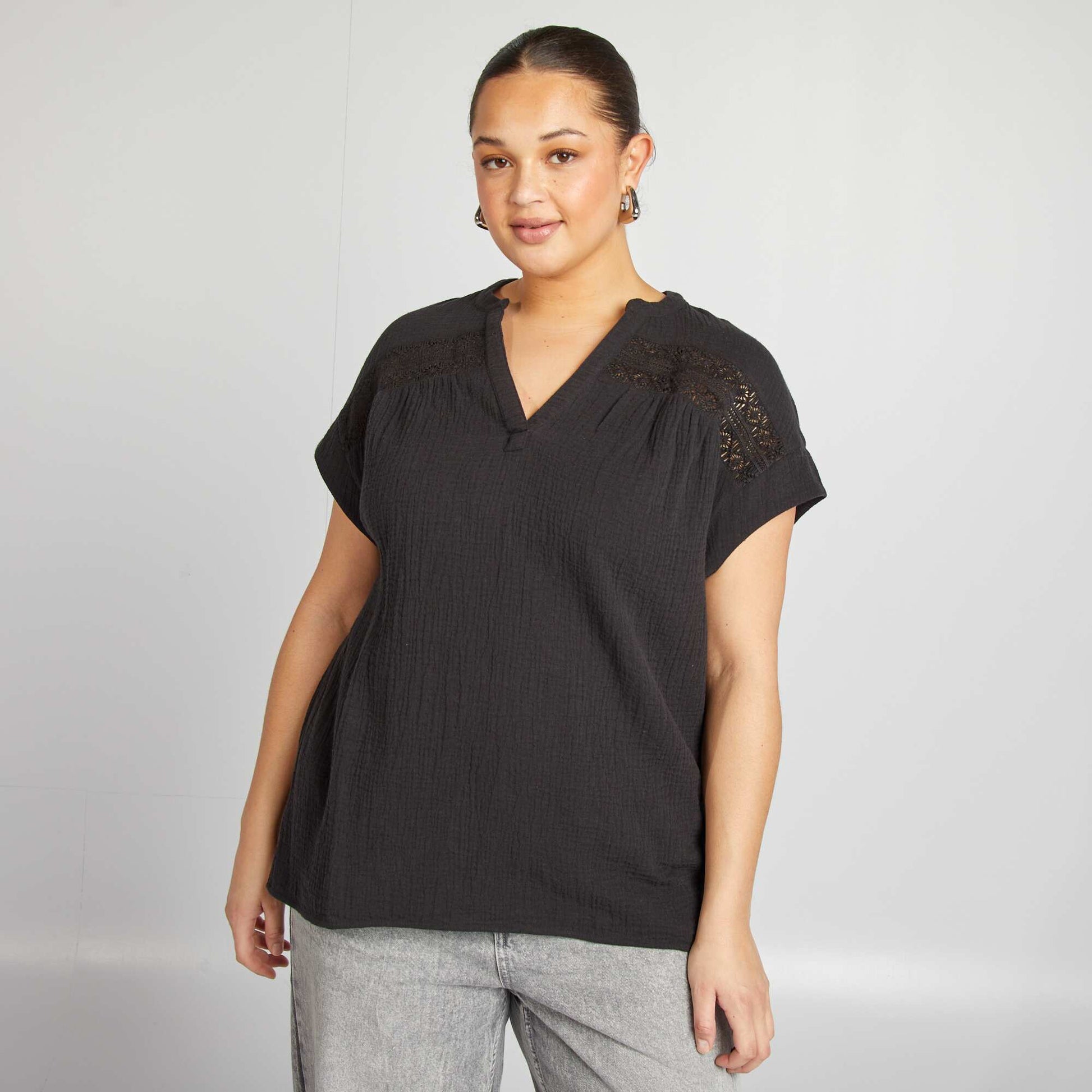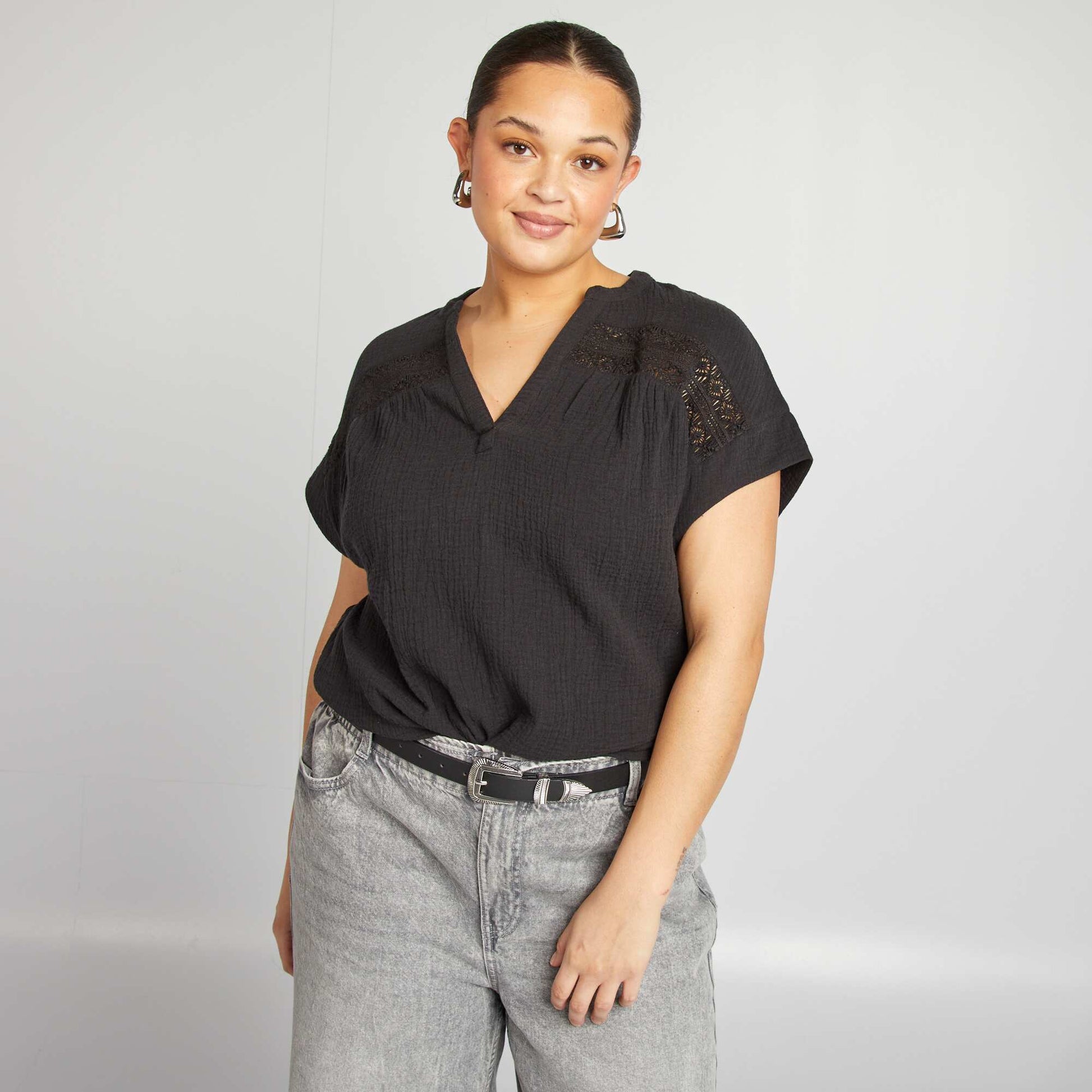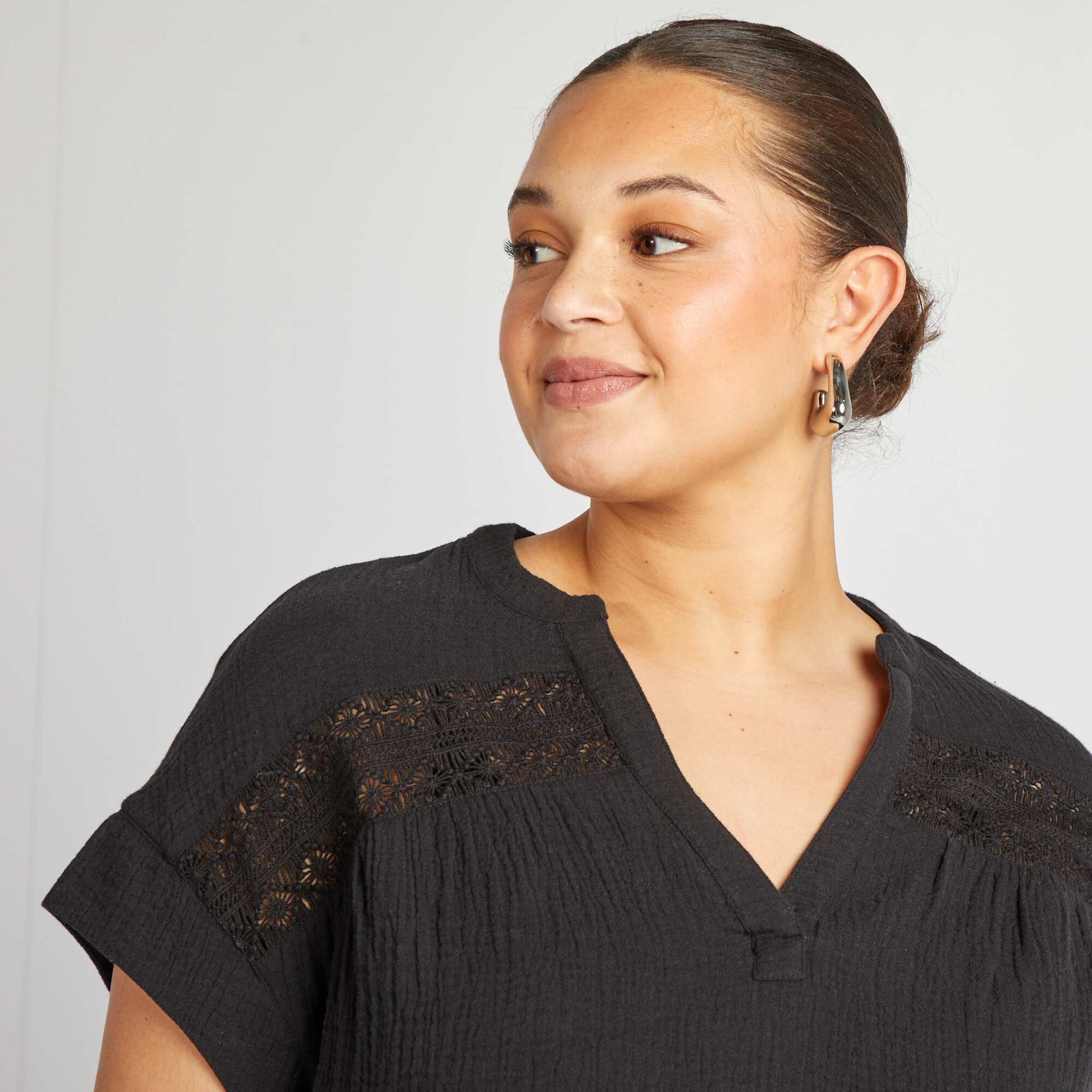 Une blouse en double gaze de coton avec de belles broderies fantaisies devant ! - Blouse - En double gaze de coton - Col V - Manches courtes - Broderies fantaisies devant - Couleur unie - Notre mannequin porte une taille XL et mesure 1m75